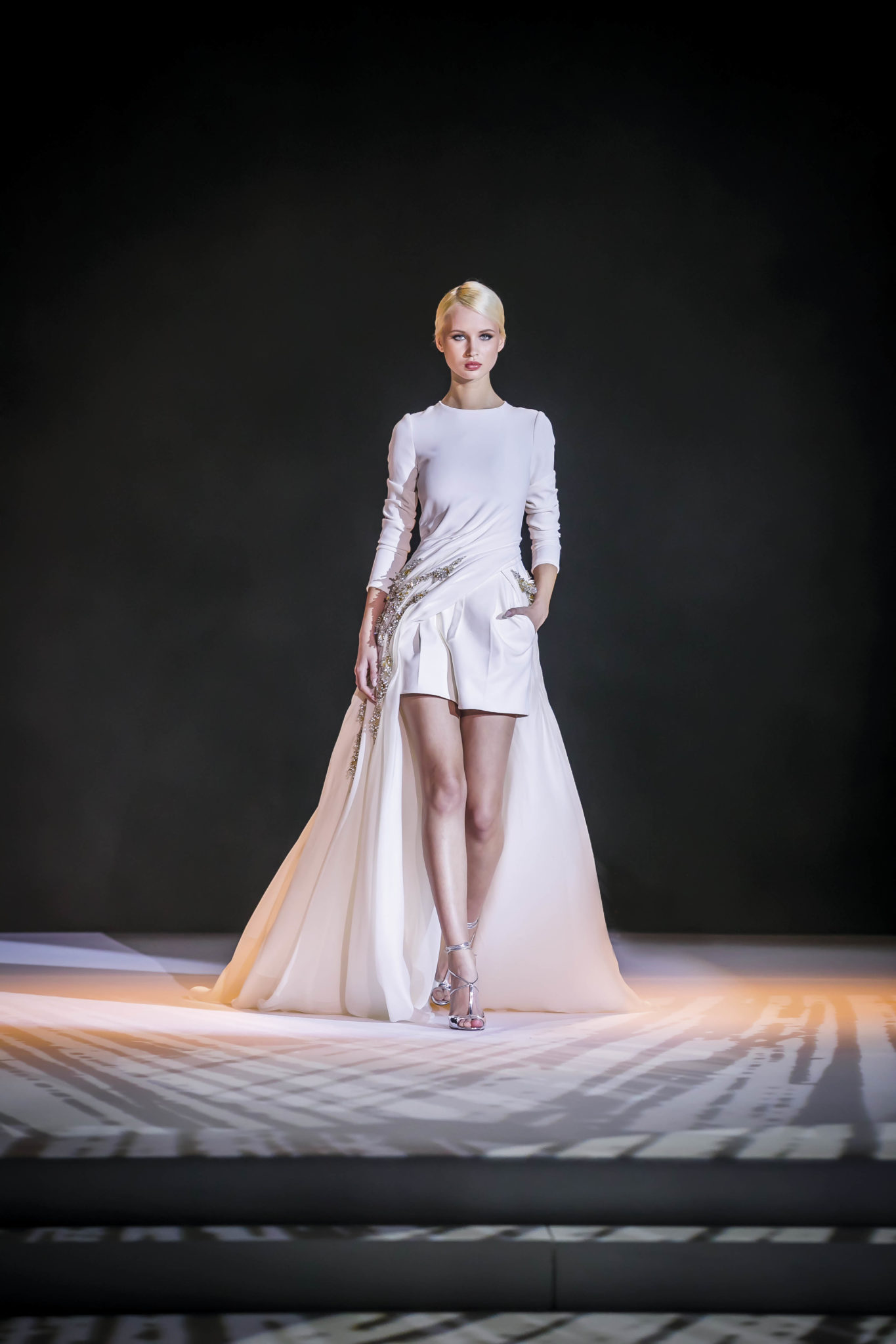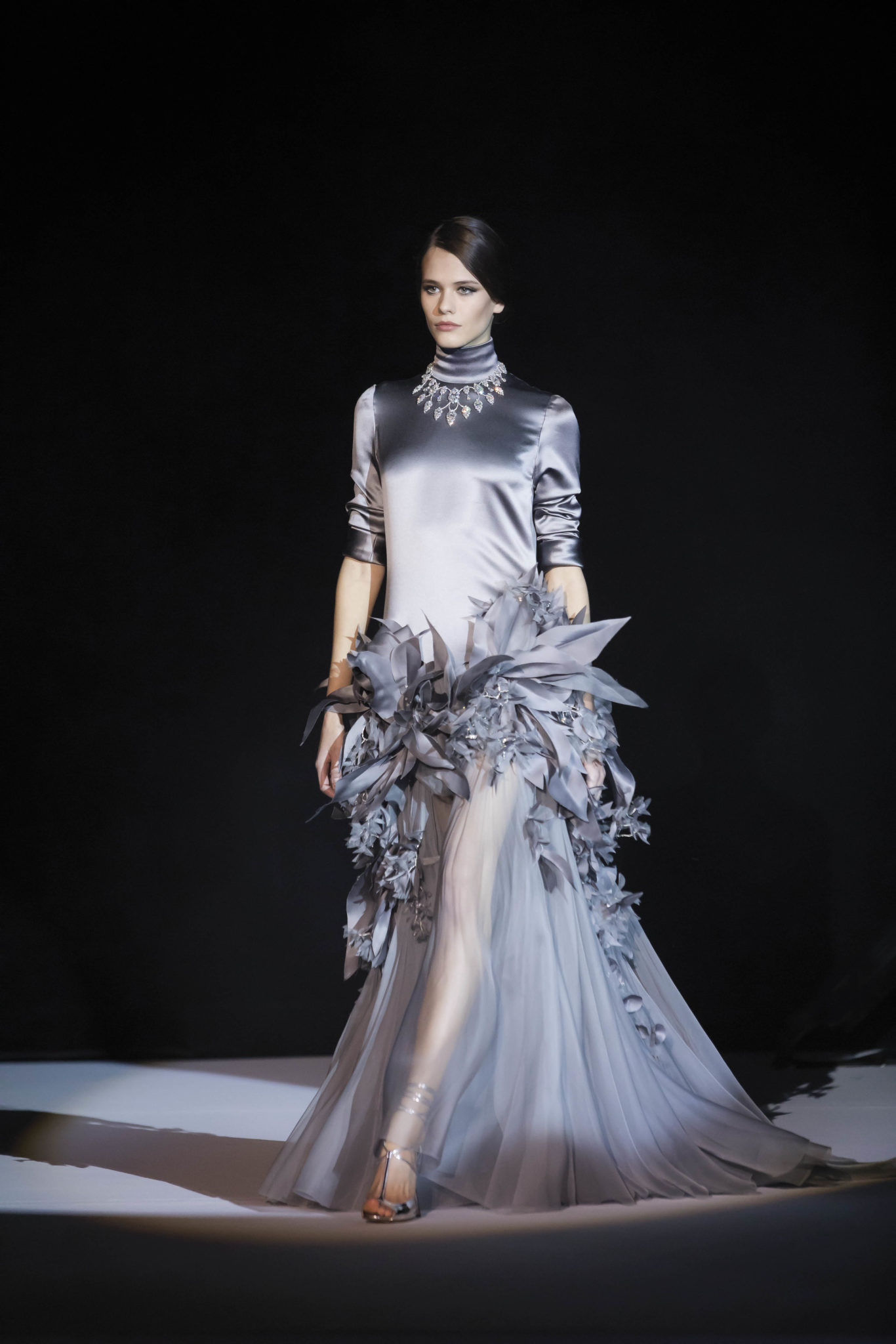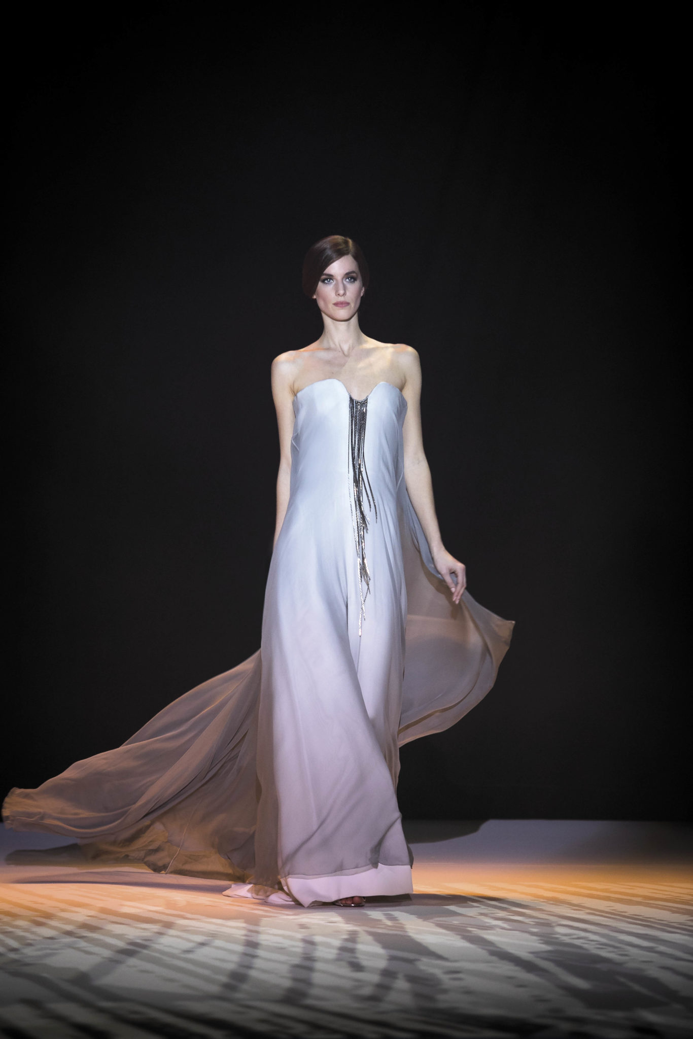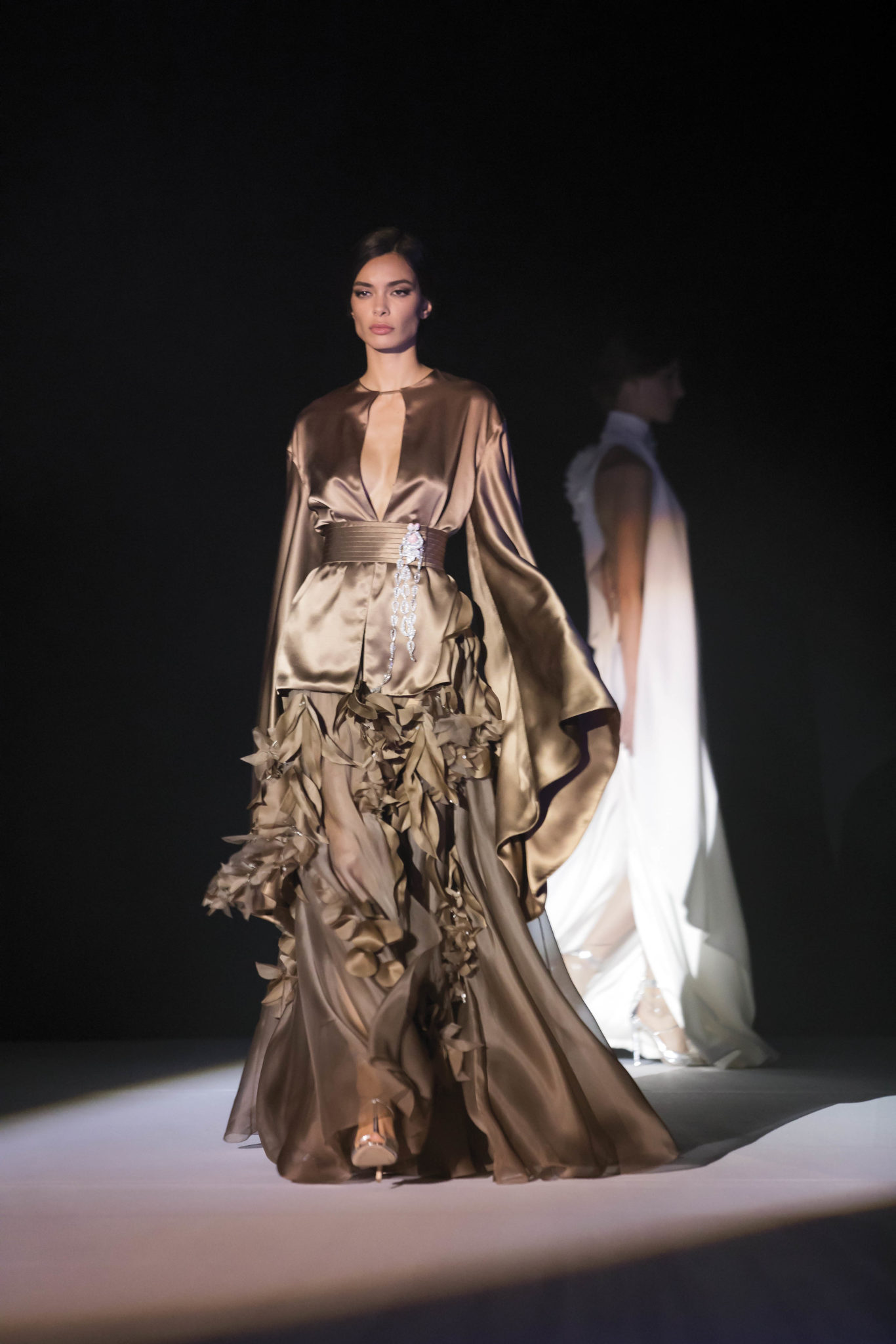 Matière phare de la saison le crépe satin. En robe longue rose poudré au buste crinière, en tunique caramel ou gris perle, en robe-écharpe sable, il met le corps en lumière. Les teintes sont douces, blanches, sablées, ambrées et les broderies sont des reflets de métal argent sculpté ou des feuillages et branchages en 3D