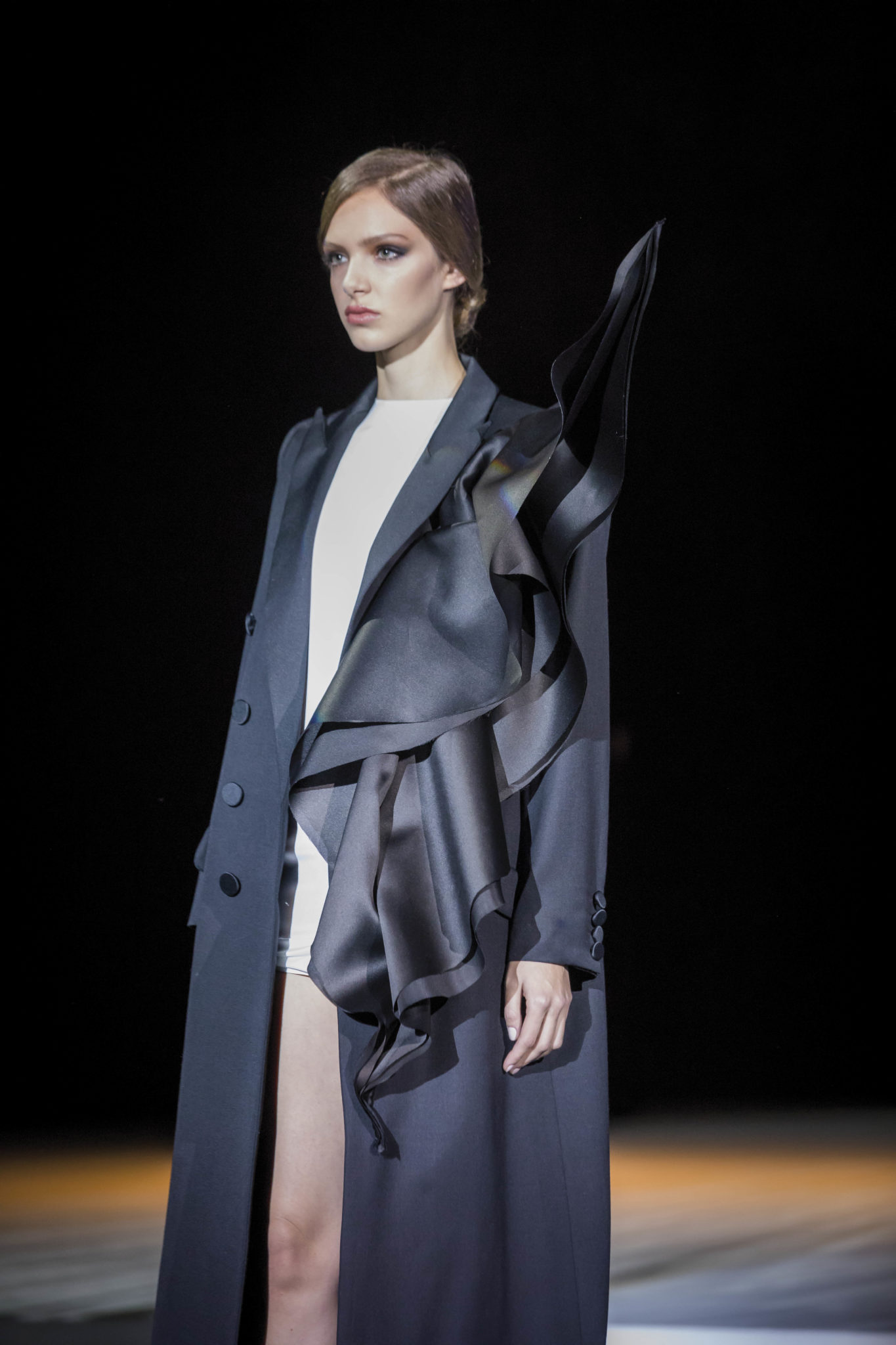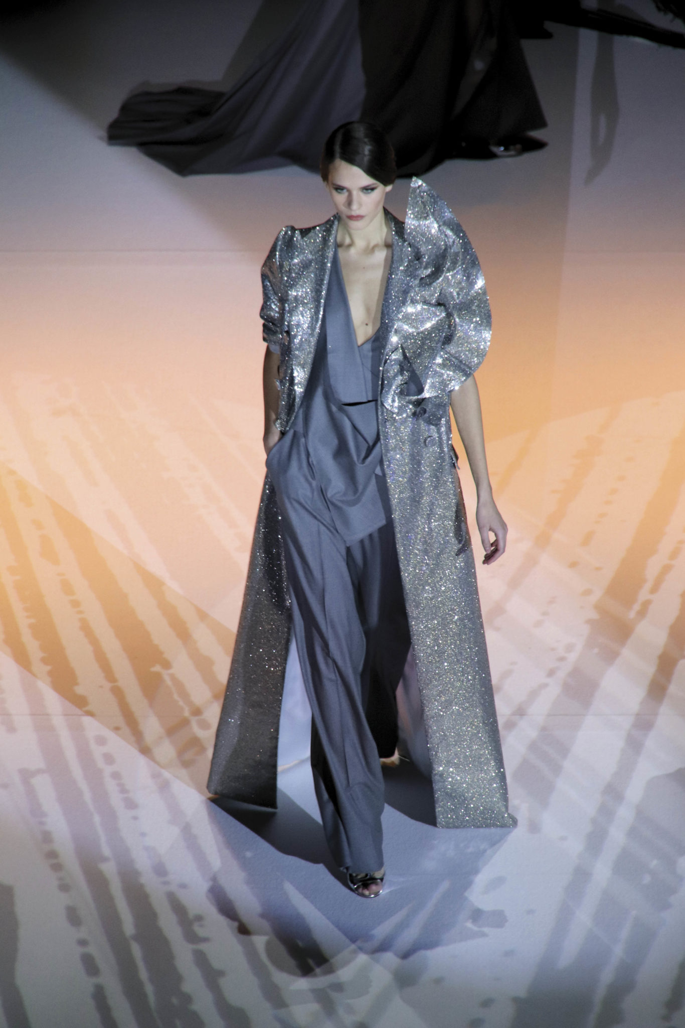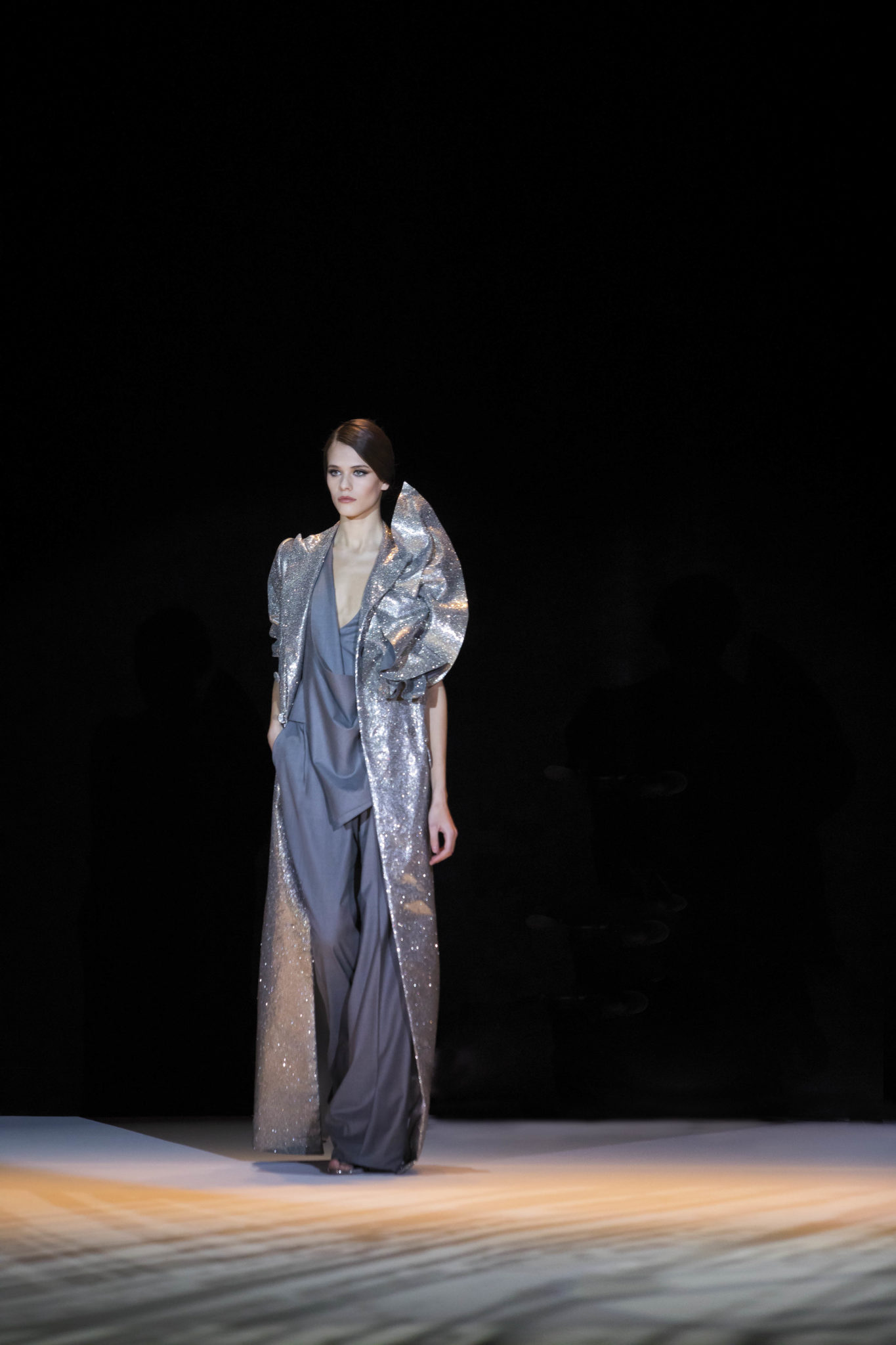 L’ampleur du mouvement affirme la décontraction et le confort. Des manteaux longs et oversize en lamé platine ou en grain de poudre noir illustrent une certaine androgynie.