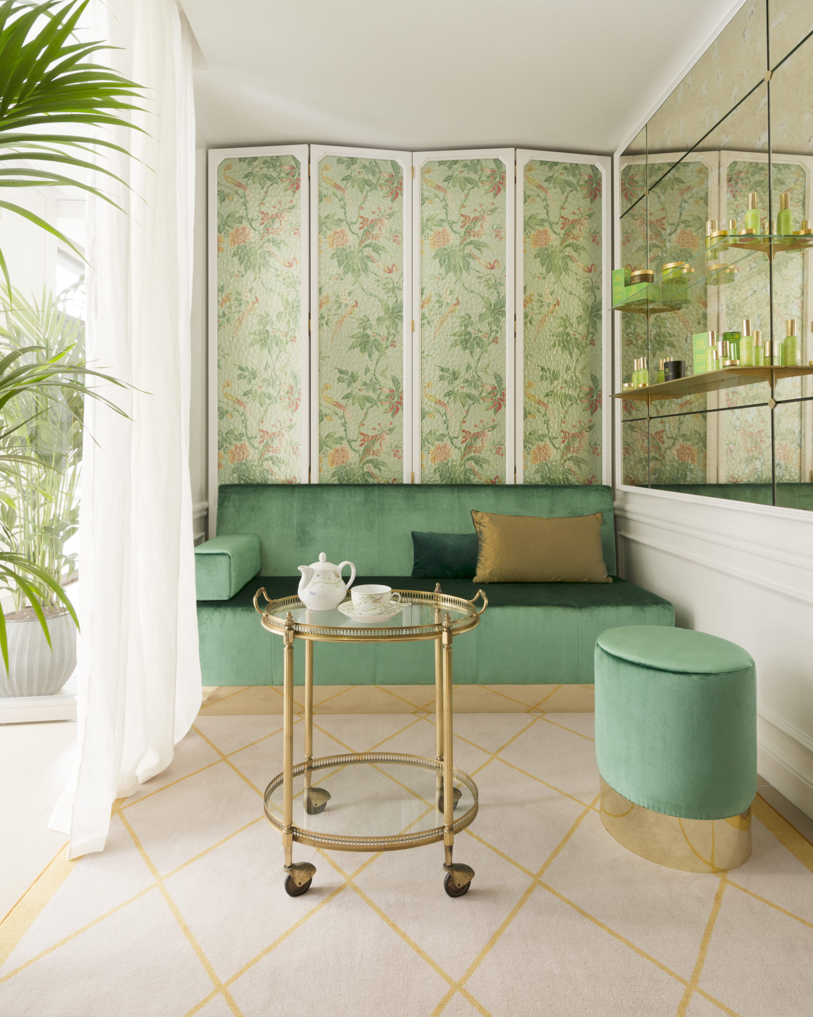Tout commence dans un espace créé sur mesure par Tata Harper au cœur du Spa le Bristol By La Prairie. Un décor à l’image du Bristol Paris, joyau Oetker collection, et de la marque de soins bio Tata Harper, frais, naturel et élégant. Dans ce boudoir aux nuances d’or et de verts, décoré de boiseries laquées, de velours et de grands miroirs, la déconnection de l’esprit est immédiate. Le moment parfait pour s’occuper de sa peau.
