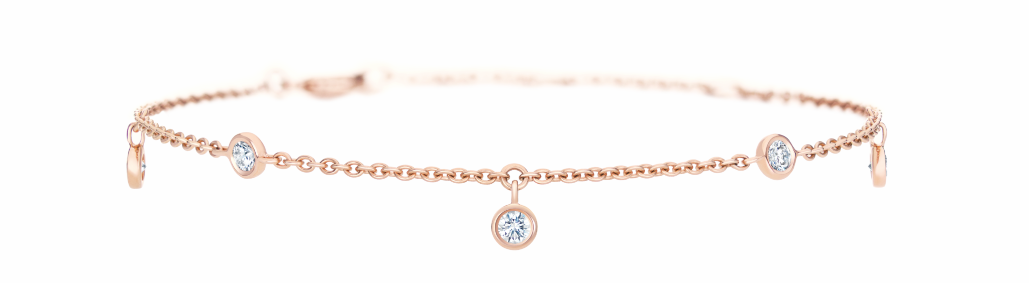 Cette sophistication subtile se retrouve dans le Pendentif Dewdrop One Diamond en or rose, le Bracelet Dewdrop One Diamond ainsi que le Bracelet Dewdrop Five Diamond en or rose. Tout en fluidité, chaque diamant de taille brillant serti clos semble danser à la surface de la peau.