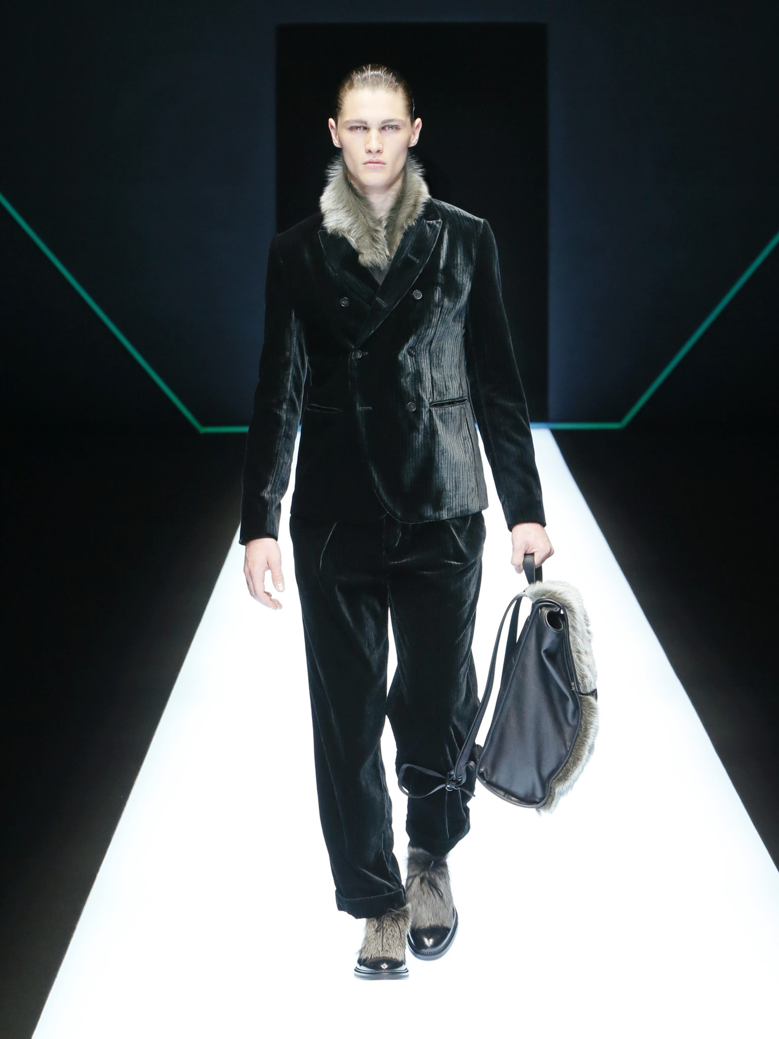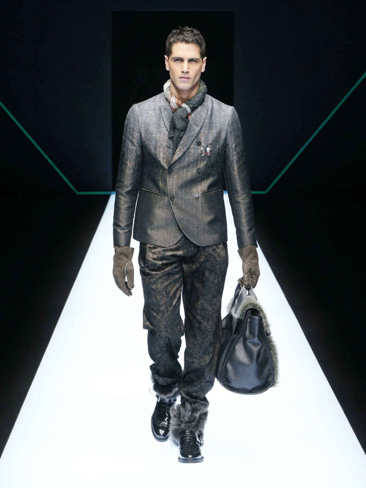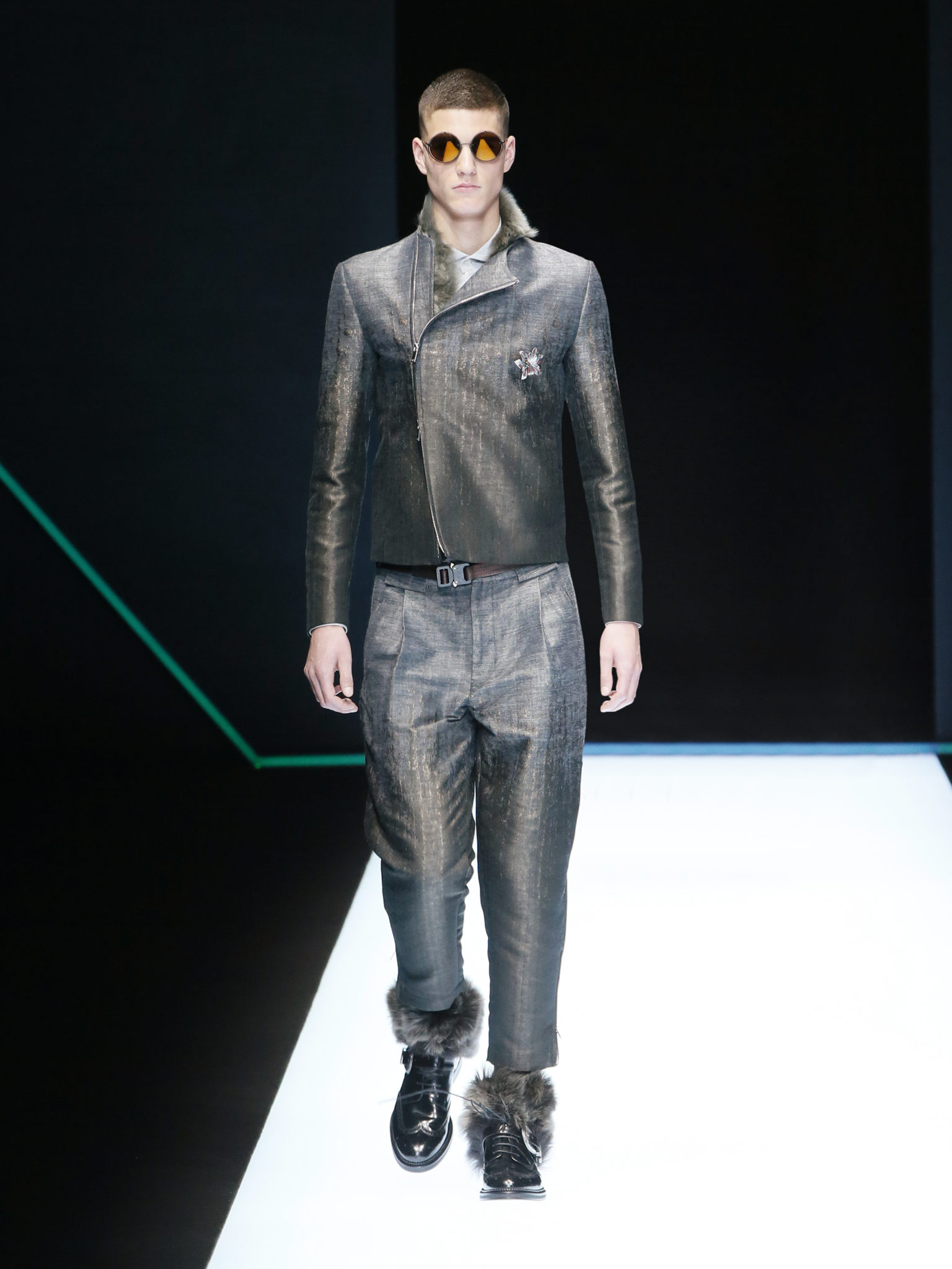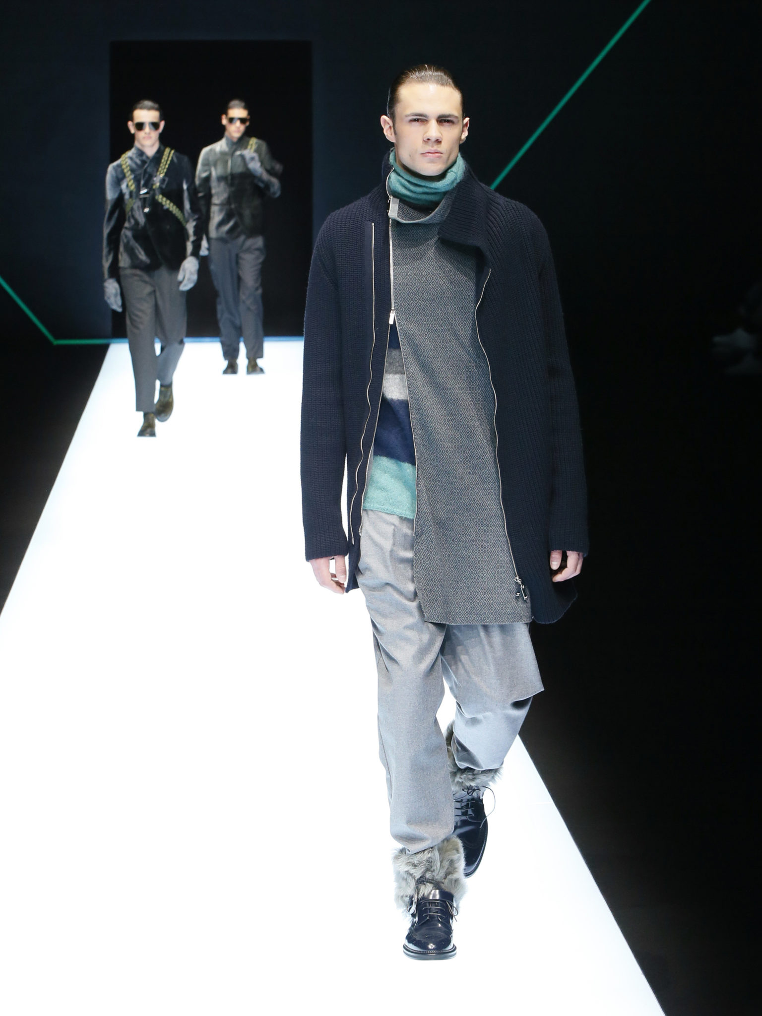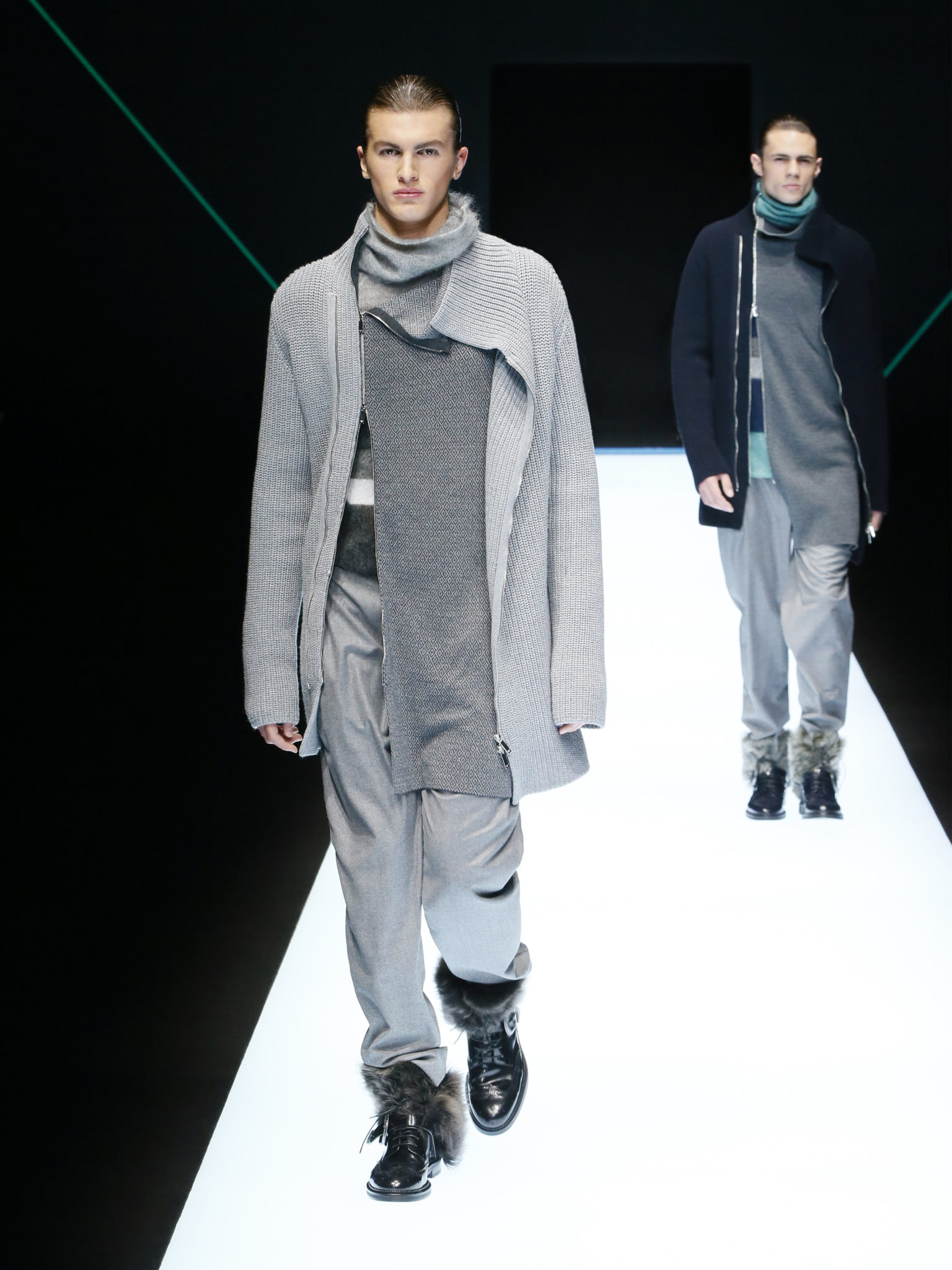La collection a un esprit urbain et décisif, avec une idée de nouvelle élégance : précieuse mais pas frivole. Le vestiaire urbain a un ton dynamique, combinant l’innovation des lignes et des matières. La silhouette svelte et nette se traduit par des vestes de costumes à double boutonnage et petites épaulettes, portées avec des pantalons larges, un trench-coat en laine à boucles techniques, et des bombers style kimono sans coutures. Le « outerwear » rend hommage au monde de la randonnée en montagne et aux activités outdoor, avec des manteaux en peau de mouton retournée et des vestes en peau de chèvre.
