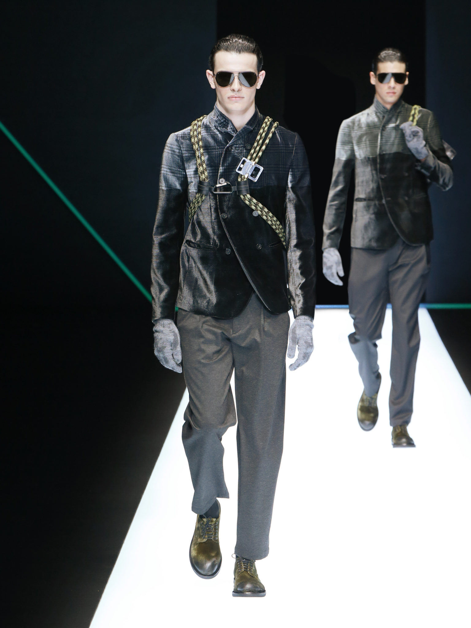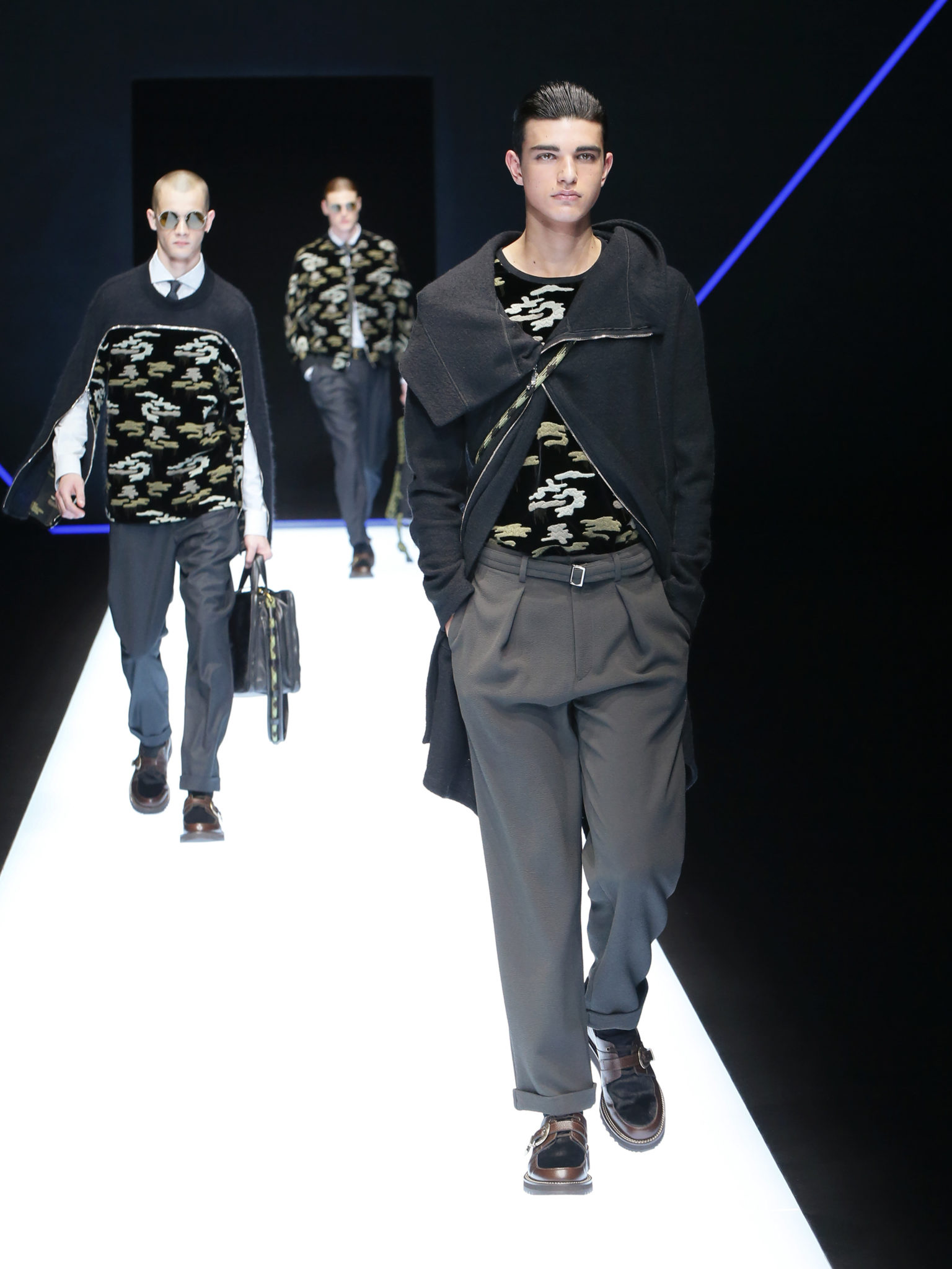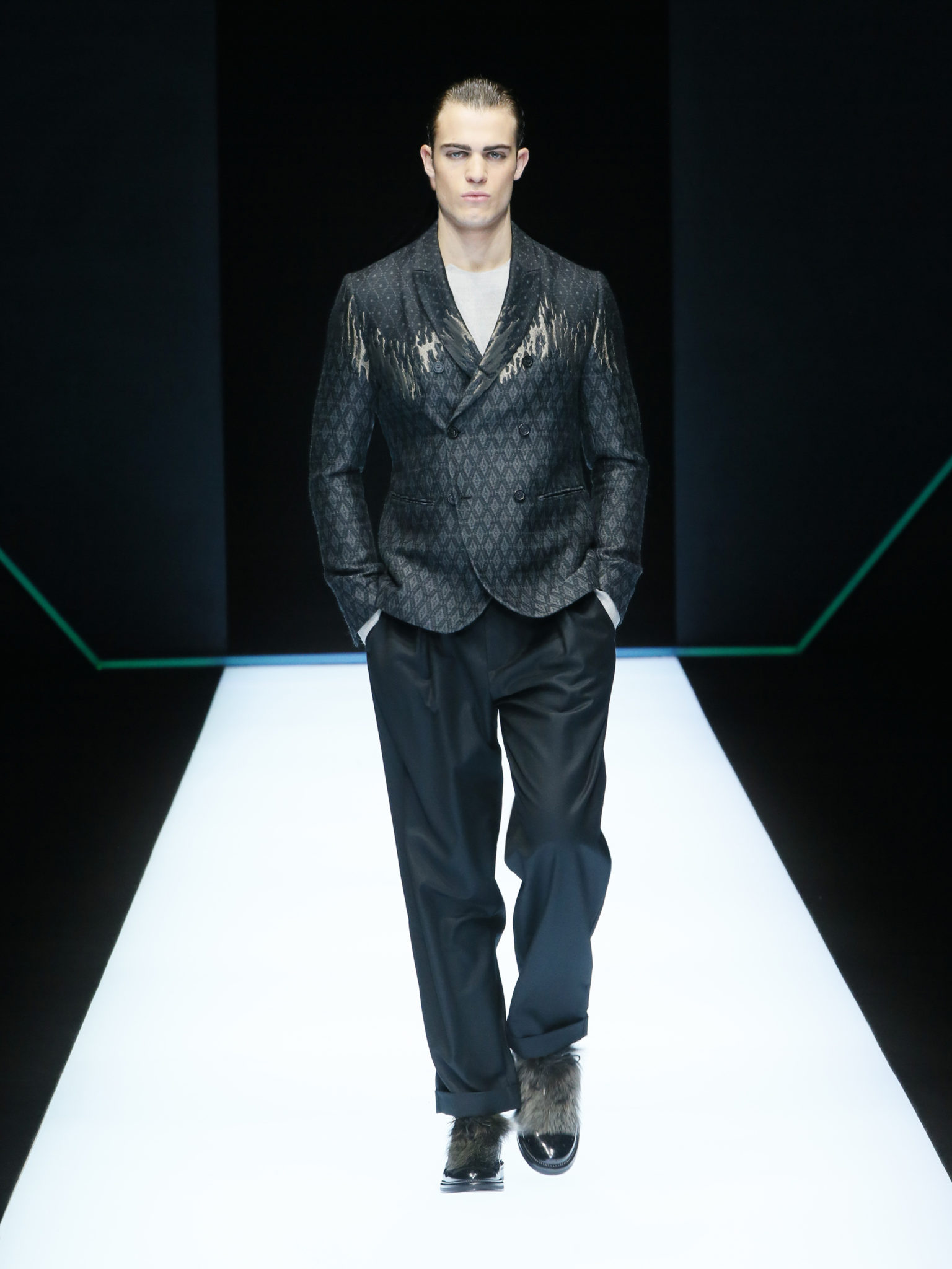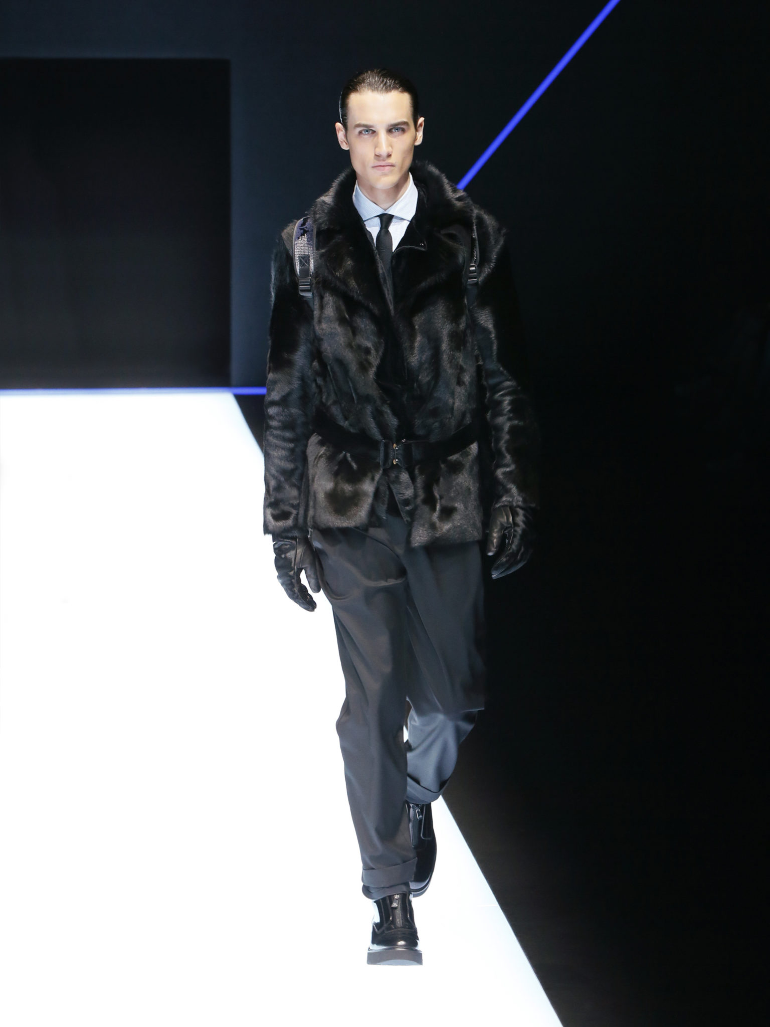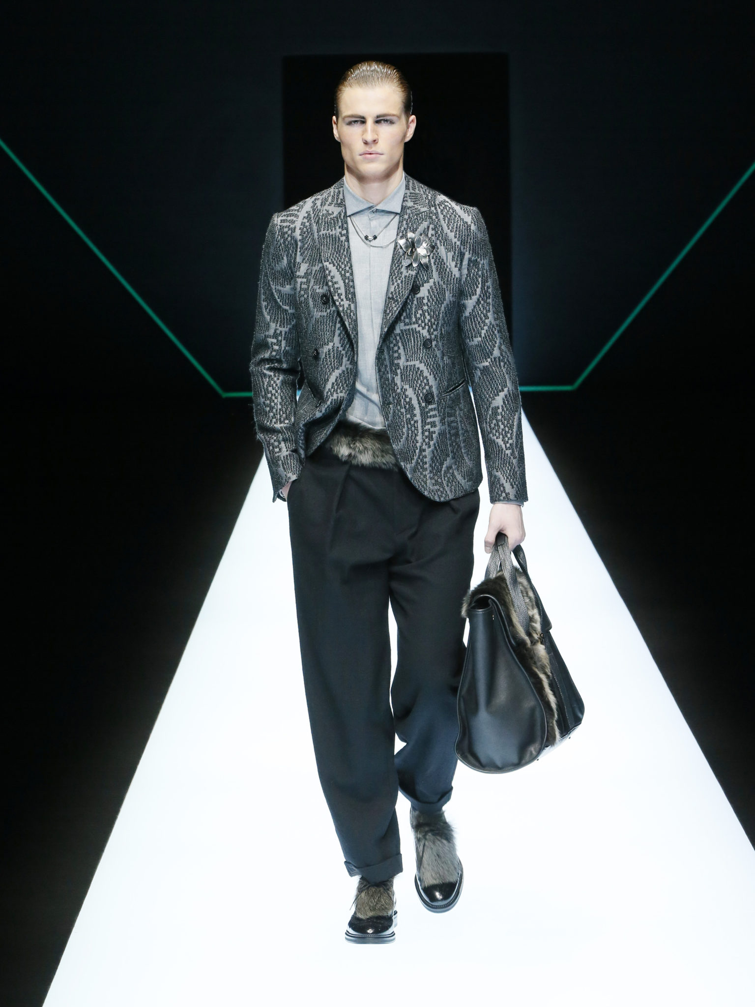 La collection a un esprit urbain et décisif, avec une idée de nouvelle élégance : précieuse mais pas frivole. Le vestiaire urbain a un ton dynamique, combinant l’innovation des lignes et des matières. La silhouette svelte et nette se traduit par des vestes de costumes à double boutonnage et petites épaulettes, portées avec des pantalons larges, un trench-coat en laine à boucles techniques, et des bombers style kimono sans coutures. Le « outerwear » rend hommage au monde de la randonnée en montagne et aux activités outdoor, avec des manteaux en peau de mouton retournée et des vestes en peau de chèvre.