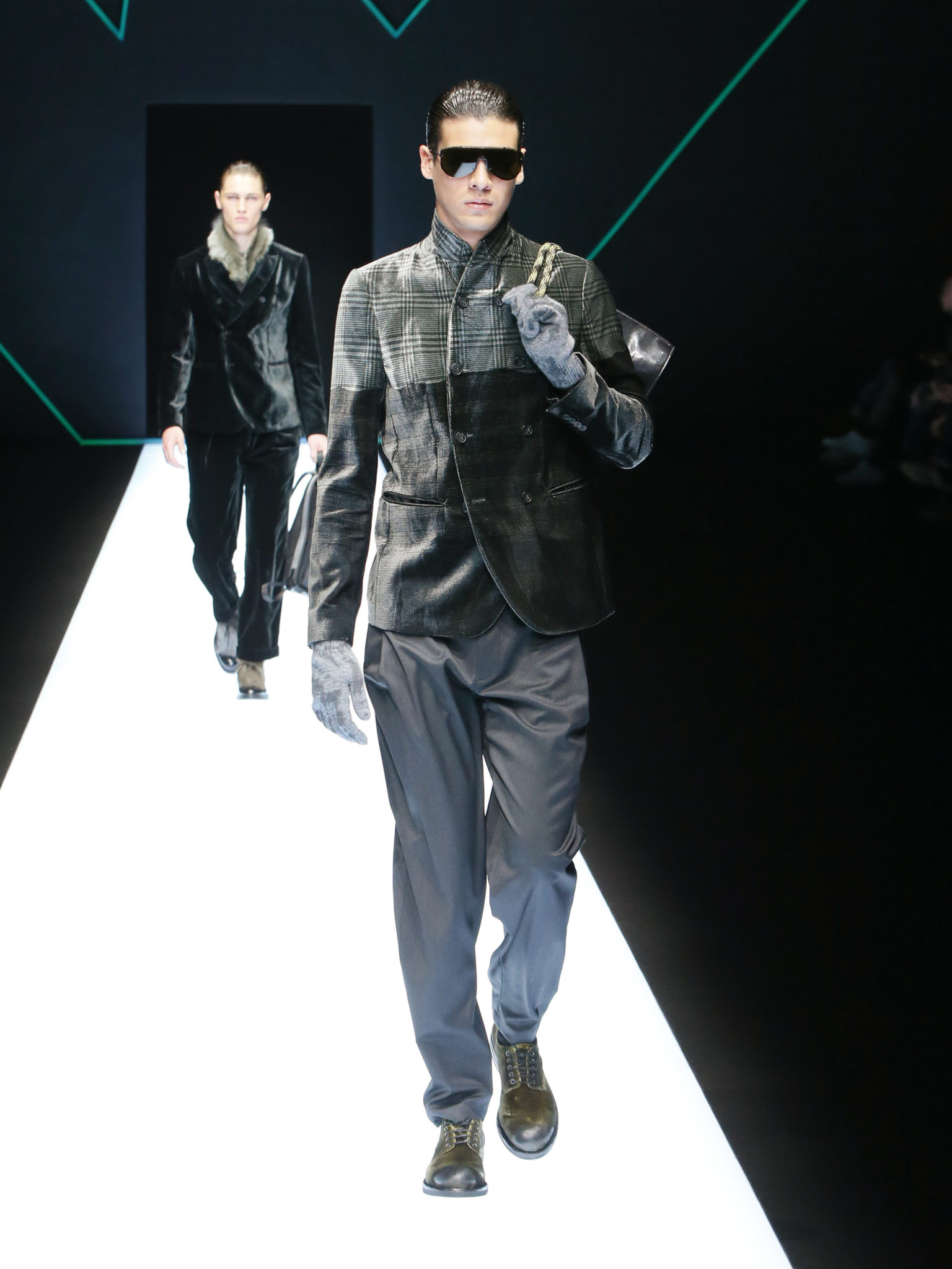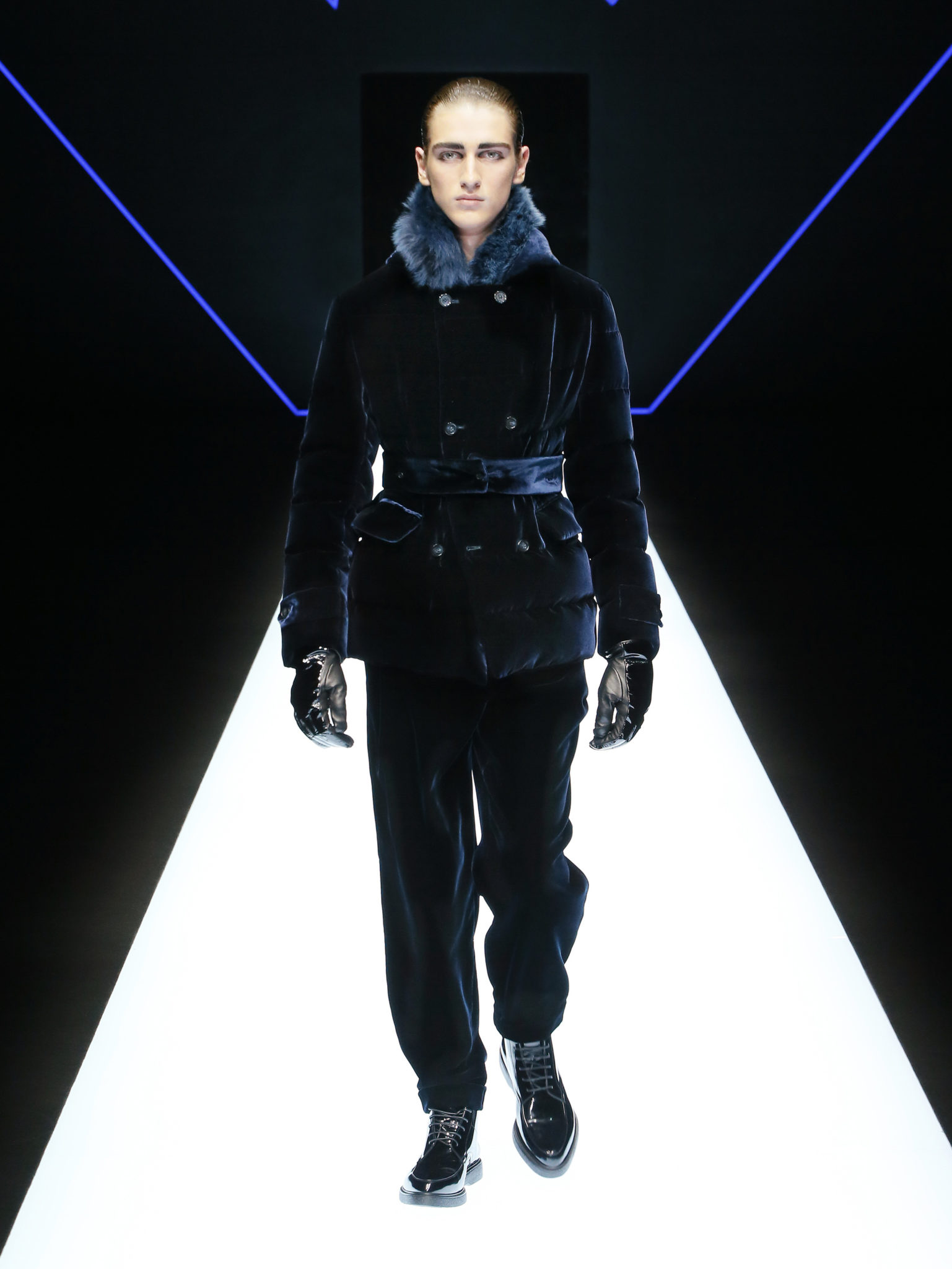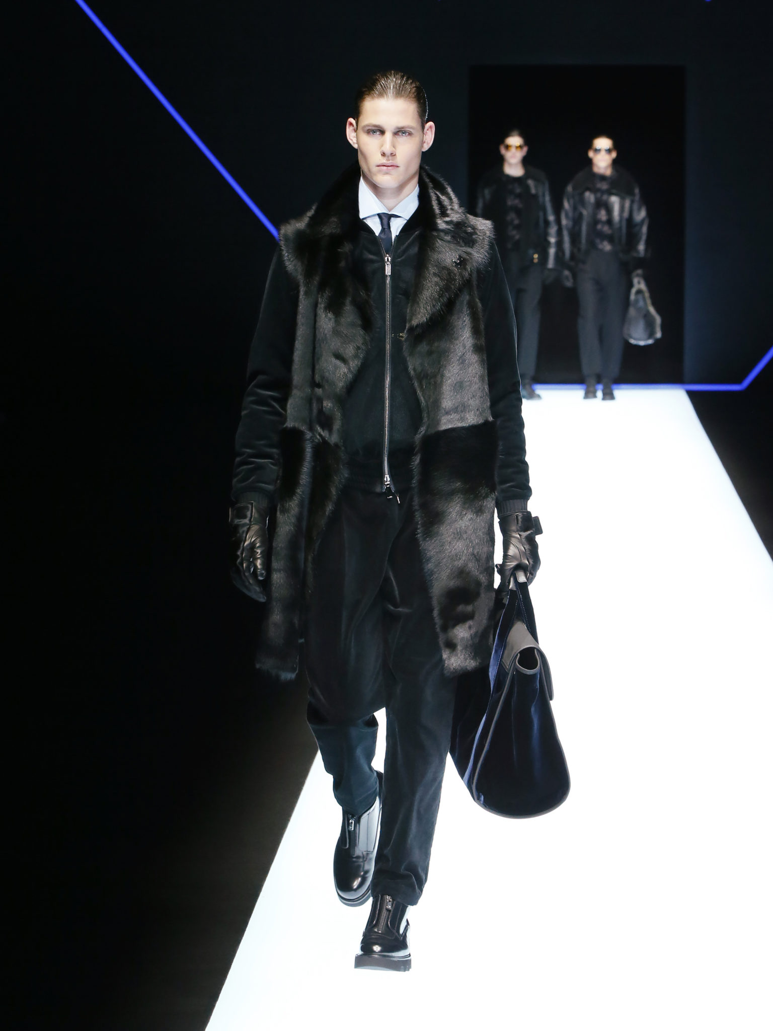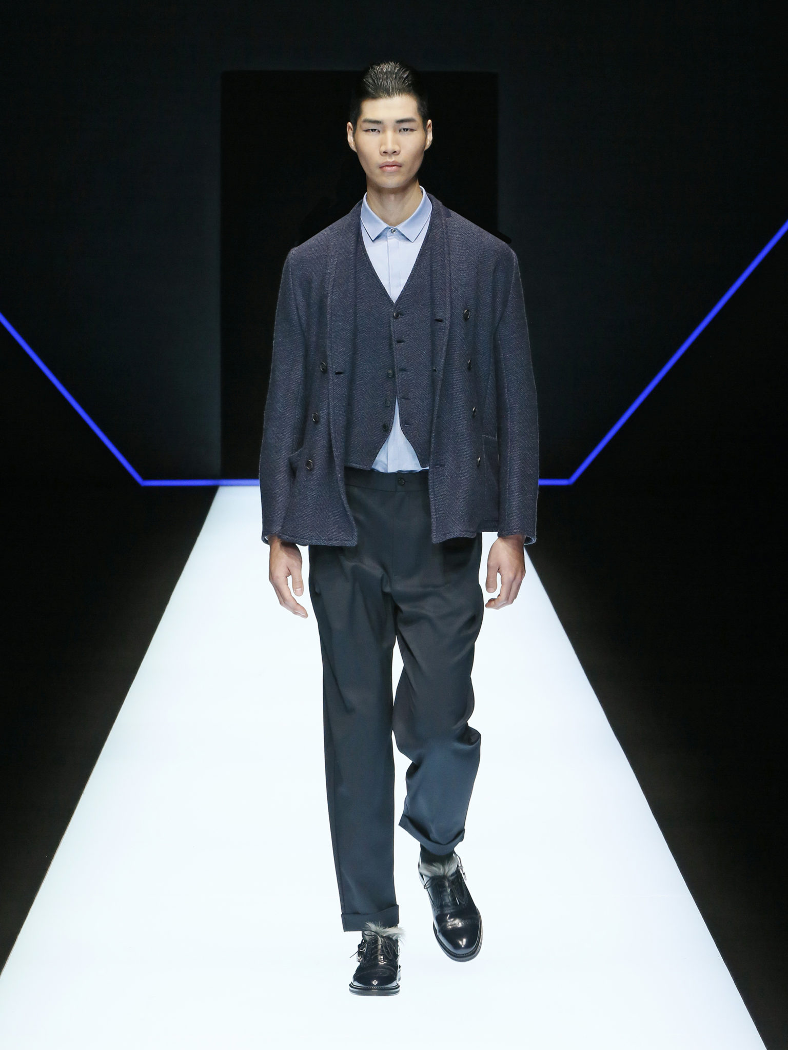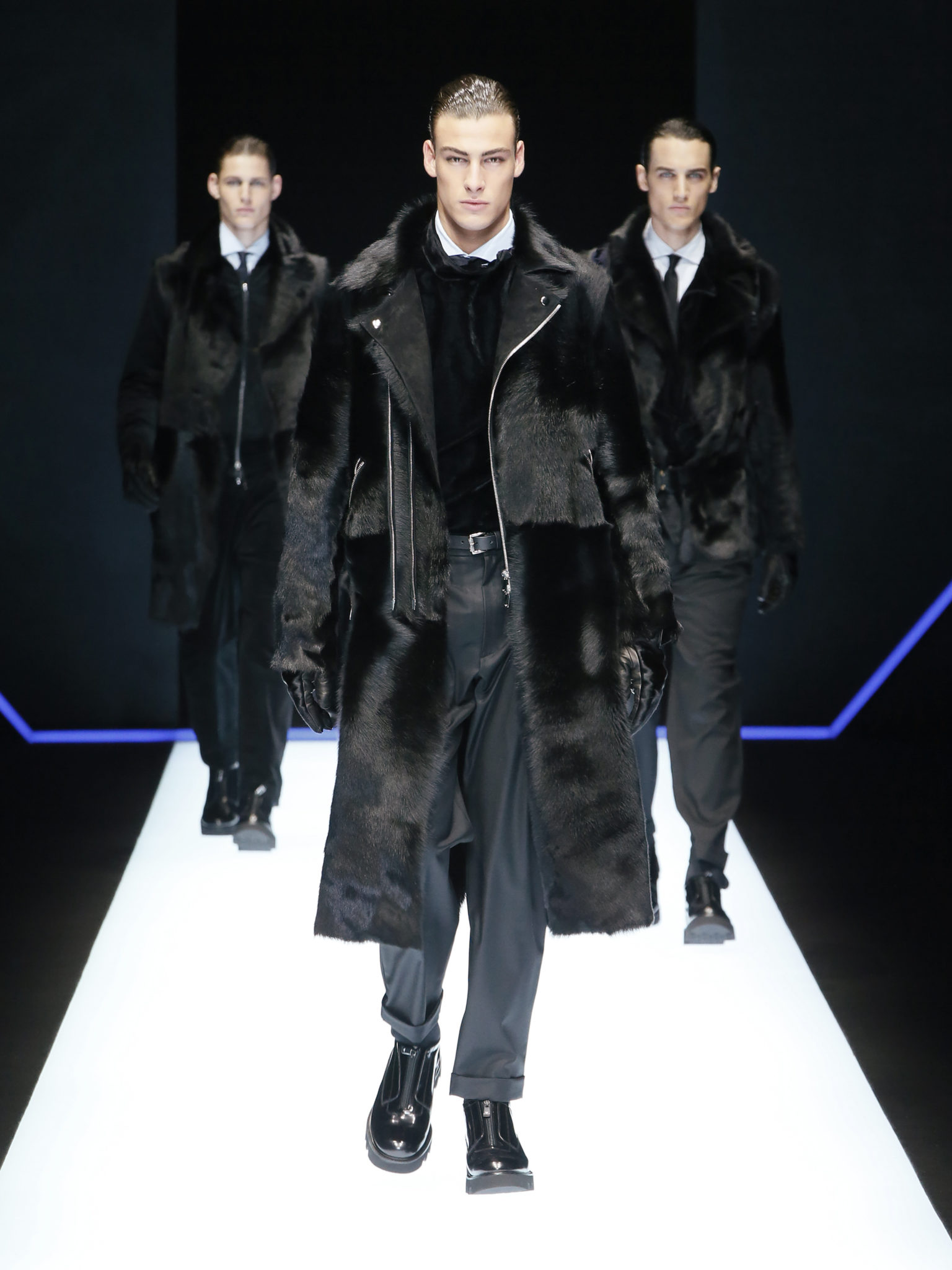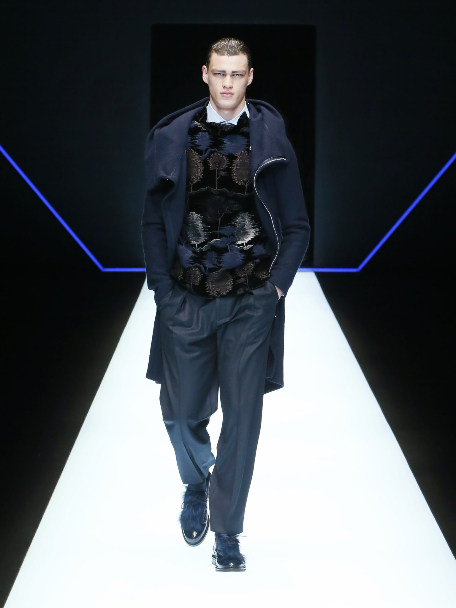La collection a un esprit urbain et décisif, avec une idée de nouvelle élégance : précieuse mais pas frivole. Le vestiaire urbain a un ton dynamique, combinant l’innovation des lignes et des matières. La silhouette svelte et nette se traduit par des vestes de costumes à double boutonnage et petites épaulettes, portées avec des pantalons larges, un trench-coat en laine à boucles techniques, et des bombers style kimono sans coutures. Le « outerwear » rend hommage au monde de la randonnée en montagne et aux activités outdoor, avec des manteaux en peau de mouton retournée et des vestes en peau de chèvre.
