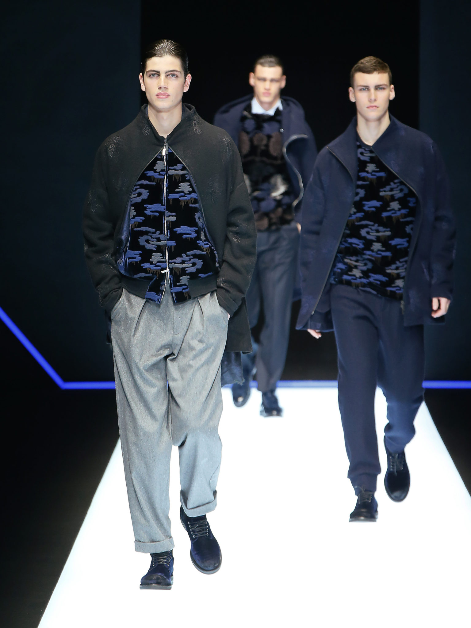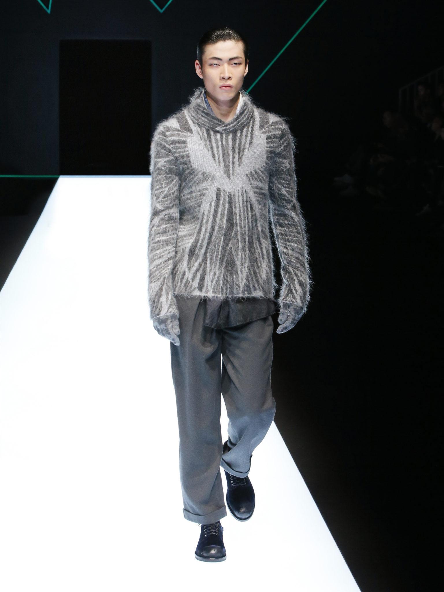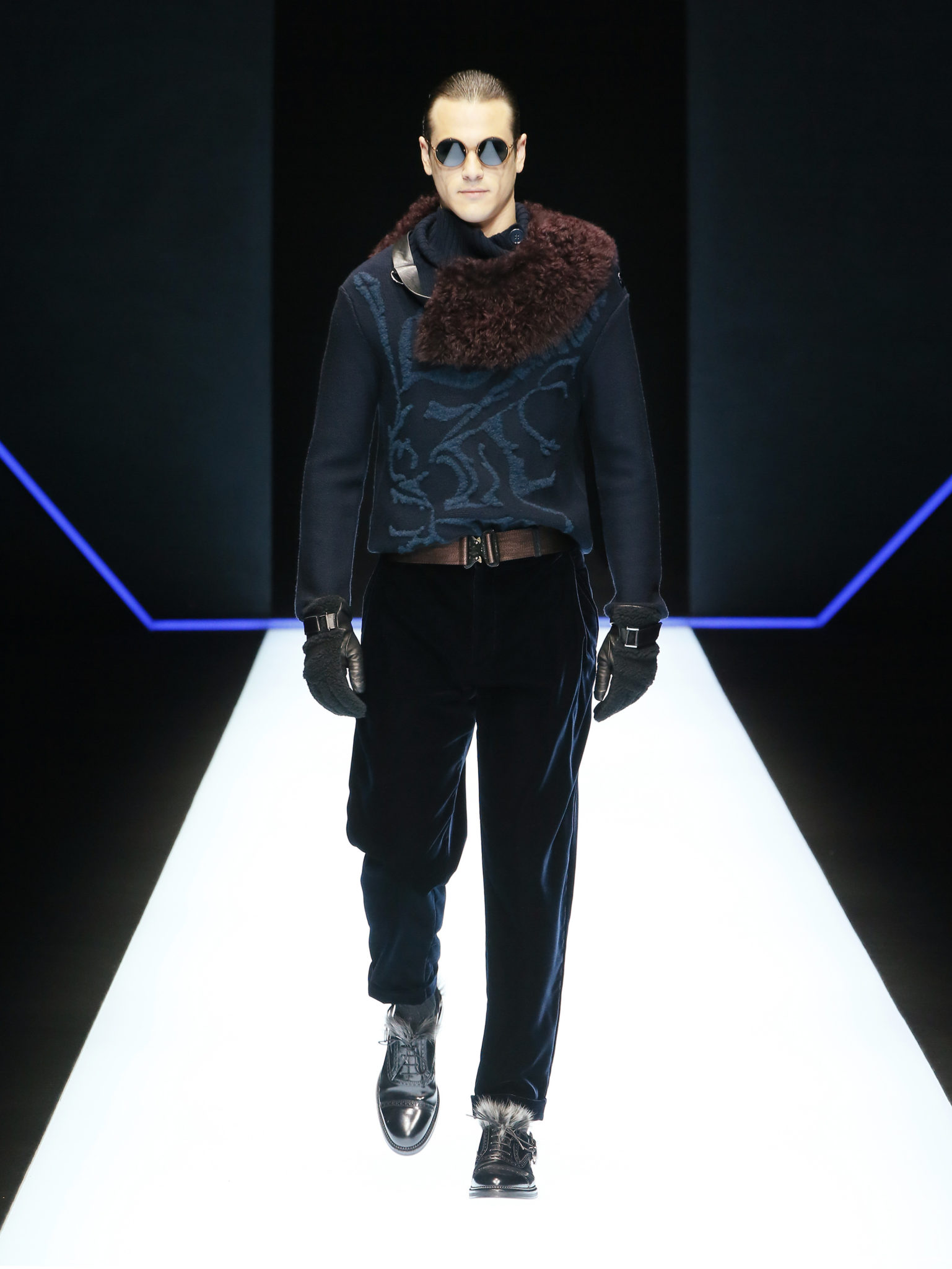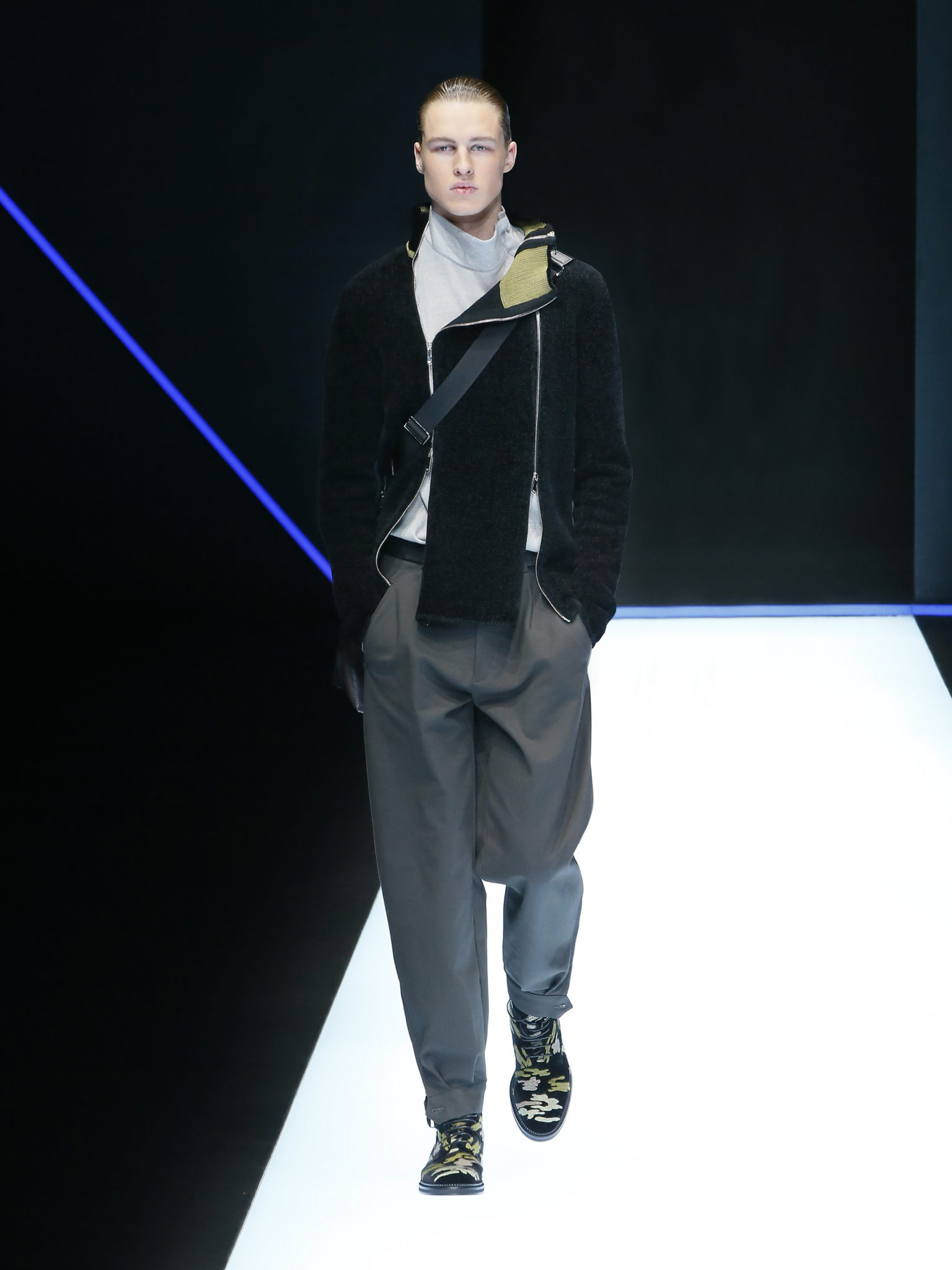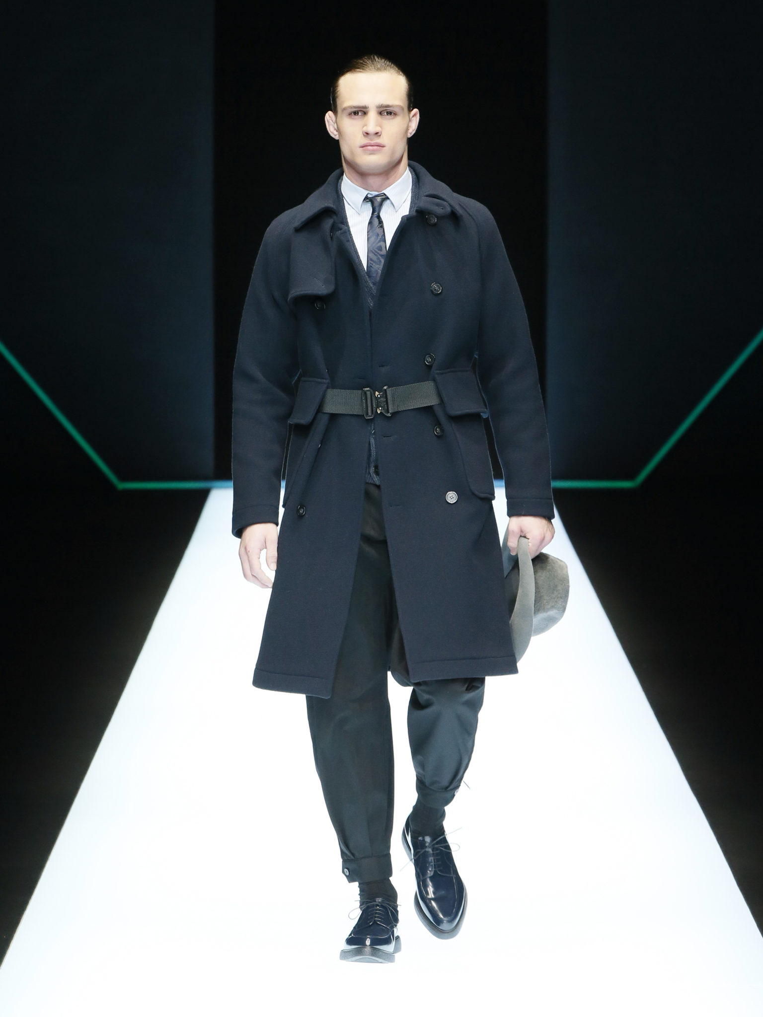 La collection a un esprit urbain et décisif, avec une idée de nouvelle élégance : précieuse mais pas frivole. Le vestiaire urbain a un ton dynamique, combinant l’innovation des lignes et des matières. La silhouette svelte et nette se traduit par des vestes de costumes à double boutonnage et petites épaulettes, portées avec des pantalons larges, un trench-coat en laine à boucles techniques, et des bombers style kimono sans coutures. Le « outerwear » rend hommage au monde de la randonnée en montagne et aux activités outdoor, avec des manteaux en peau de mouton retournée et des vestes en peau de chèvre.