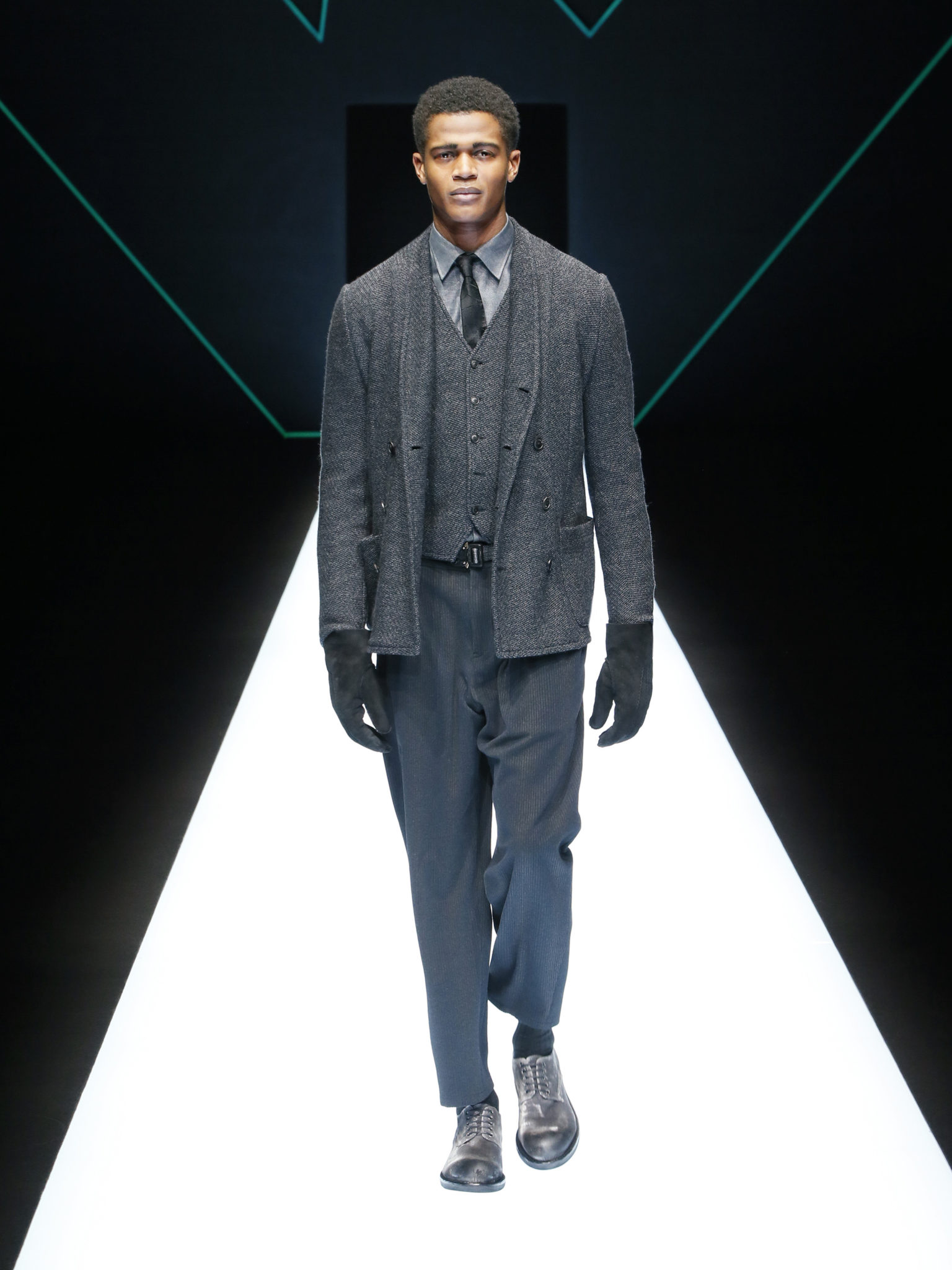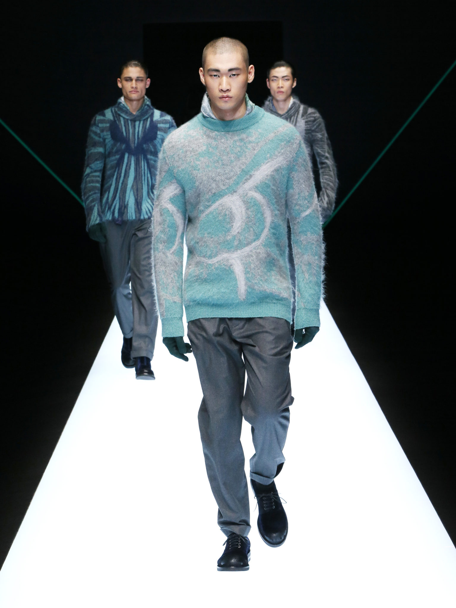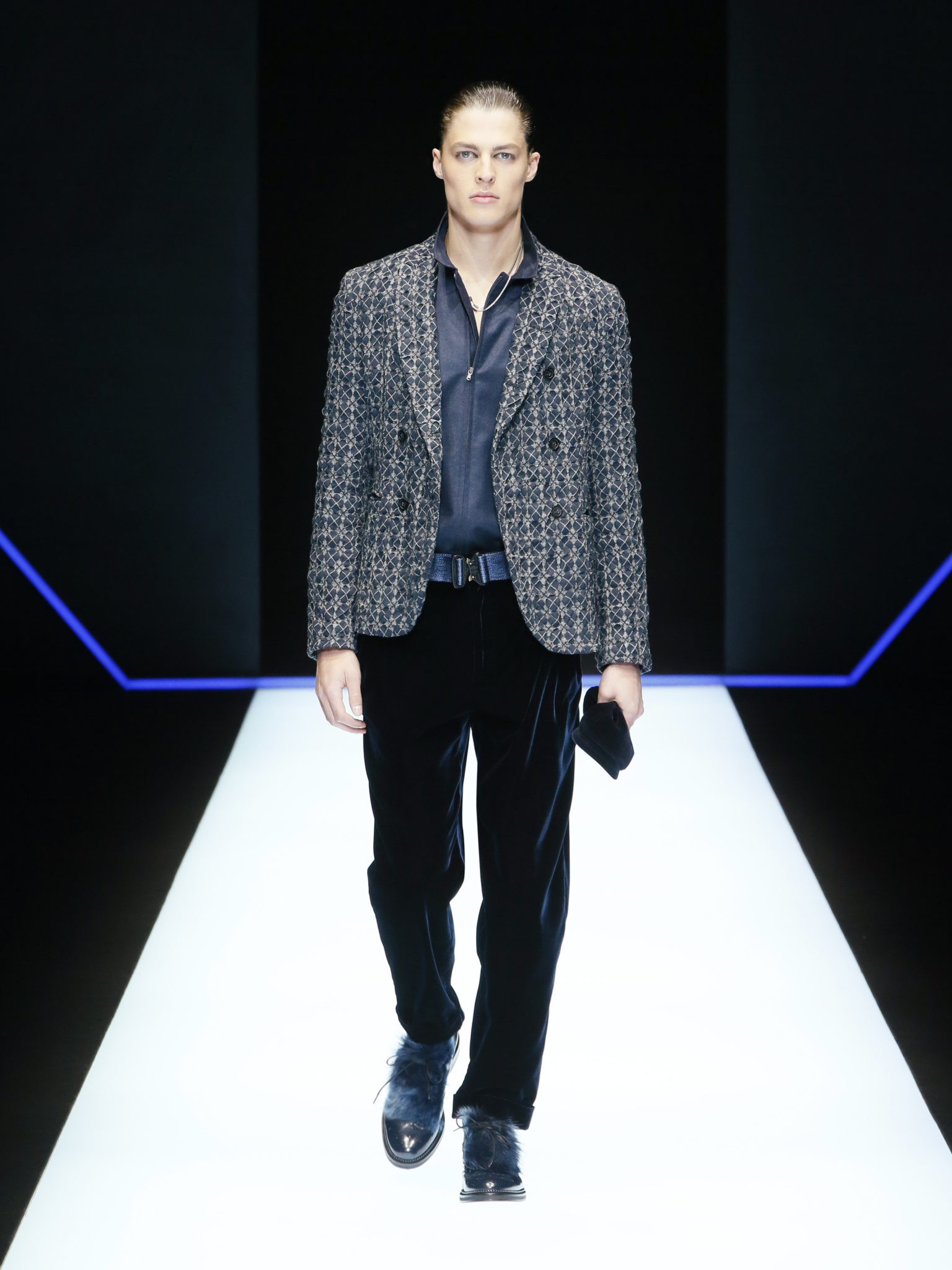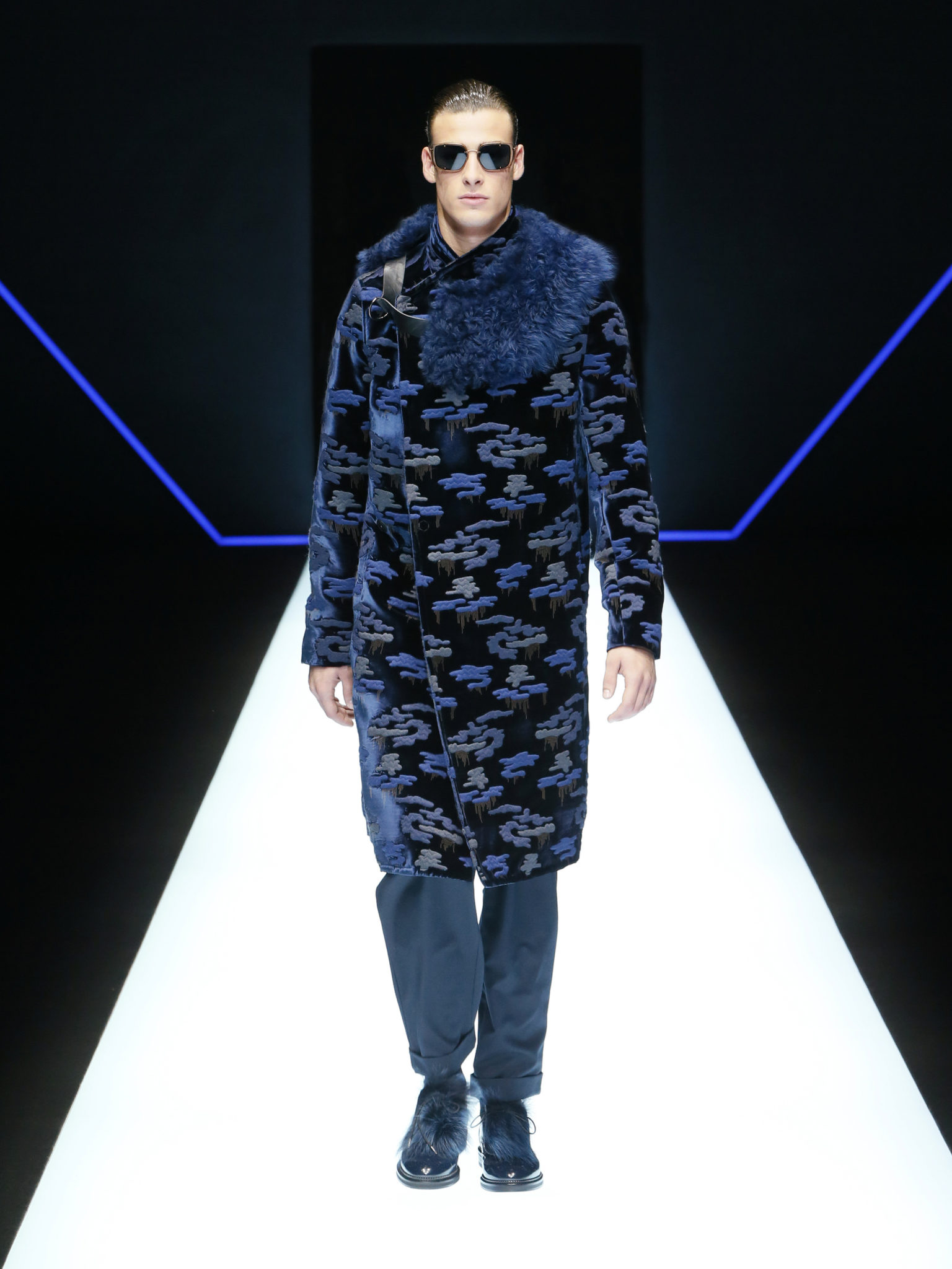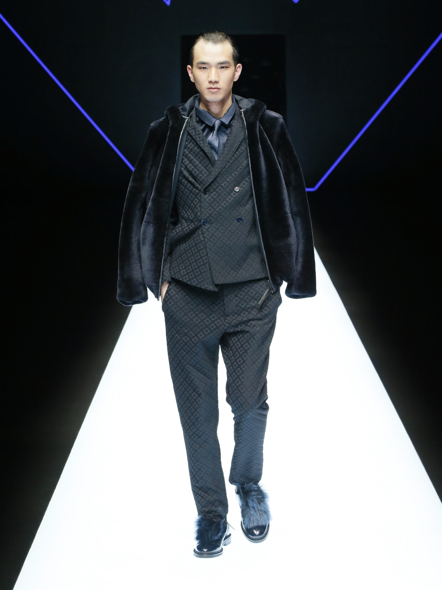 La collection a un esprit urbain et décisif, avec une idée de nouvelle élégance : précieuse mais pas frivole. Le vestiaire urbain a un ton dynamique, combinant l’innovation des lignes et des matières. La silhouette svelte et nette se traduit par des vestes de costumes à double boutonnage et petites épaulettes, portées avec des pantalons larges, un trench-coat en laine à boucles techniques, et des bombers style kimono sans coutures. Le « outerwear » rend hommage au monde de la randonnée en montagne et aux activités outdoor, avec des manteaux en peau de mouton retournée et des vestes en peau de chèvre.