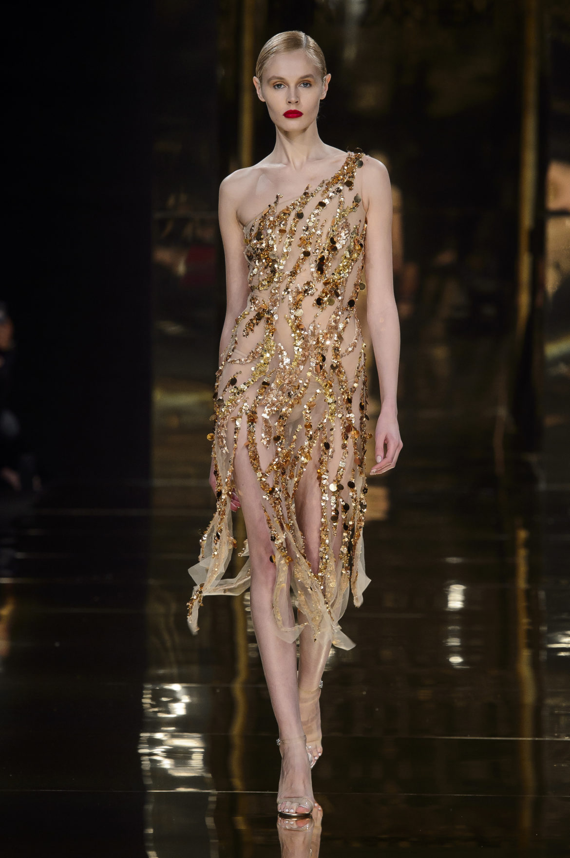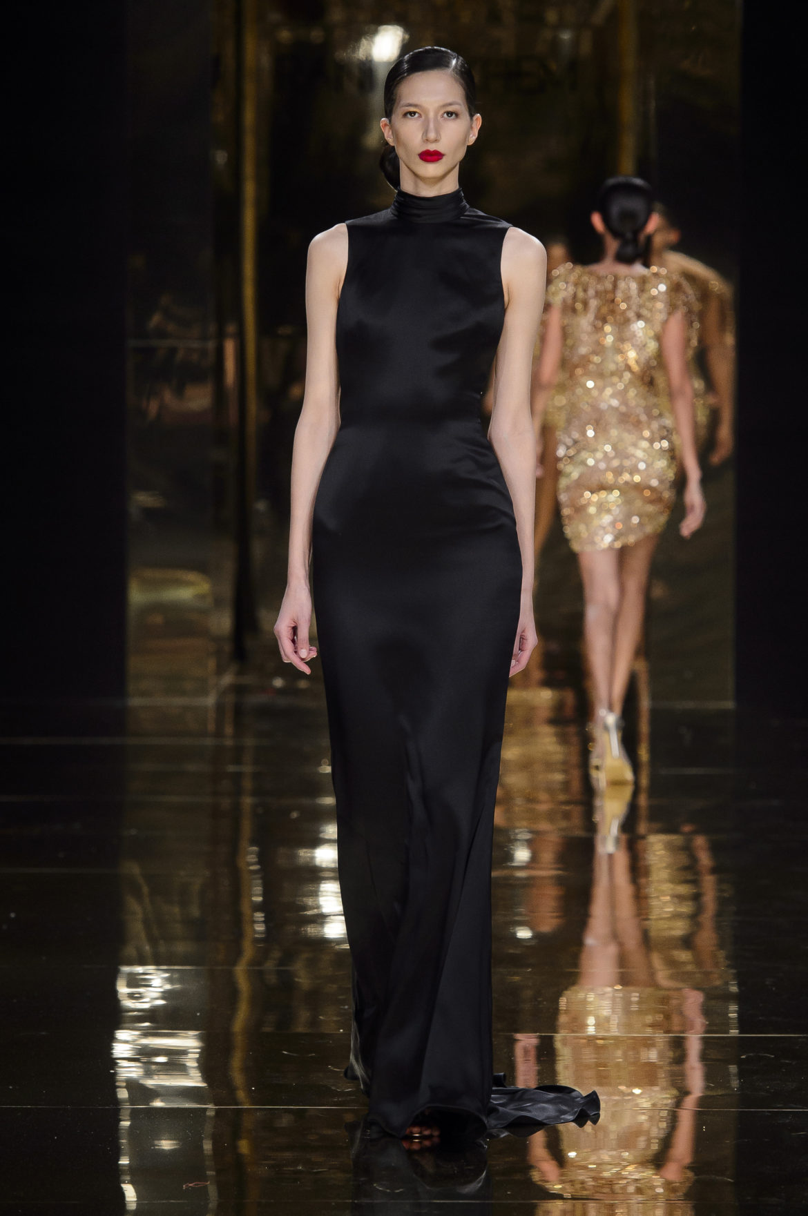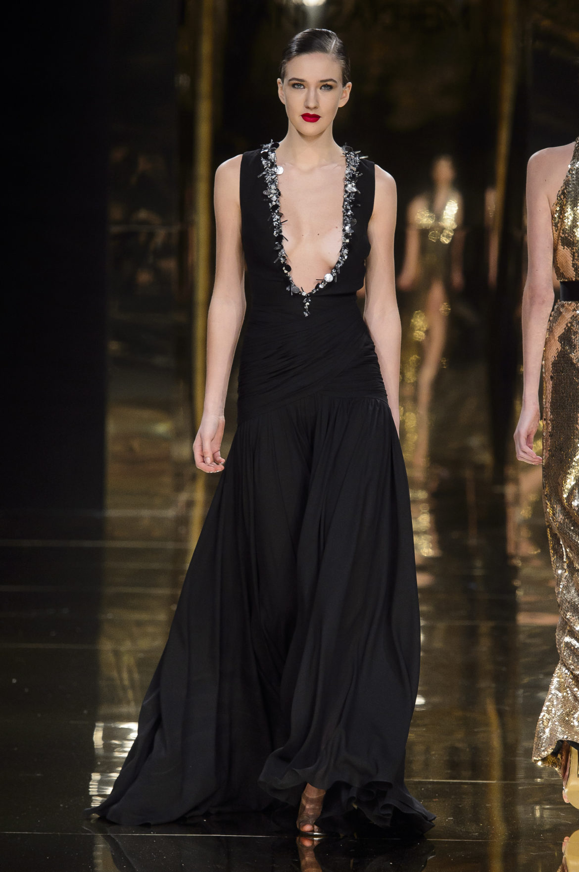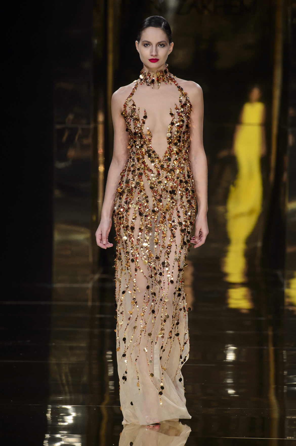 Aussi dévorant qu’immatériel, l’élément sacré se décline en explosions pyrotechniques et cascades d’or, tracées par des broderies de cristaux arachnéennes sur la lave d’un fourreau noir dont le haut drapé se fend en un profond décolleté en « V ».