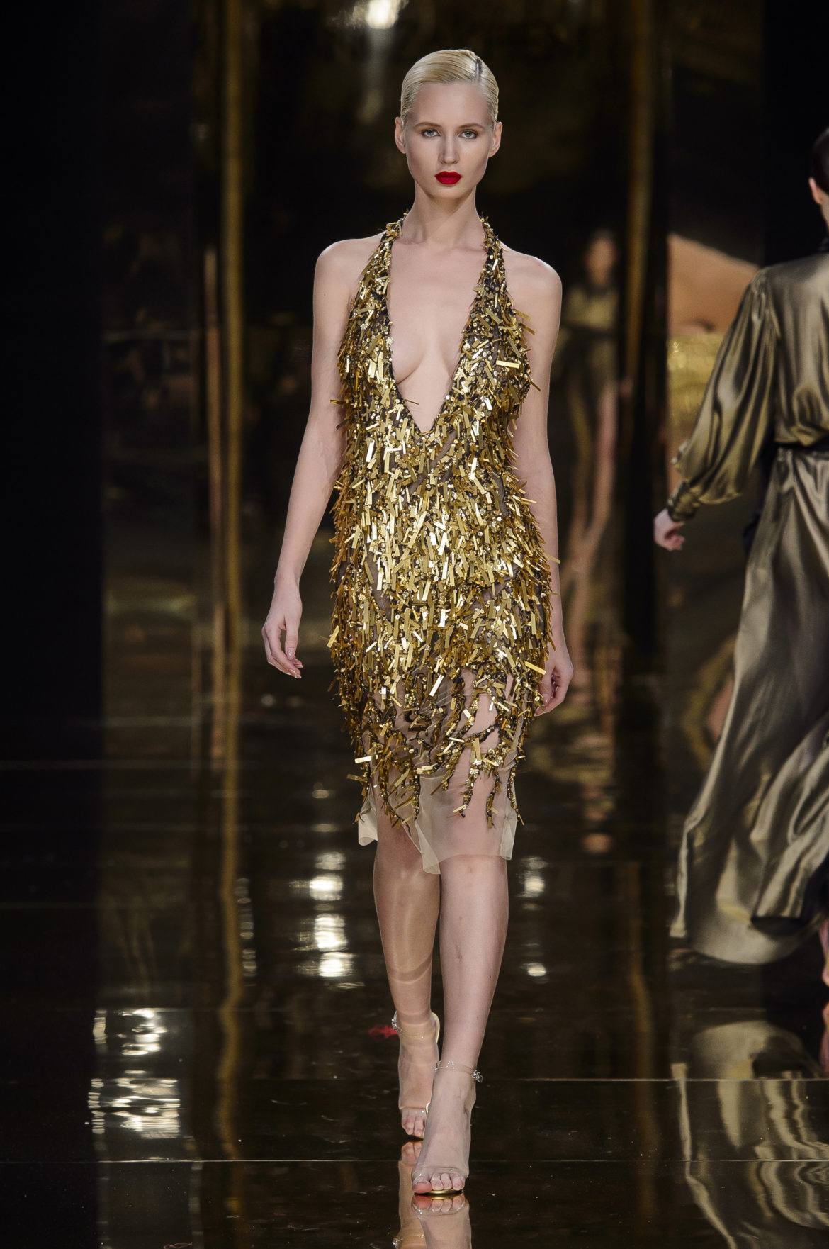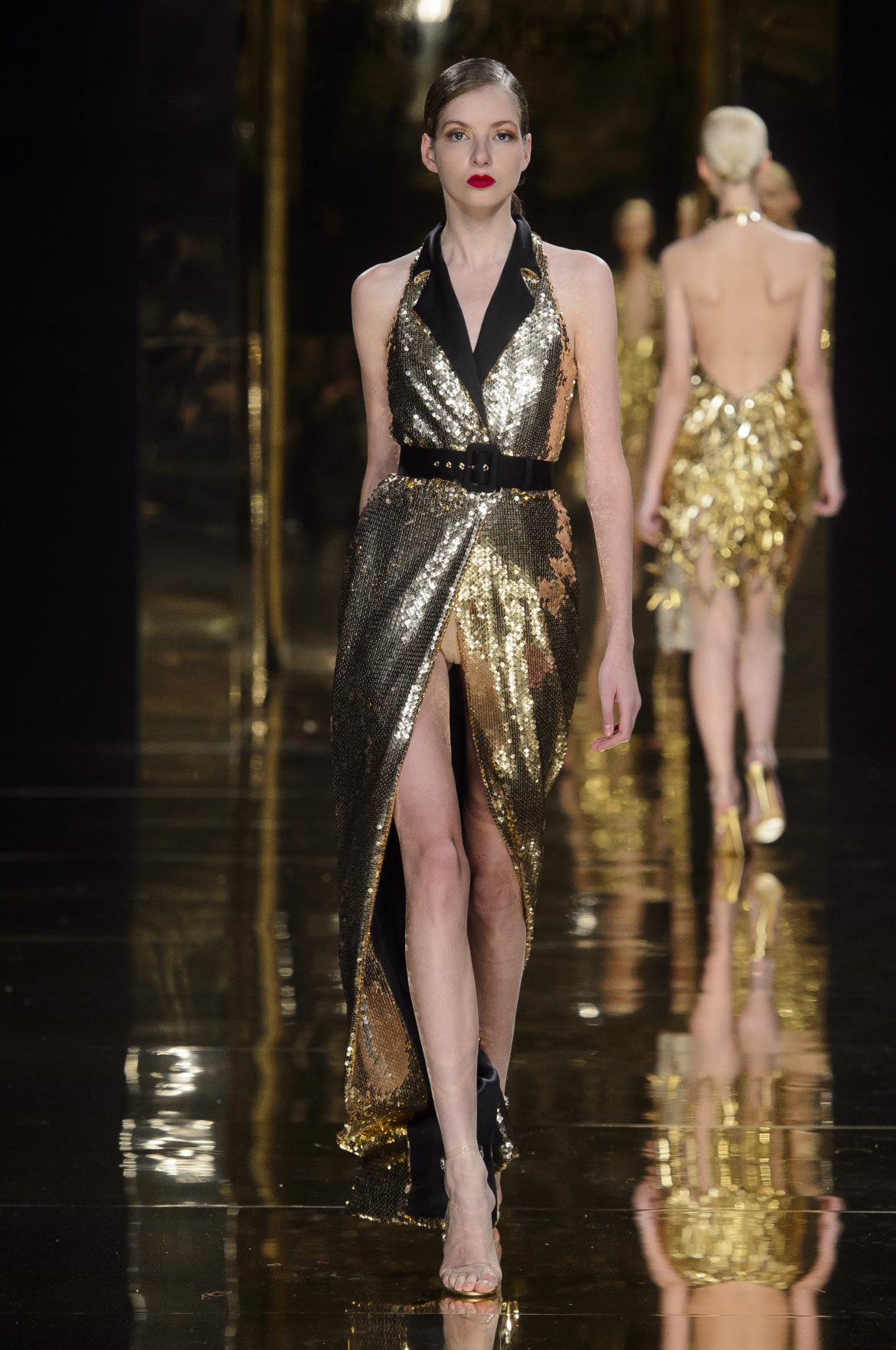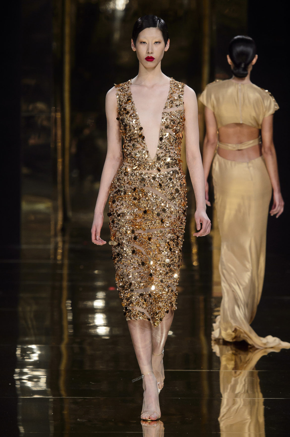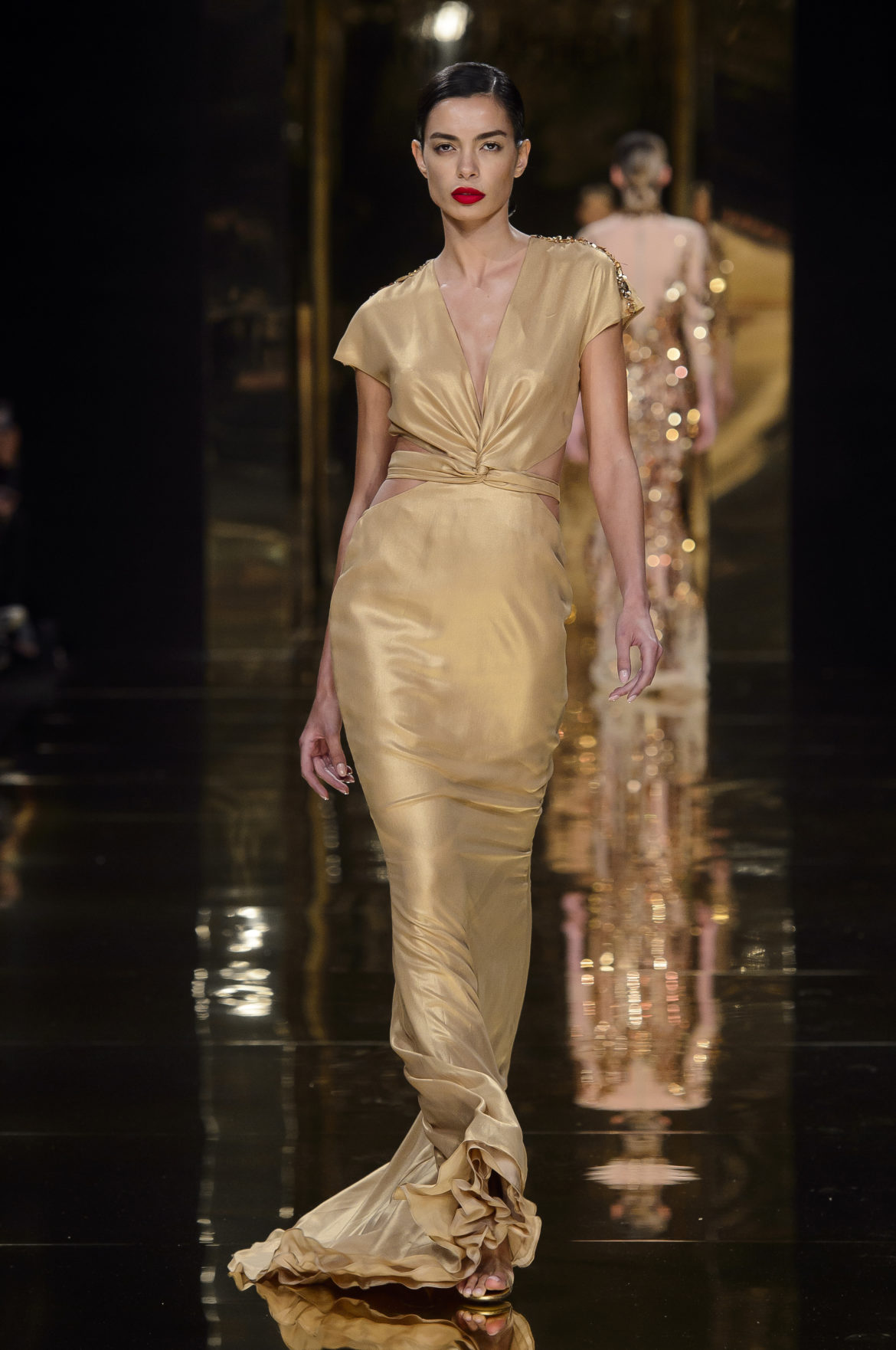 Aussi dévorant qu’immatériel, l’élément sacré se décline en explosions pyrotechniques et cascades d’or, tracées par des broderies de cristaux arachnéennes sur la lave d’un fourreau noir dont le haut drapé se fend en un profond décolleté en « V ».