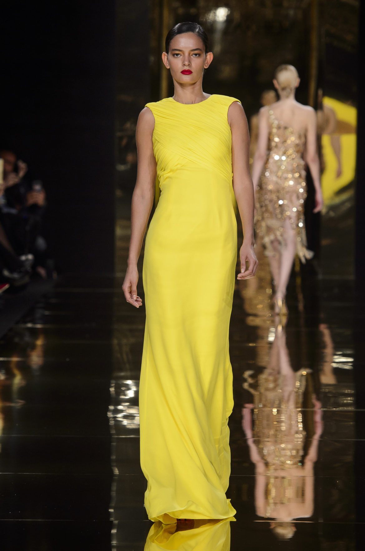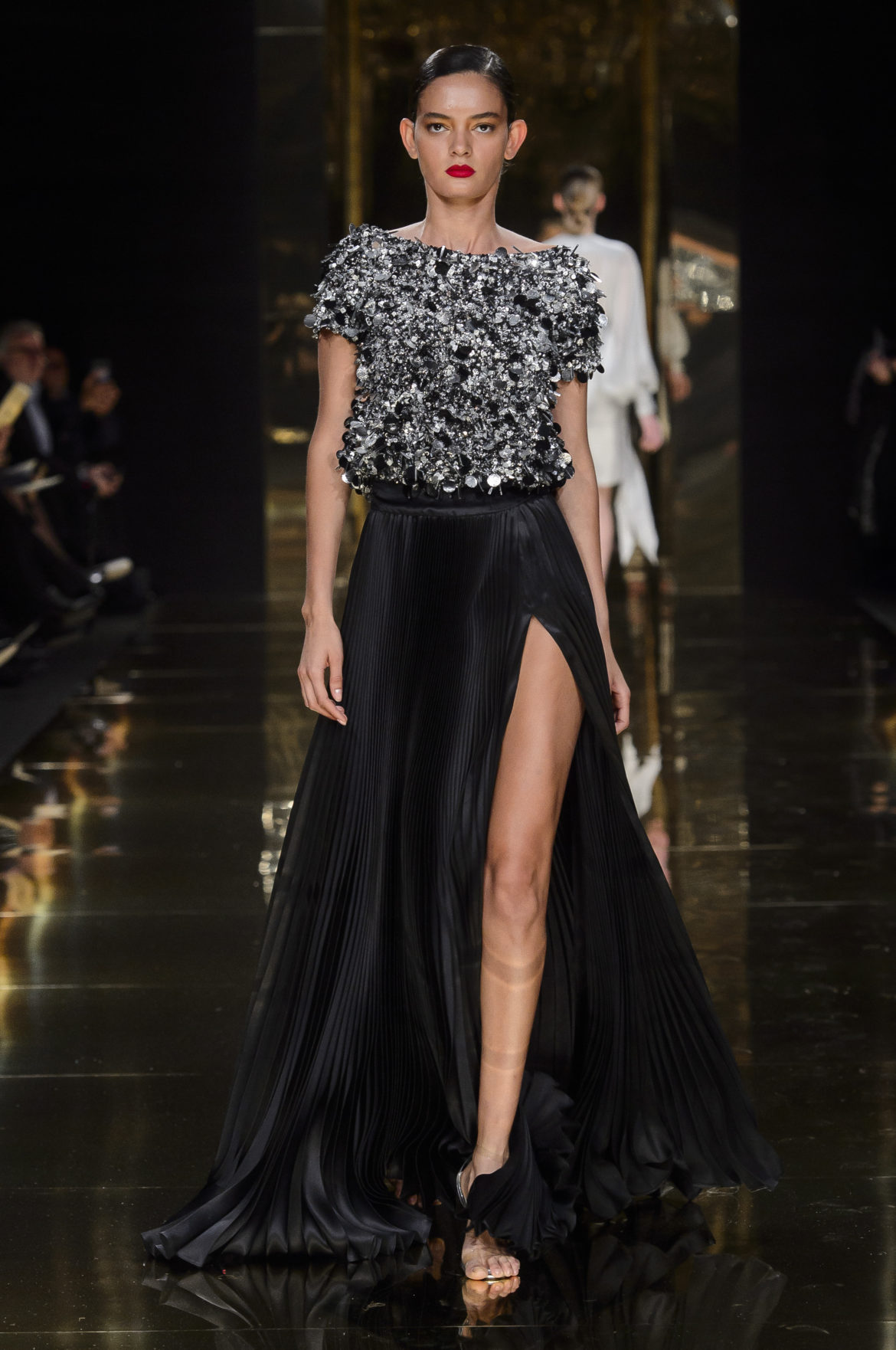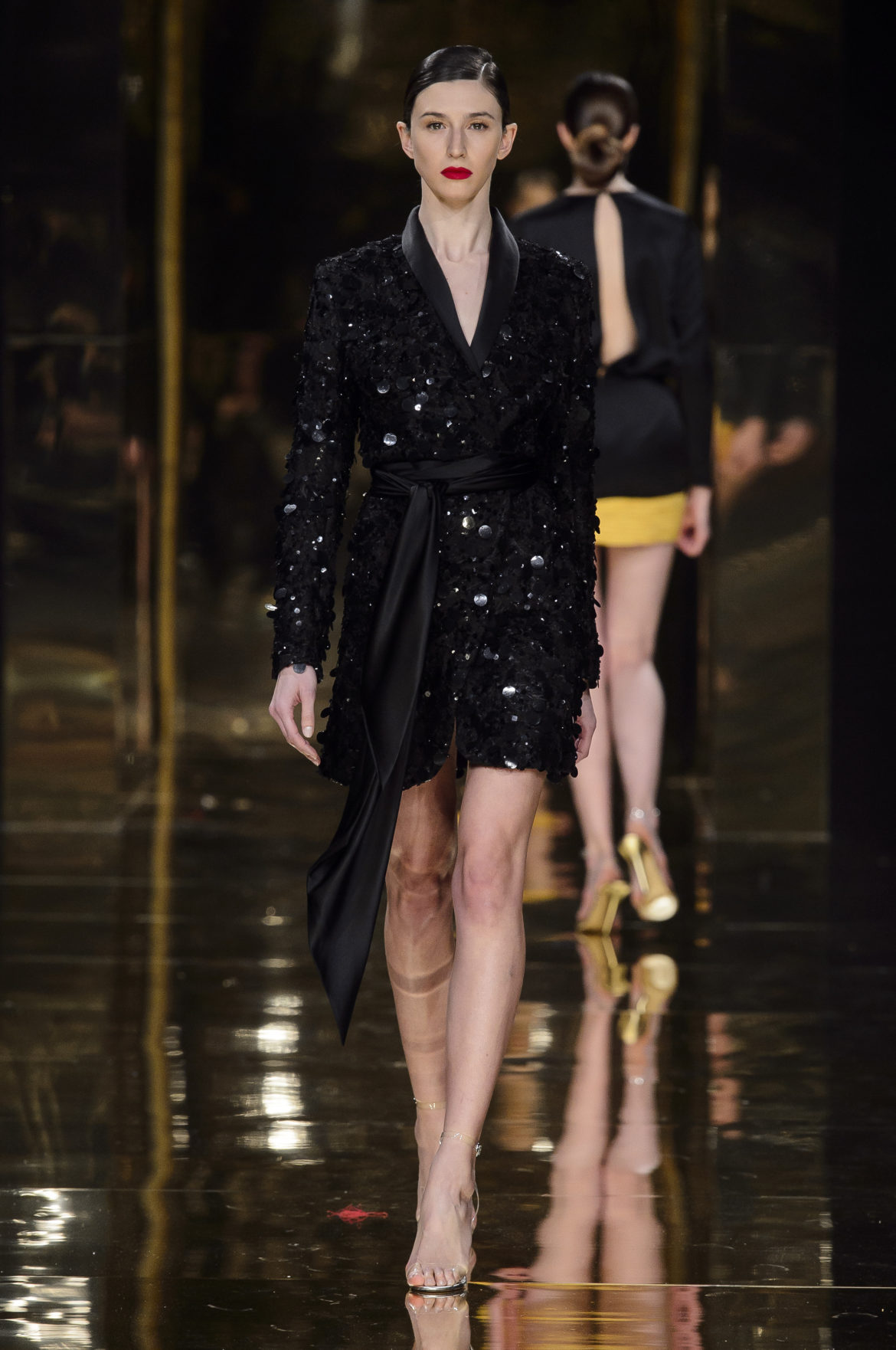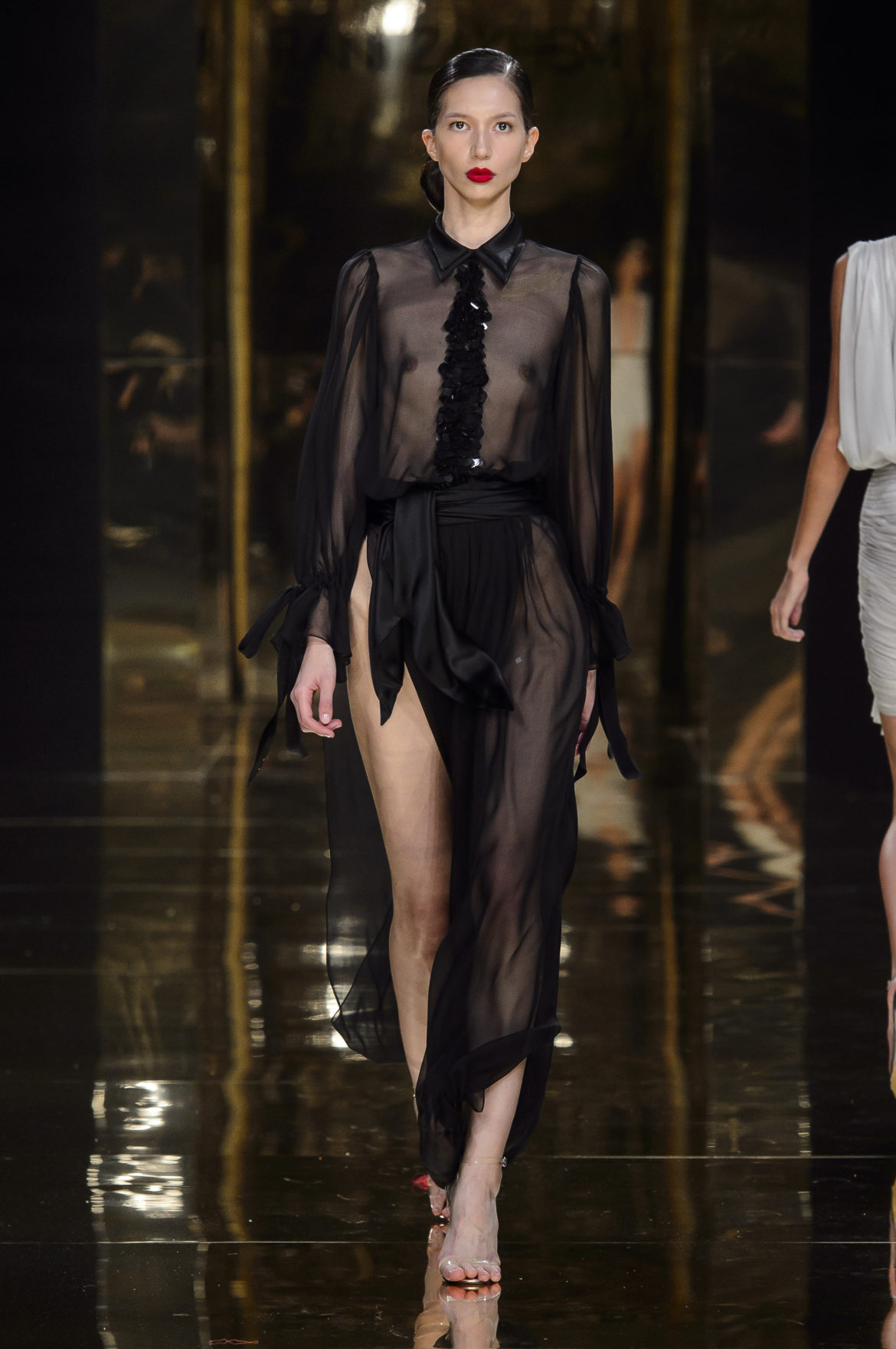 Aussi dévorant qu’immatériel, l’élément sacré se décline en explosions pyrotechniques et cascades d’or, tracées par des broderies de cristaux arachnéennes sur la lave d’un fourreau noir dont le haut drapé se fend en un profond décolleté en « V ».