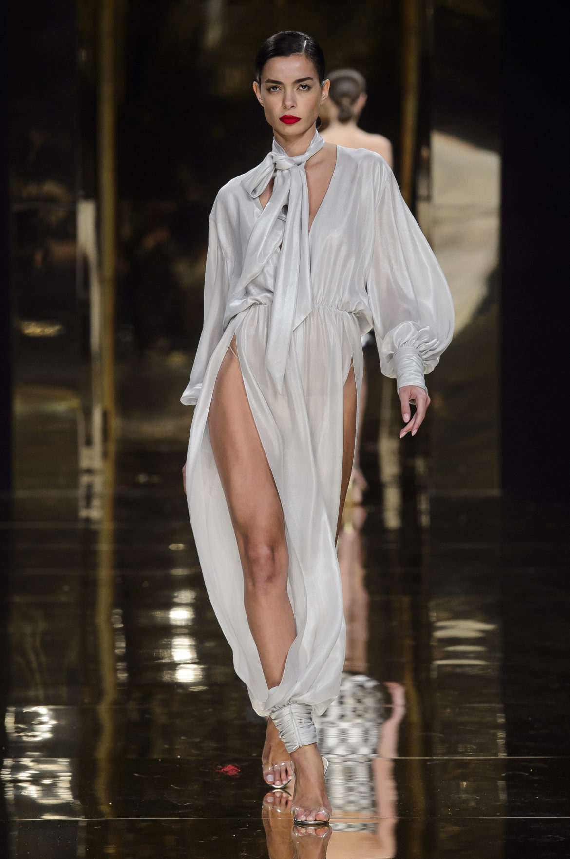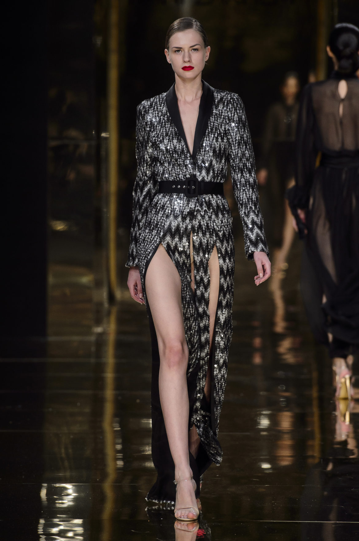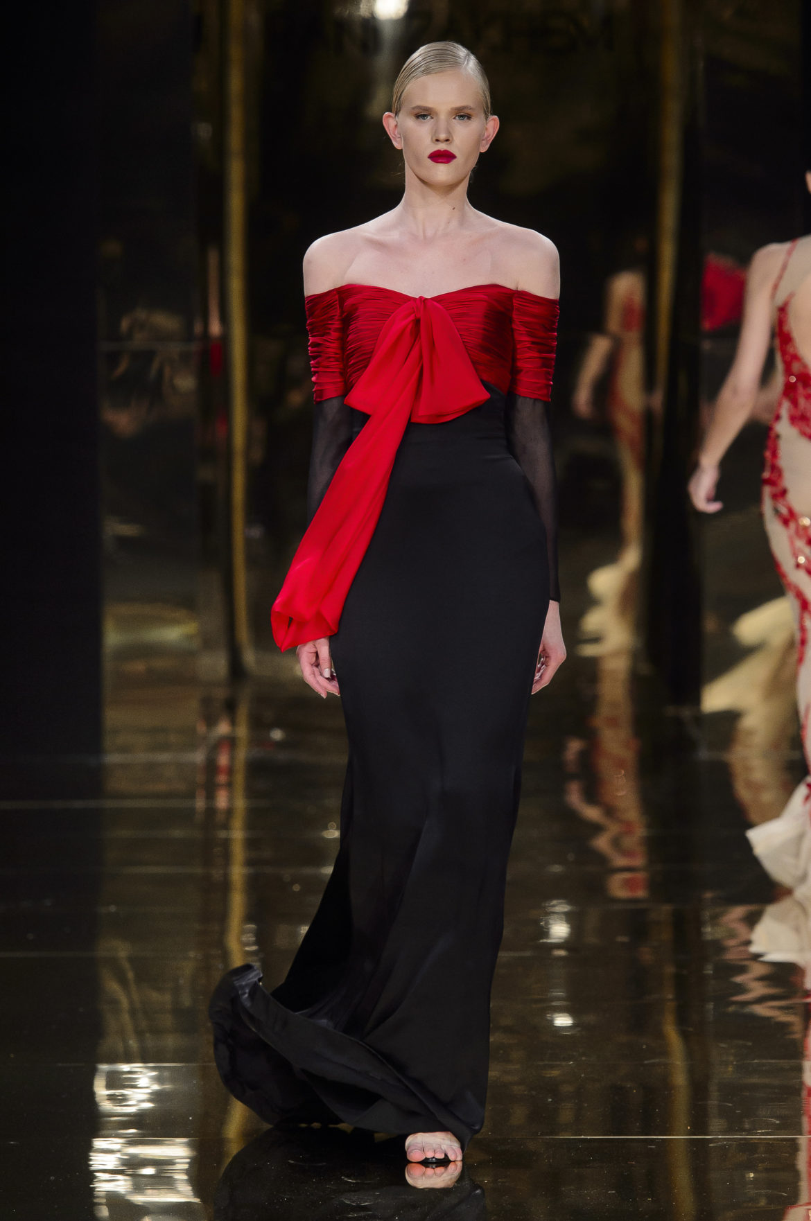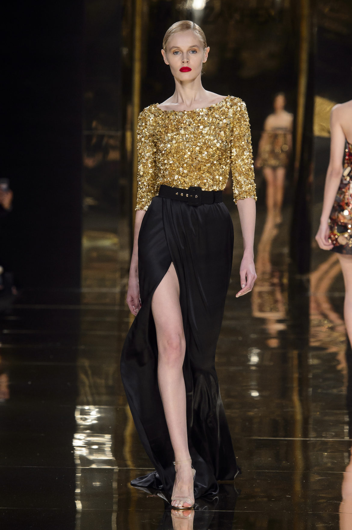 Aussi dévorant qu’immatériel, l’élément sacré se décline en explosions pyrotechniques et cascades d’or, tracées par des broderies de cristaux arachnéennes sur la lave d’un fourreau noir dont le haut drapé se fend en un profond décolleté en « V ».
