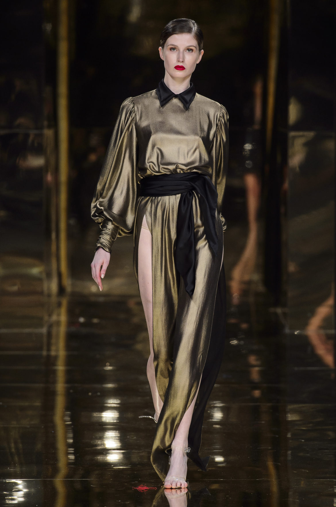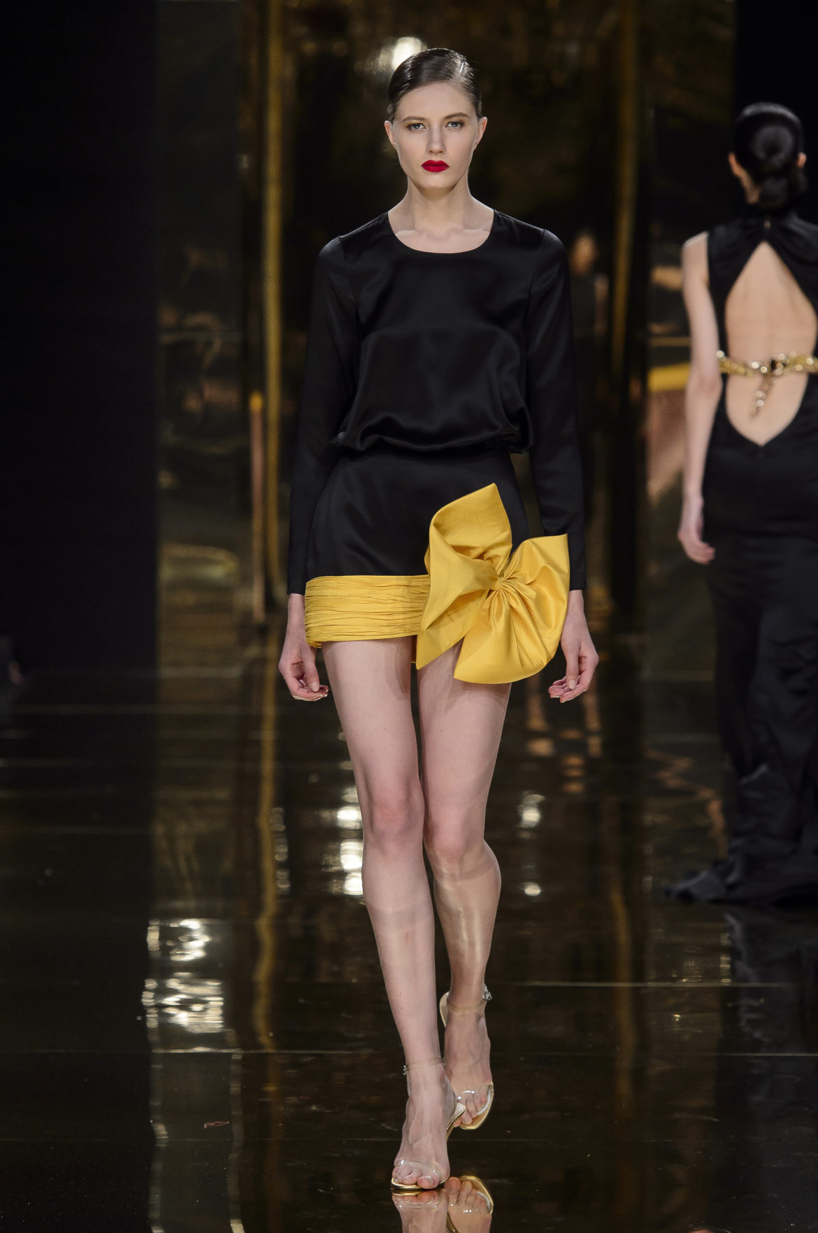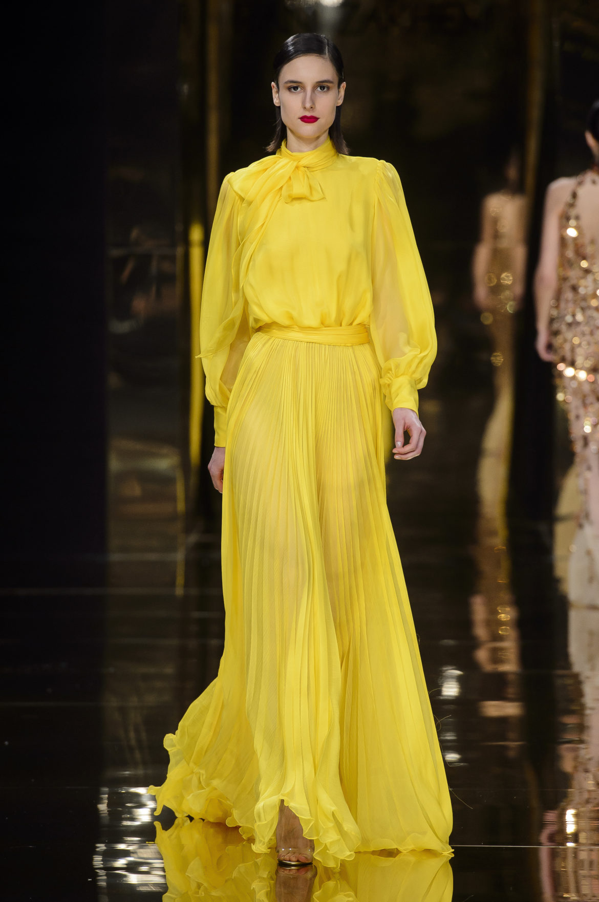 Cette robe en mousseline jaune à manches gigot et col foulard, à la jupe plissée soleil et généreusement fendue, est un joyeux sourire adressé à Jean-Louis Scherrer. Cette autre, courte en satin noir, véritable tunique de Moujik ornée au bas d’un plissé de faille jaune agrémenté d’un grand nœud de la même matière, est un clin d’œil à Yves Saint Laurent. Cette troisième composée d’un haut doré à manches étroites, mi longues, et d’une jupe noire longue et drapée est une révérence à Balmain. Le cœur manque un battement quand apparaît le drapé en or liquide de ce fourreau grand soir, terminé par un grand nœud de soie noire à l’épaule, hommage du couturier à Madame Grès.