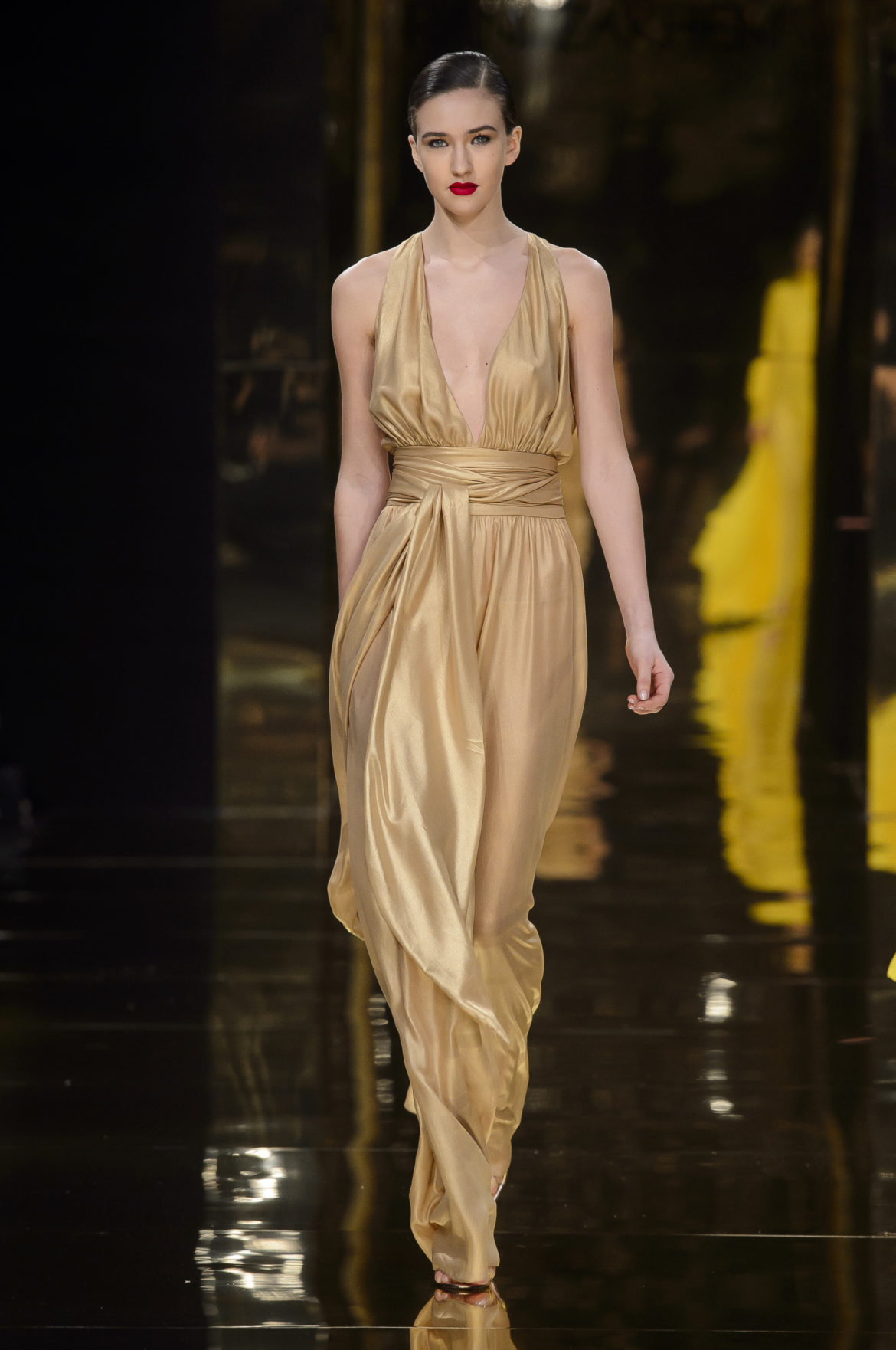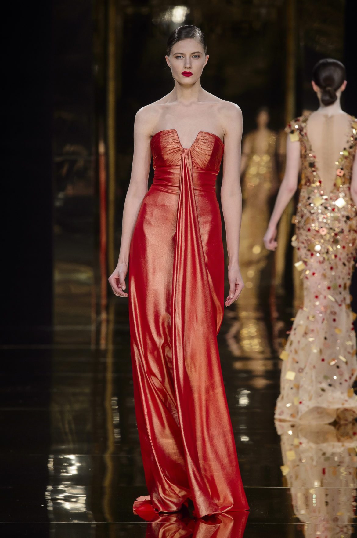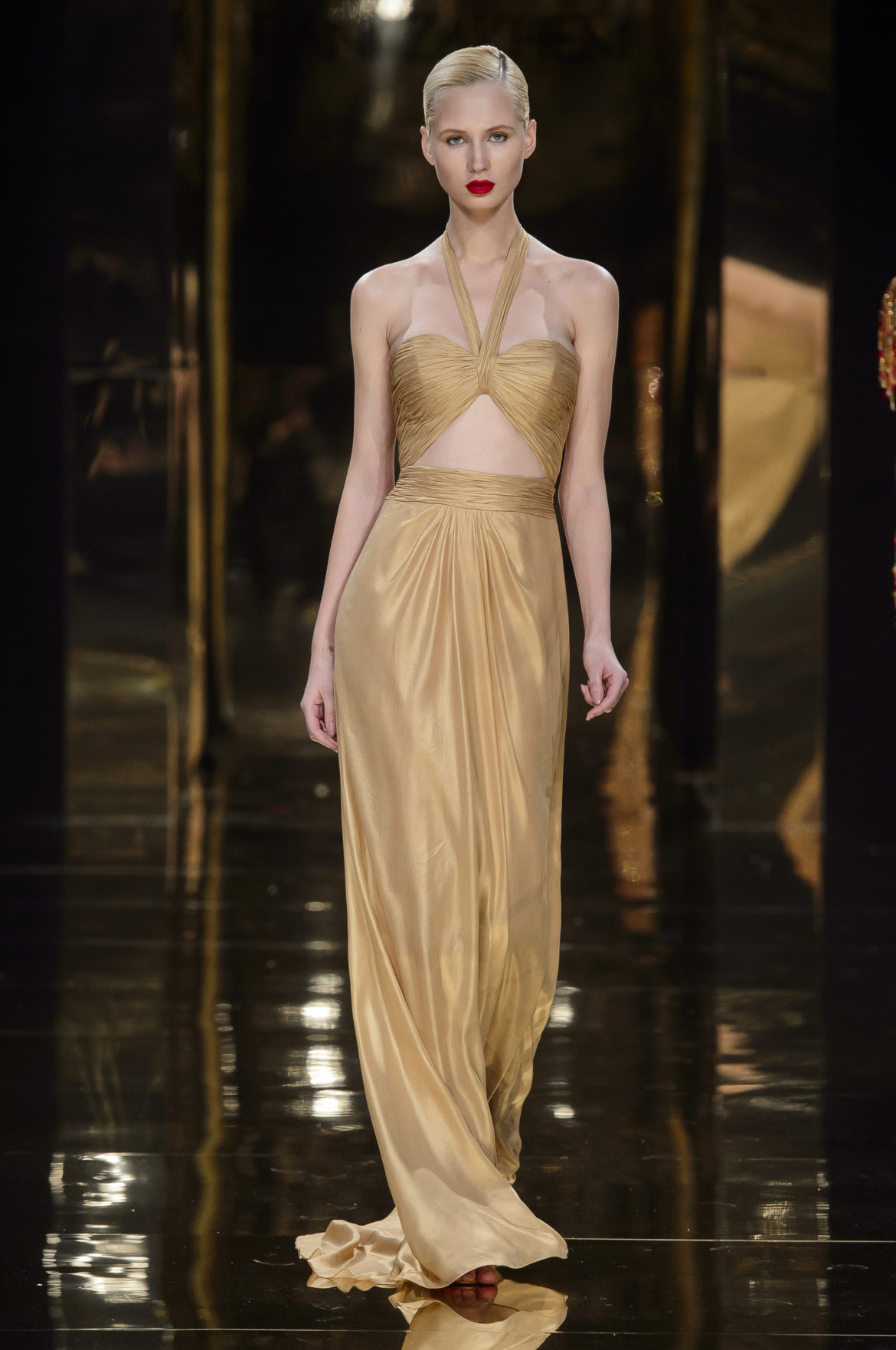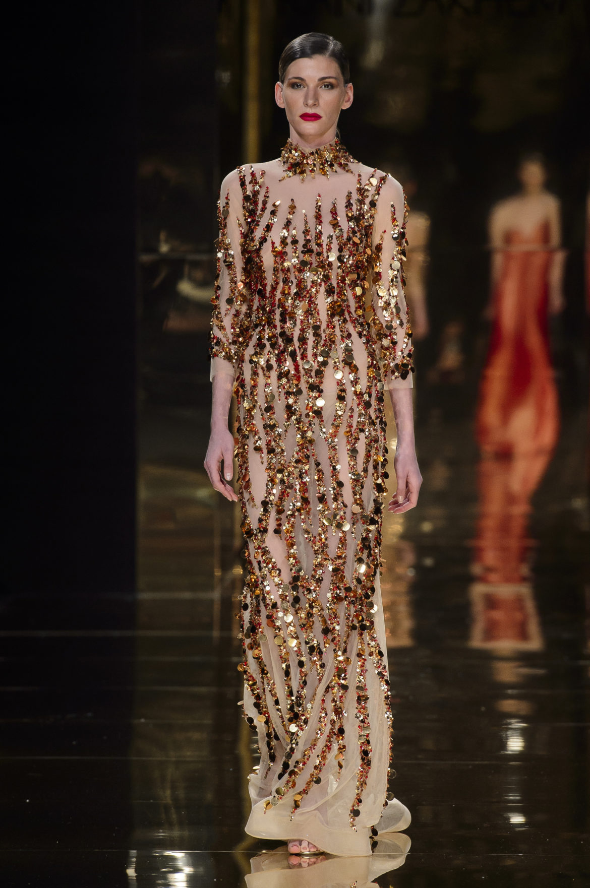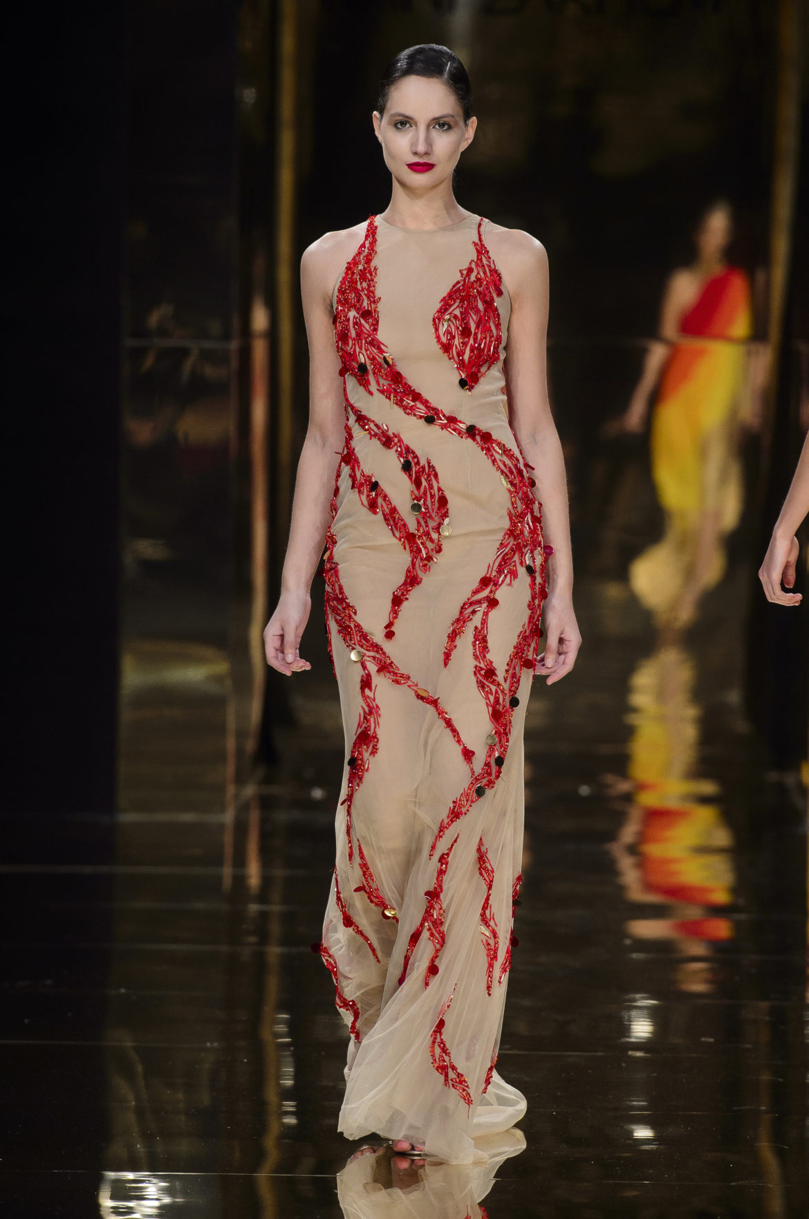 A l’évidence, le thème du feu, tantôt éteint et laissant de précieuses trainées de diamants dans la nuit de la soie ; tantôt liquide, bouillonnant en drapé de métal en fusion sur une robe courte à pan virevoltant, et tantôt doucement irisé de couleurs chaudes, n’est qu’un prétexte choisi par Rani Zakhem pour saluer les maîtres qui ont nourri sa vocation.