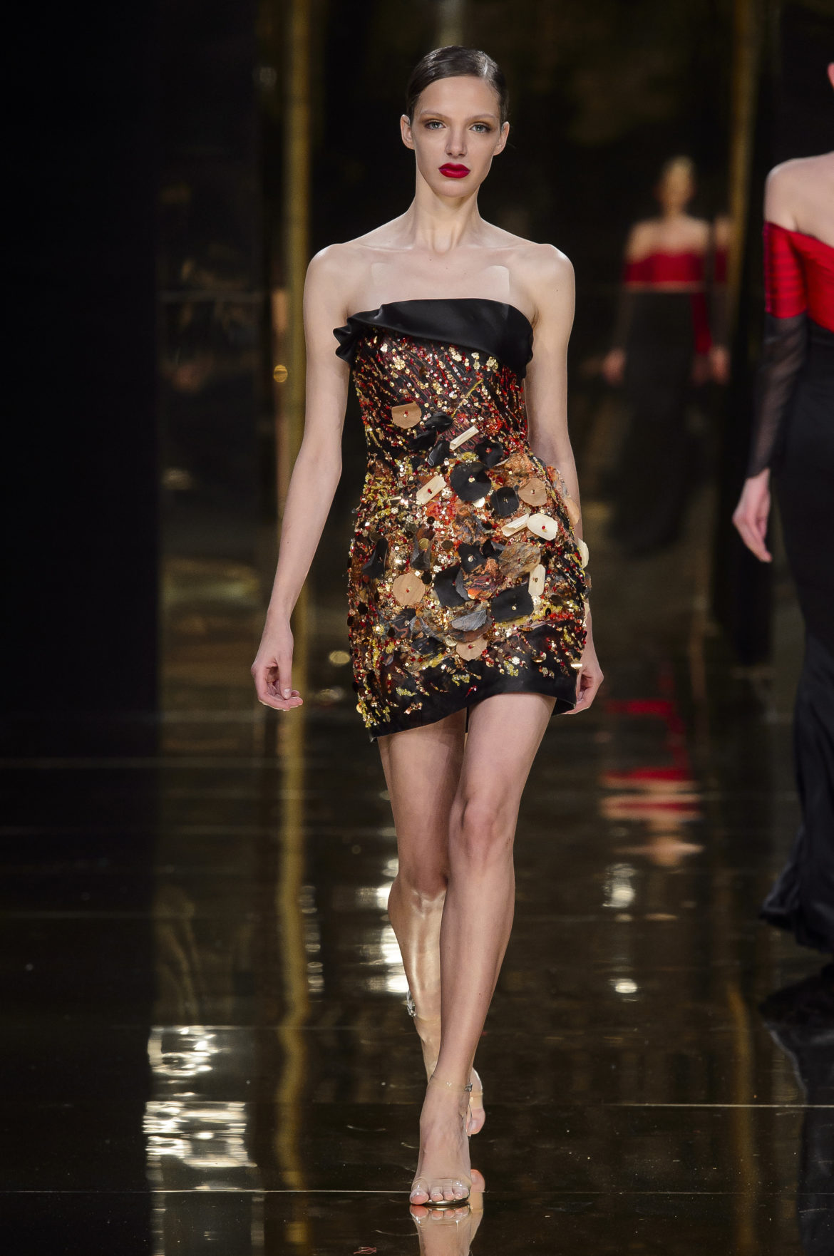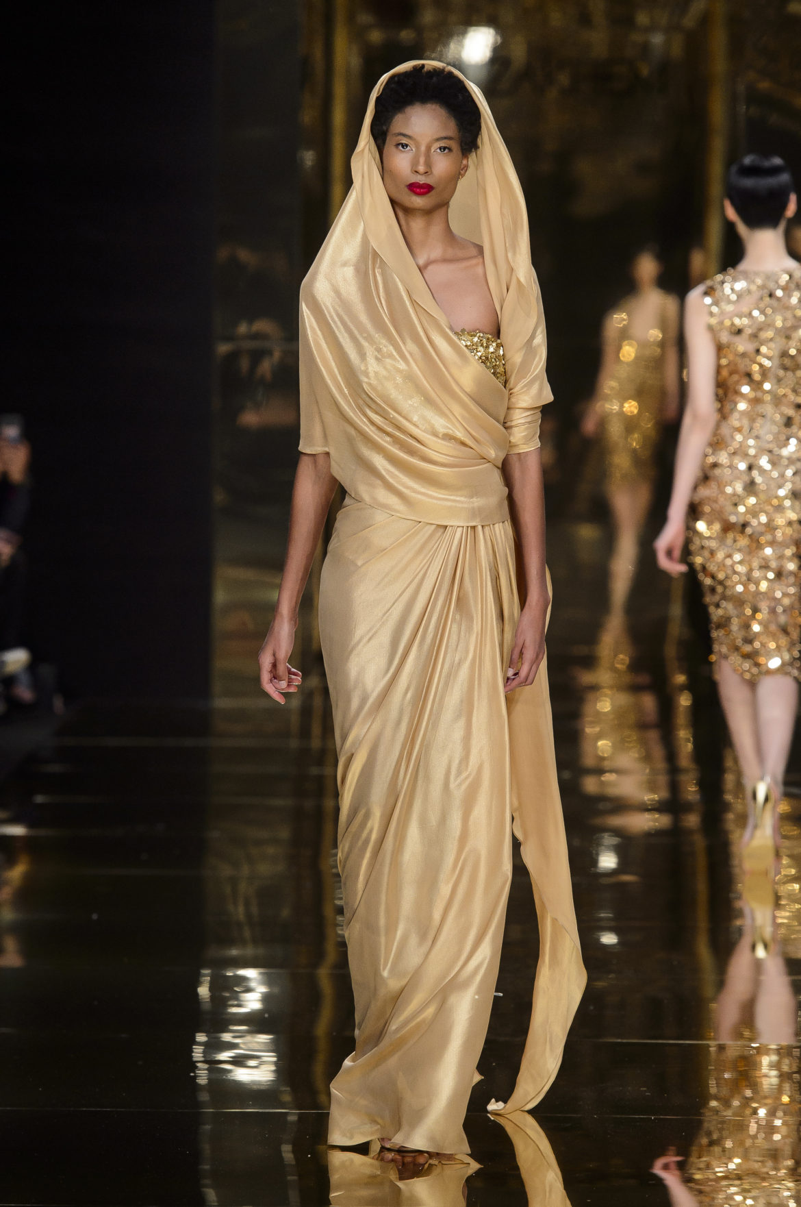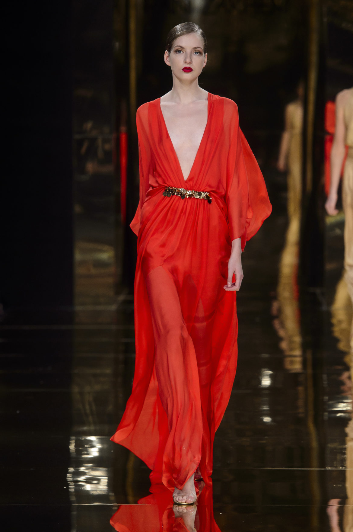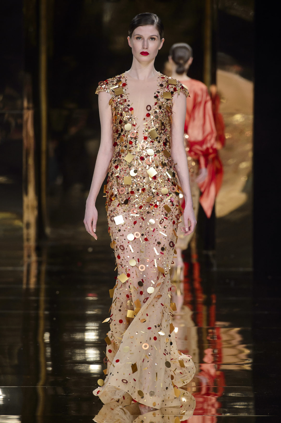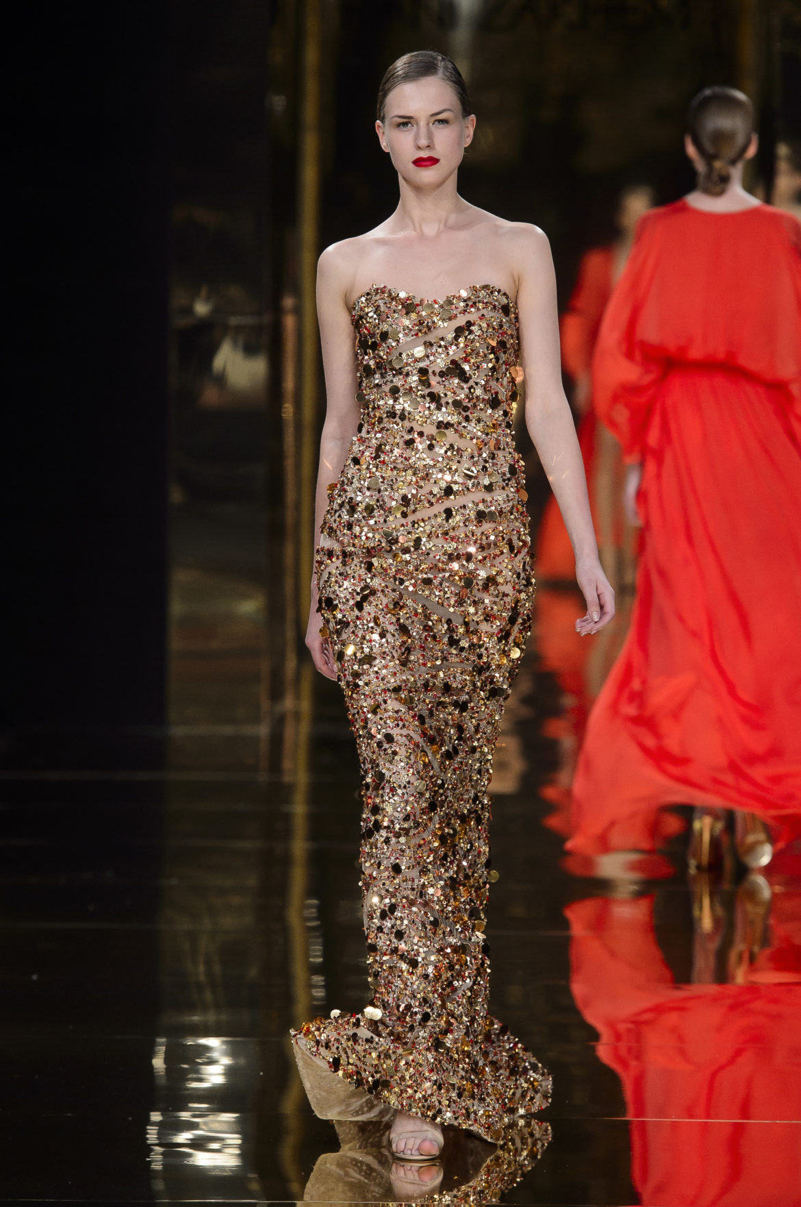 A l’évidence, le thème du feu, tantôt éteint et laissant de précieuses trainées de diamants dans la nuit de la soie ; tantôt liquide, bouillonnant en drapé de métal en fusion sur une robe courte à pan virevoltant, et tantôt doucement irisé de couleurs chaudes, n’est qu’un prétexte choisi par Rani Zakhem pour saluer les maîtres qui ont nourri sa vocation.