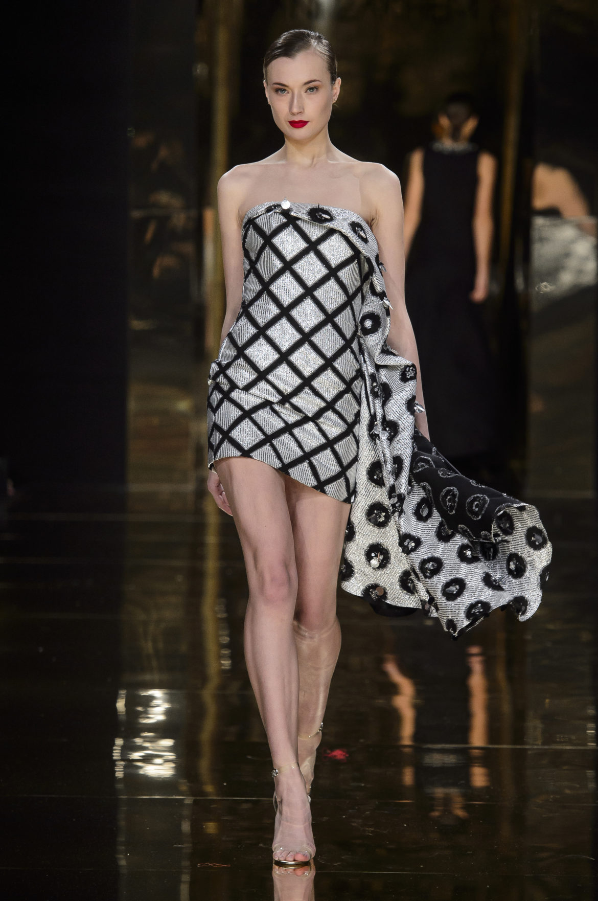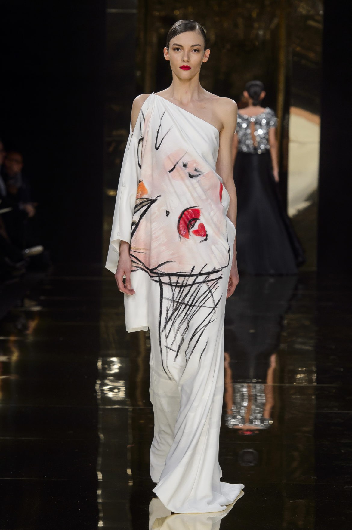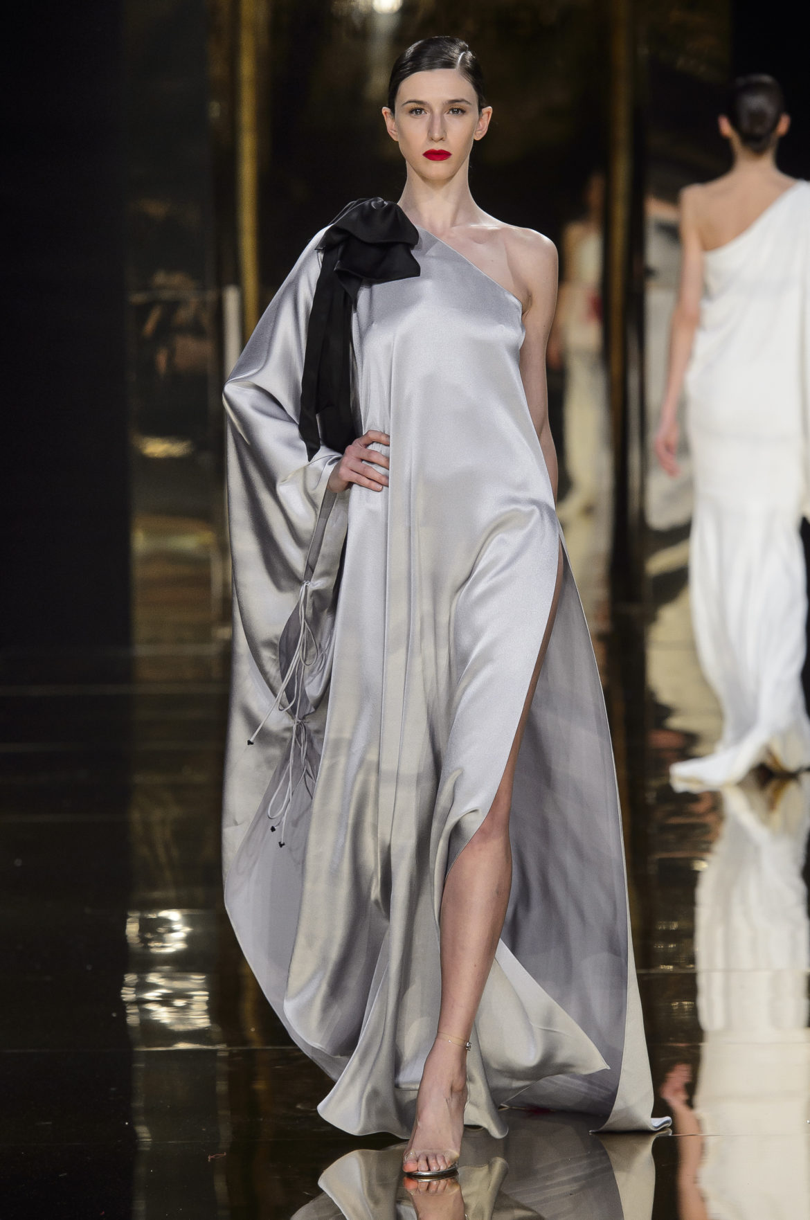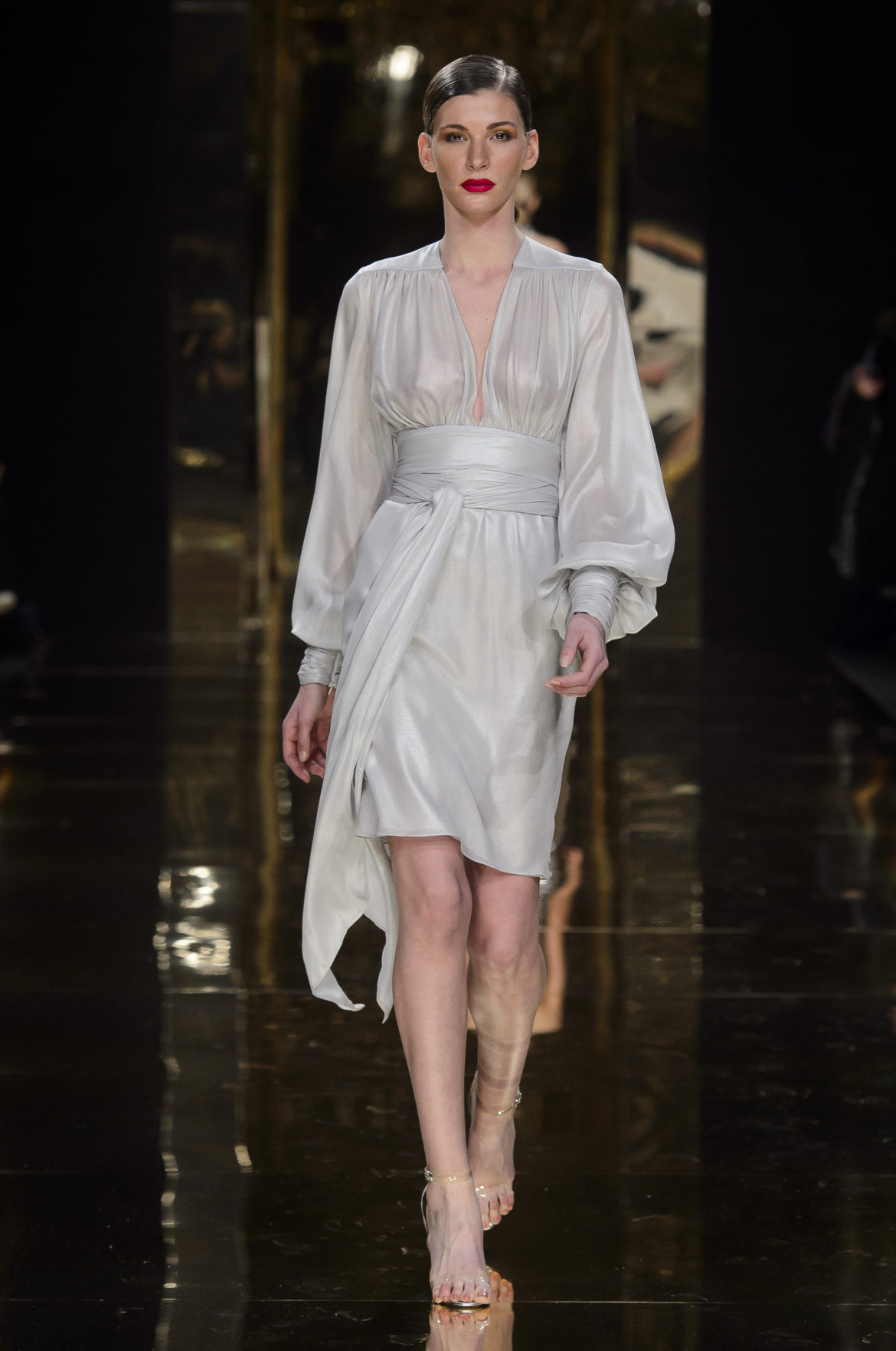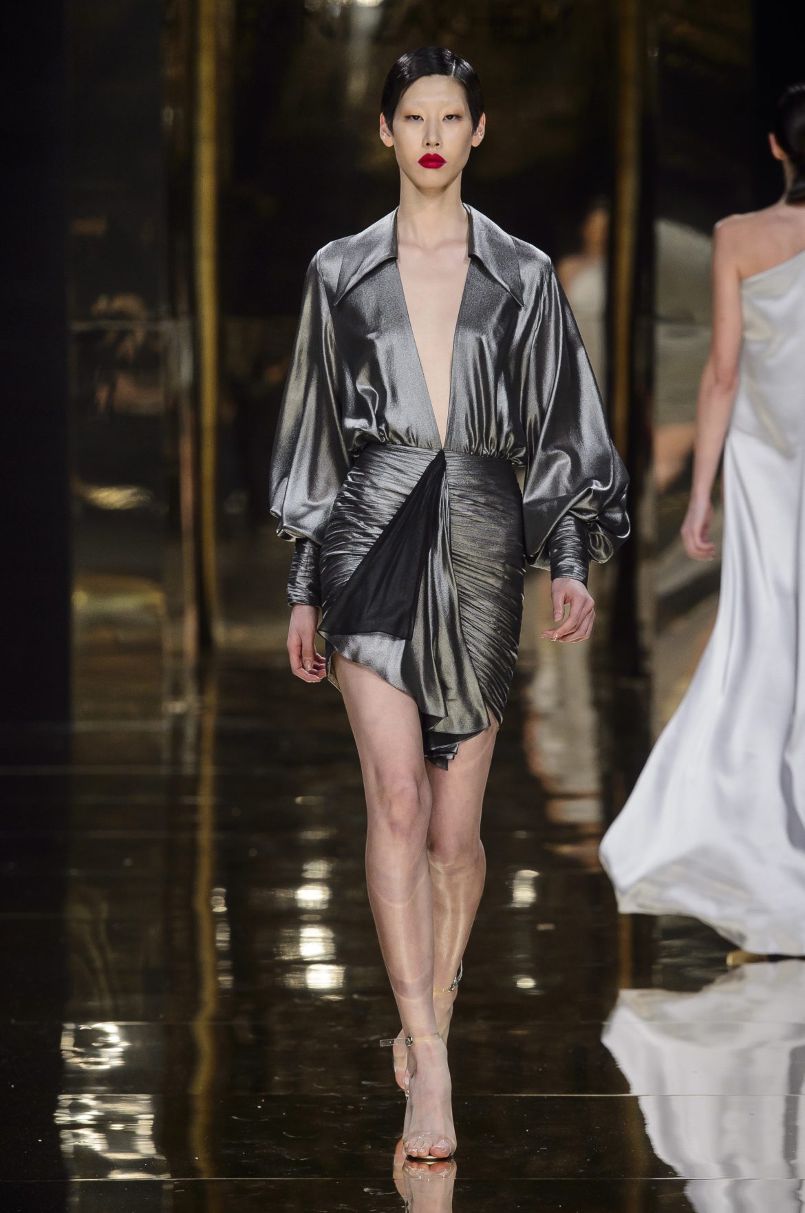 A l’évidence, le thème du feu, tantôt éteint et laissant de précieuses trainées de diamants dans la nuit de la soie ; tantôt liquide, bouillonnant en drapé de métal en fusion sur une robe courte à pan virevoltant, et tantôt doucement irisé de couleurs chaudes, n’est qu’un prétexte choisi par Rani Zakhem pour saluer les maîtres qui ont nourri sa vocation.