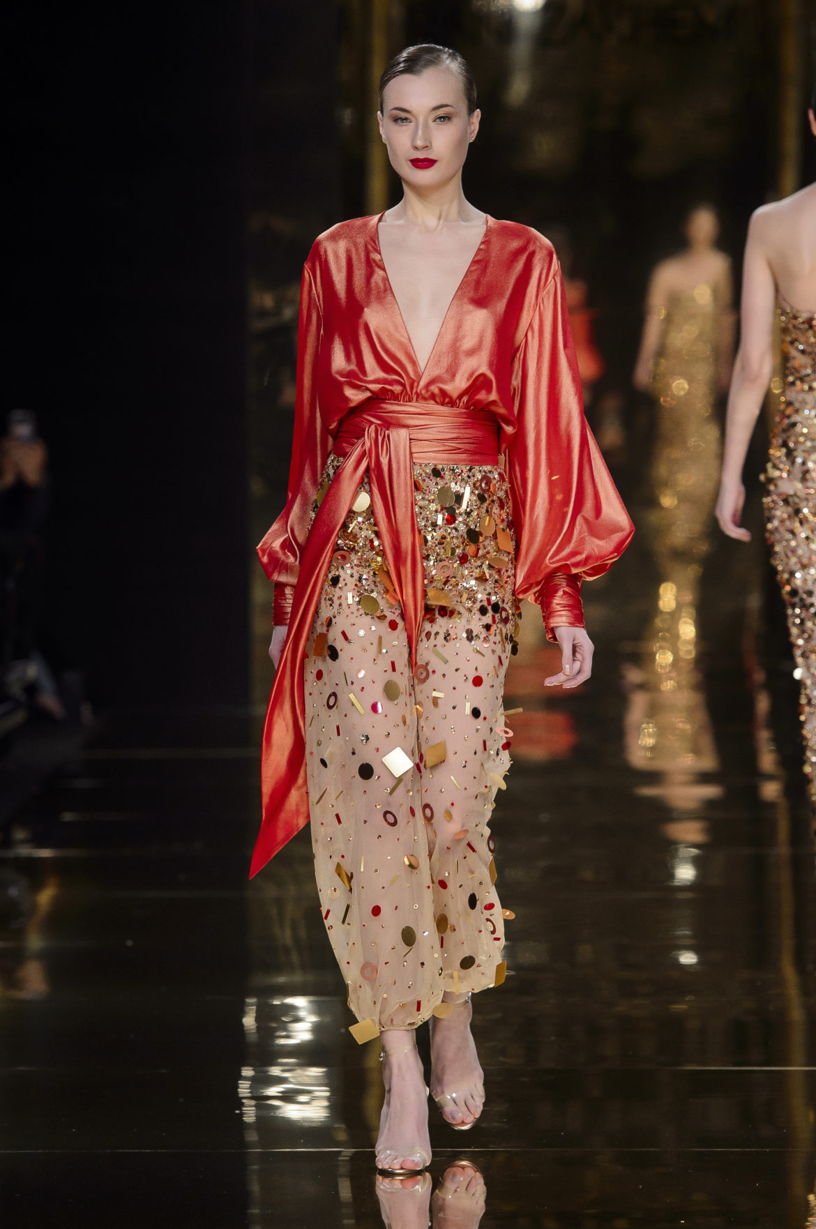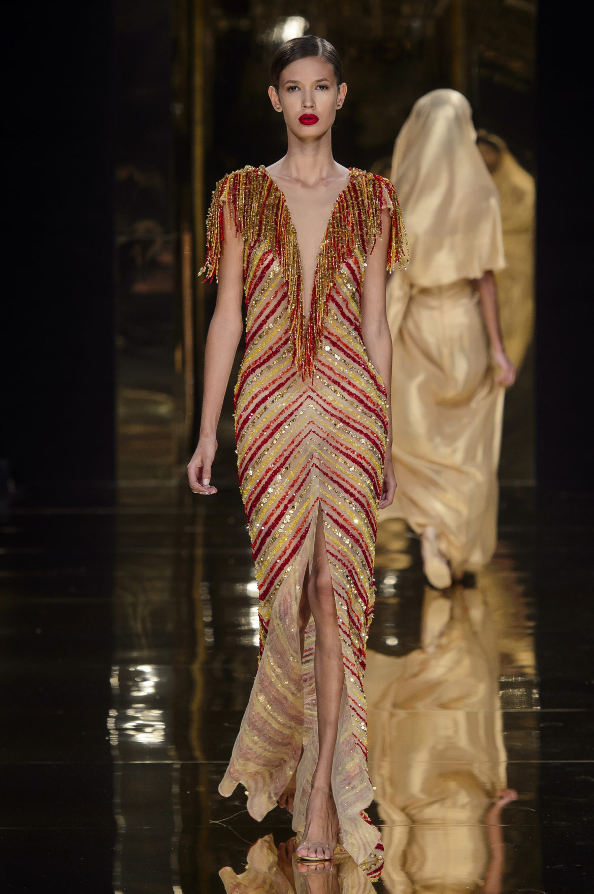 Fureur, ferveur, effervescence. Pour son premier défilé à Paris, Rani Zakhem célèbre la vie et la joie en métaphores incandescentes. Le feu est l’élément essentiel de cette collection à la fois somptueuse et décontractée, dédiée à une femme volcanique.