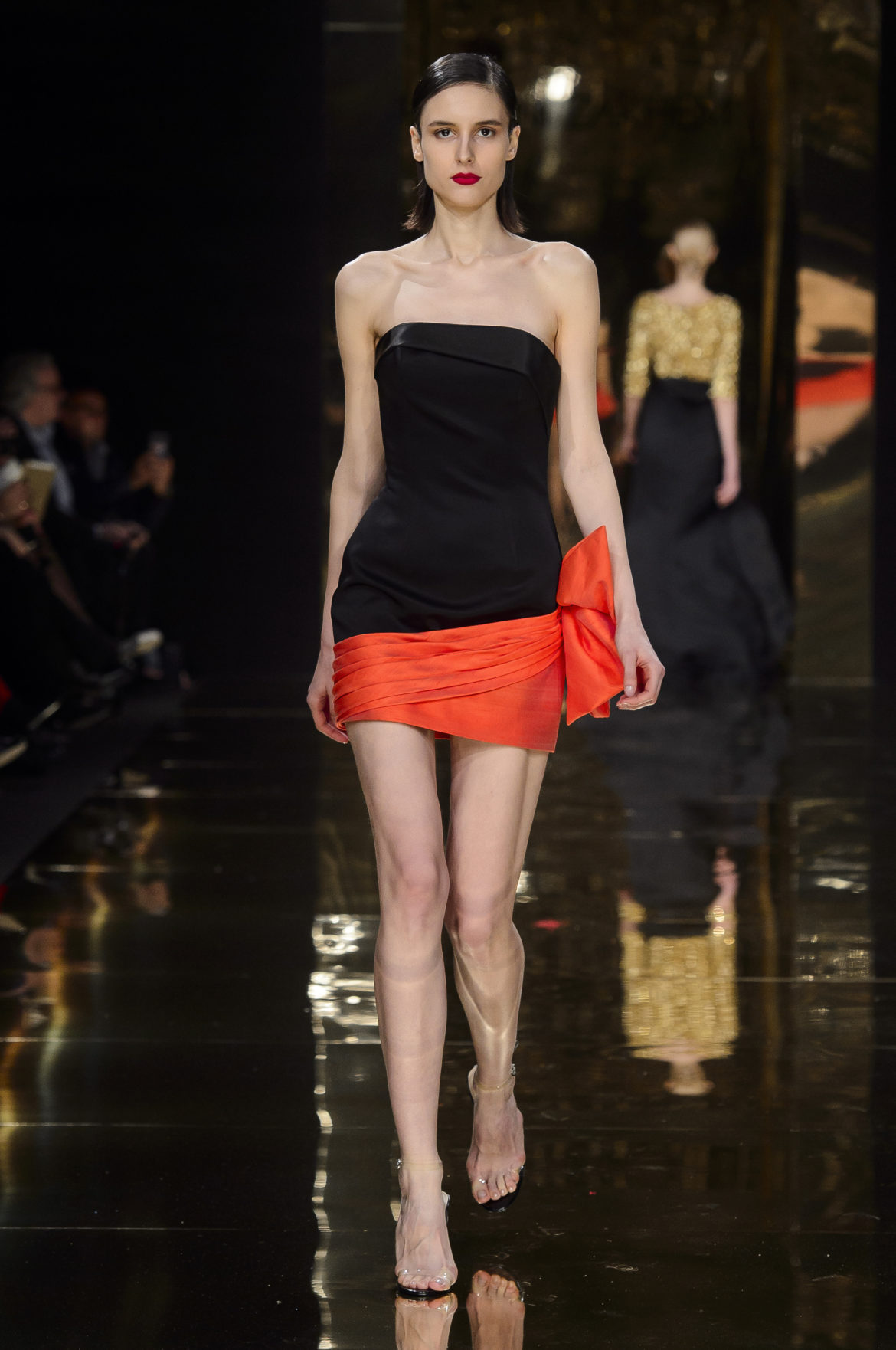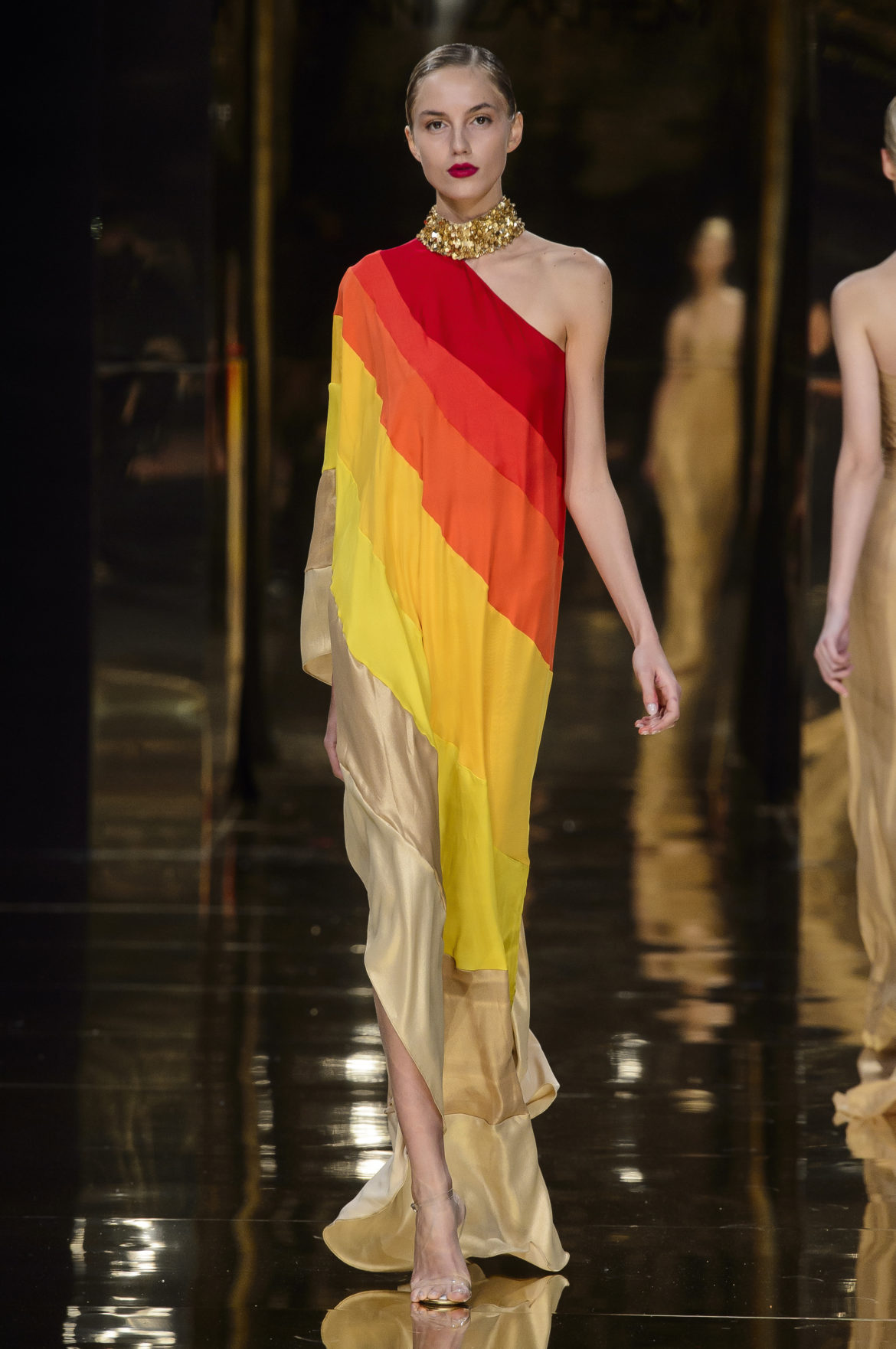 Réminiscence d’une fête à Vienne dont le créateur est rentré ébloui, le Baiser de Klimt, lui-même coulée d’or dans un poudroiement de poussière d’étoiles, souffle à la collection un vocabulaire visuel résolument moderniste, traduit en sequins de formes géométriques. Géométrie qui nous entraîne par ailleurs dans l’esprit discothèque des années 1970 avec de nombreuses références à Halston, notamment dans cette robe ample et fluide à épaule unique et col officier doré, dégradée en éventail, tel un arc-en-ciel ardent, de l’or au rouge en passant par le jaune et l’orange lumineux. L’or, encore, subtil et poudré, sculpte un fourreau en mousseline doré à la feuille, au bustier noué en cache-cœur et dos profondément décolleté, hommage à Mireille Darc et élégante citation de Guy Laroche.