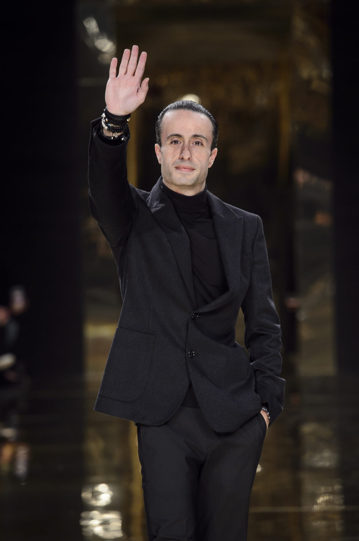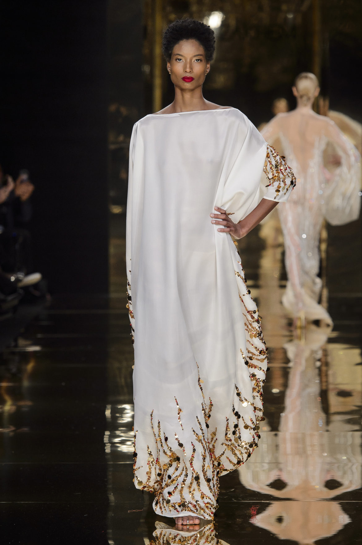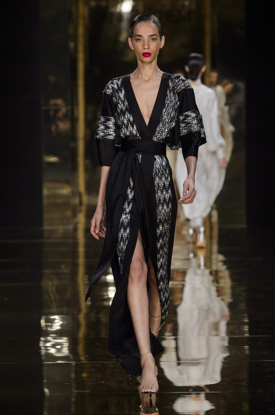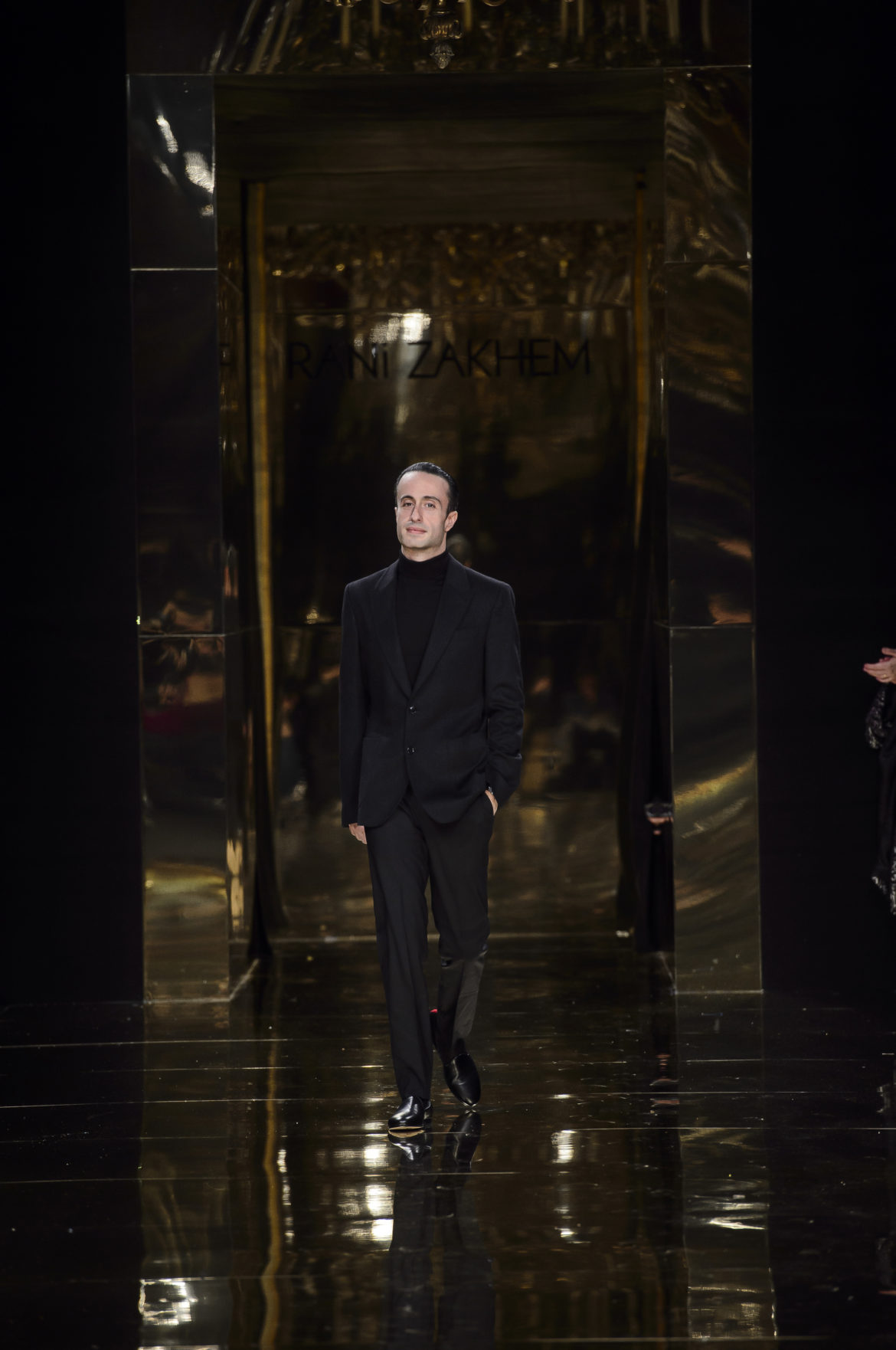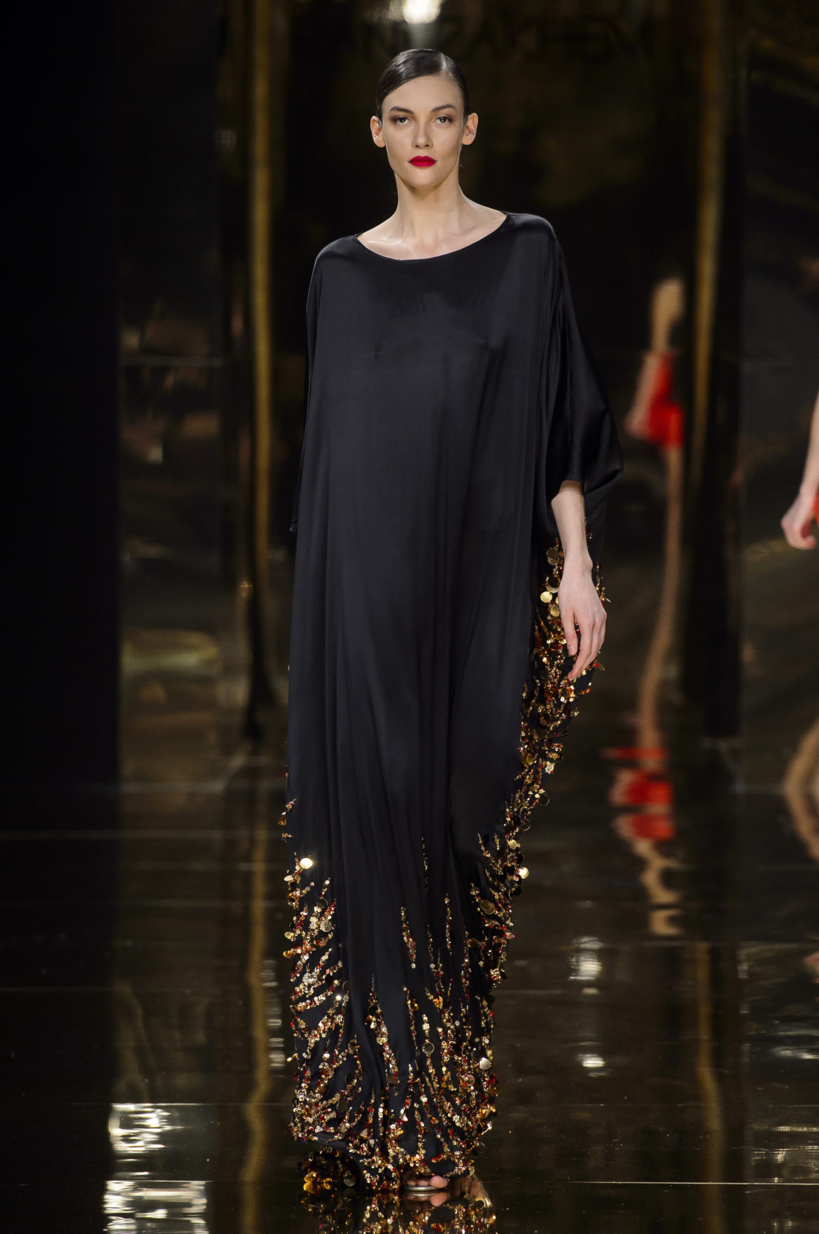 Un caftan de satin noir, brodé sur les bords de sequins d’or et au bas de motifs de flammes, rappelle l’Orient natal de Rani Zakhem et joue les traits d’union entre ses multiples cultures.