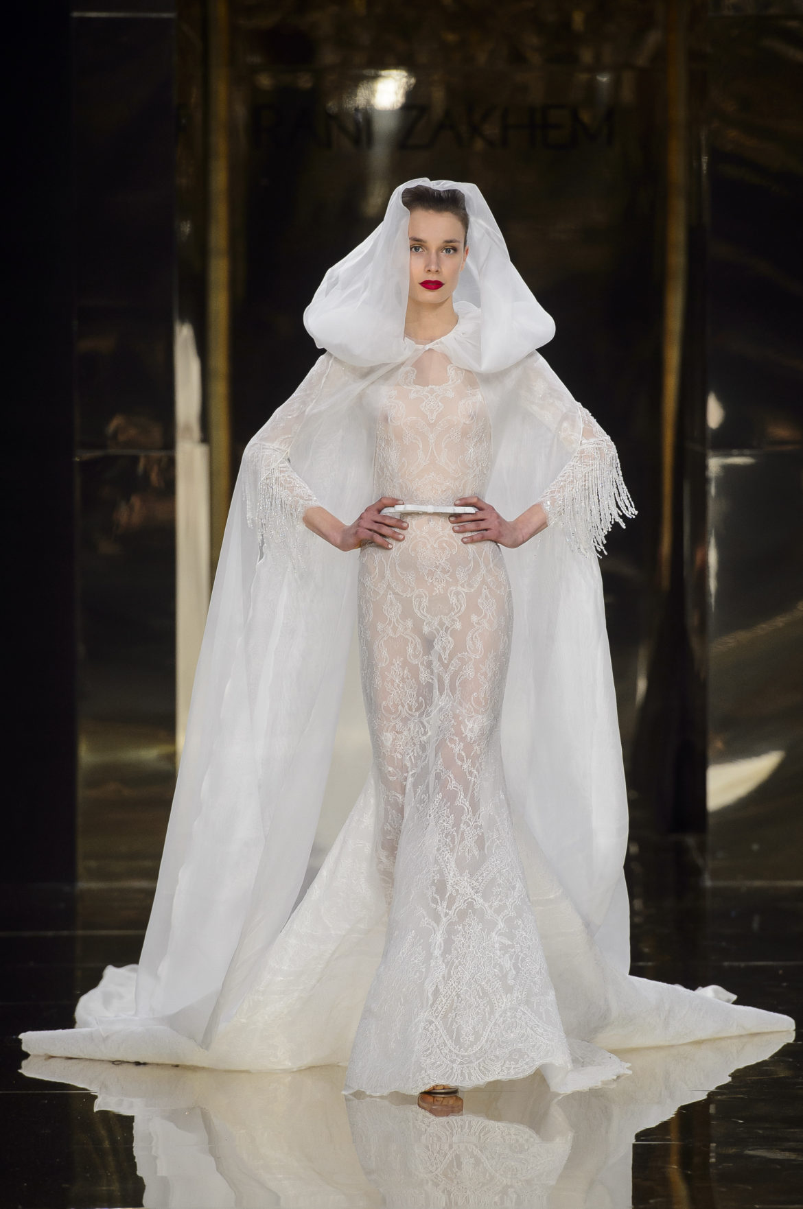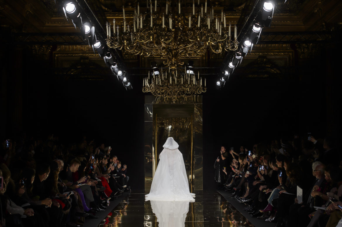 Délicate apothéose de ce défilé en forme de coulée de lave et de brasier mouvant, la robe de mariée, longue et moulante, en dentelle chantilly d’un blanc fragile, souligne par sa précieuse simplicité le parti pris minimaliste d’une collection à fleur d’émotion.