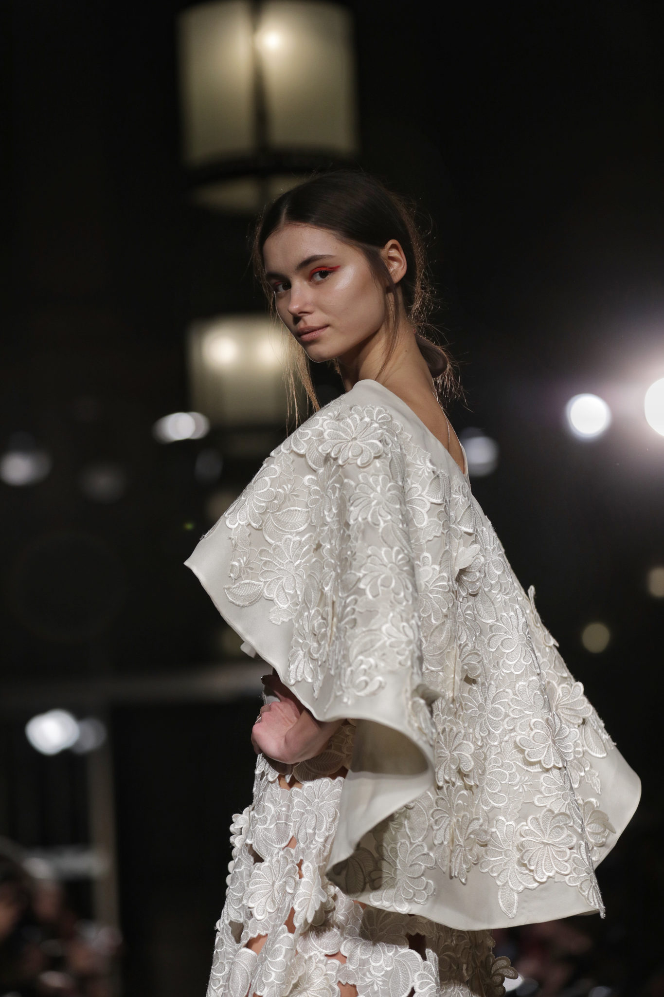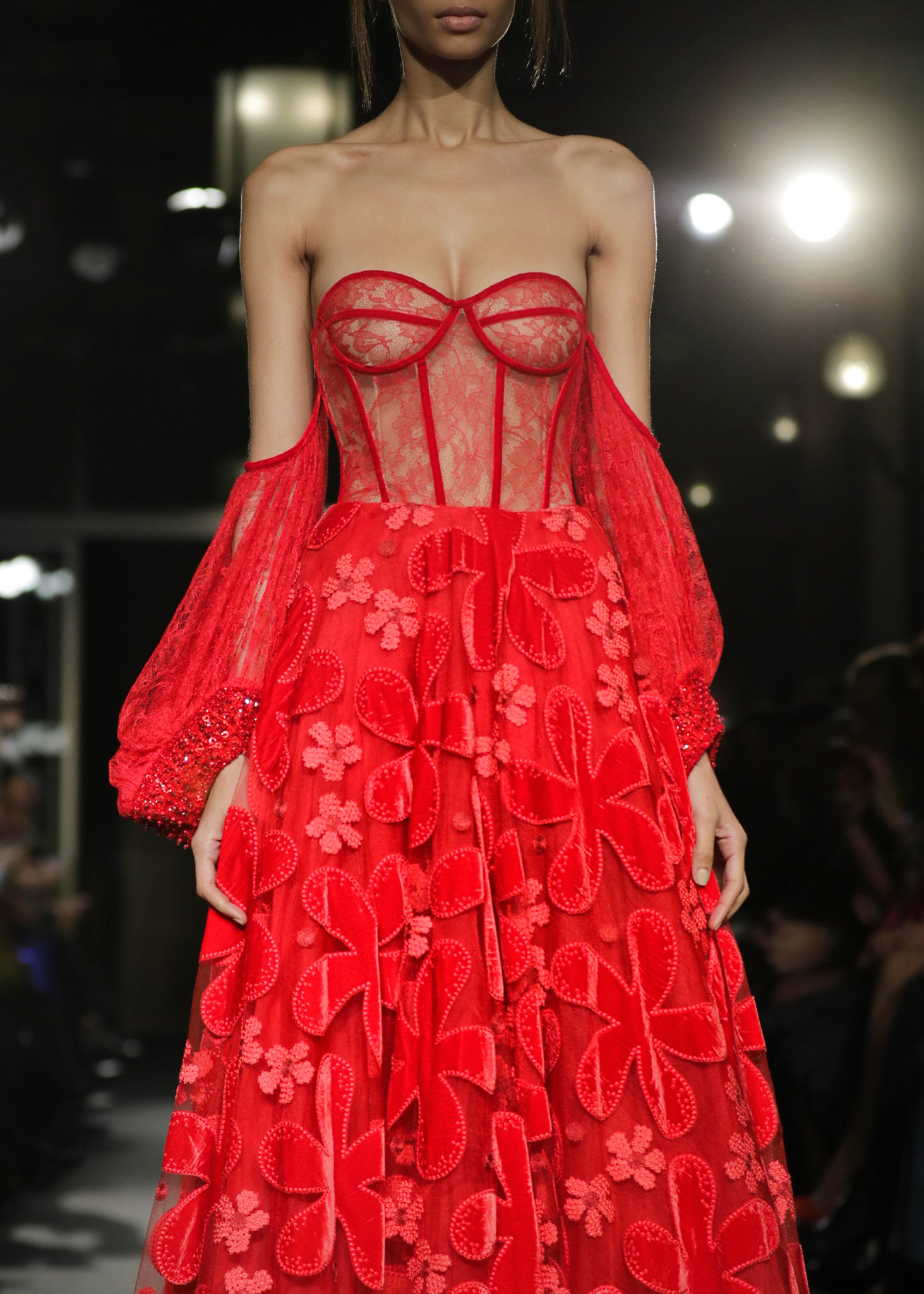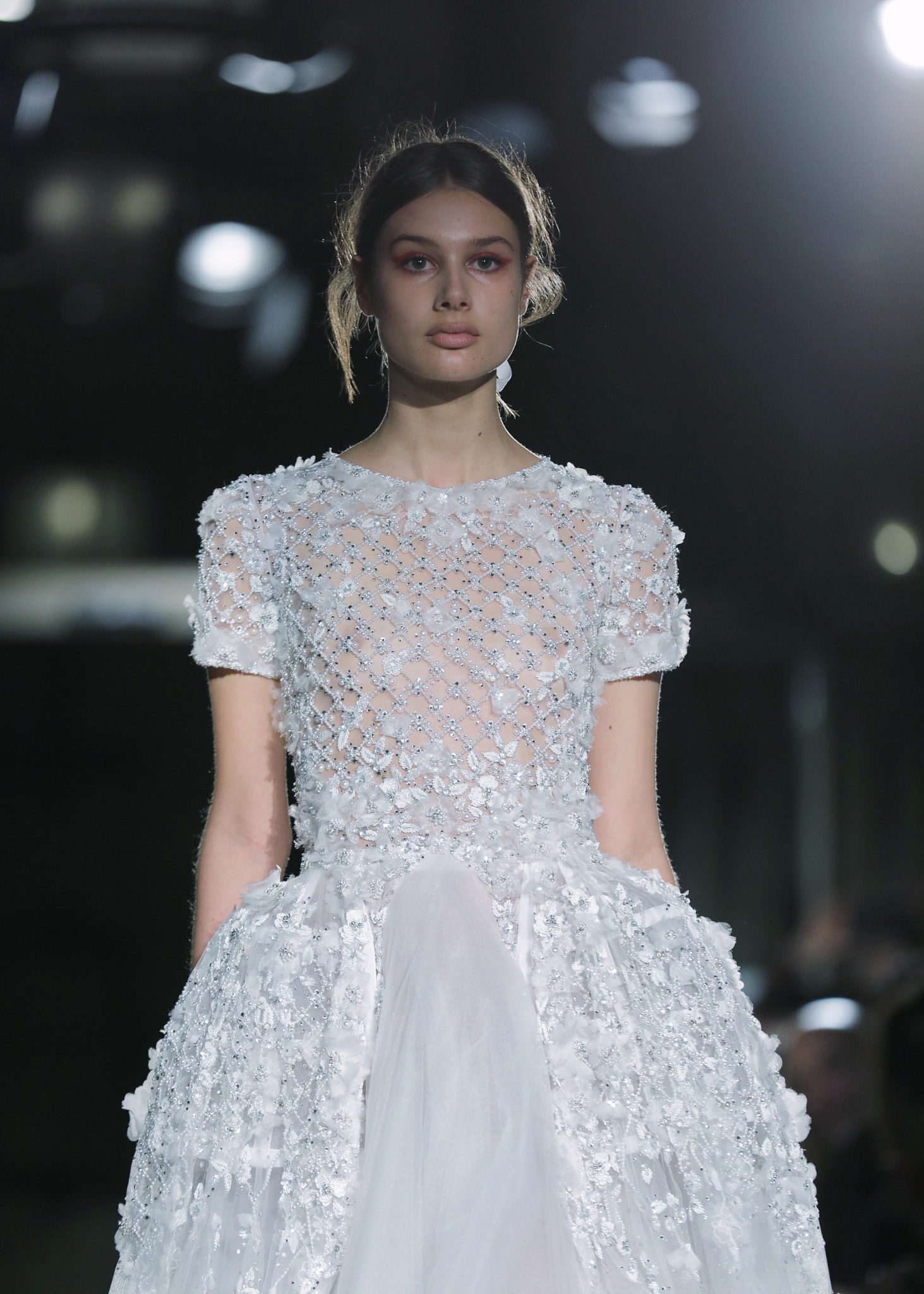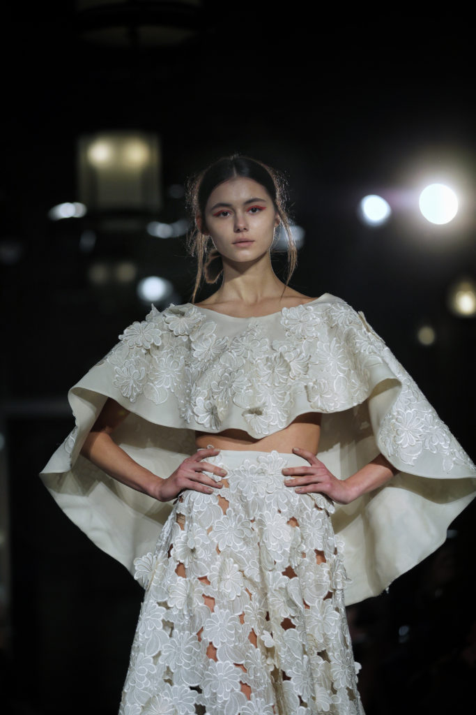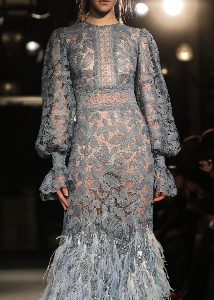 Les silhouettes se dévoilaient tout en raffinement, utilisant des matières autant que de détails précieux : les jupons se recouvraient ainsi de fleurs brodées et de dentelles de perles en cascade. Les bustiers se parsemaient de plumes, tout en légèreté comme empreintes de poésie…