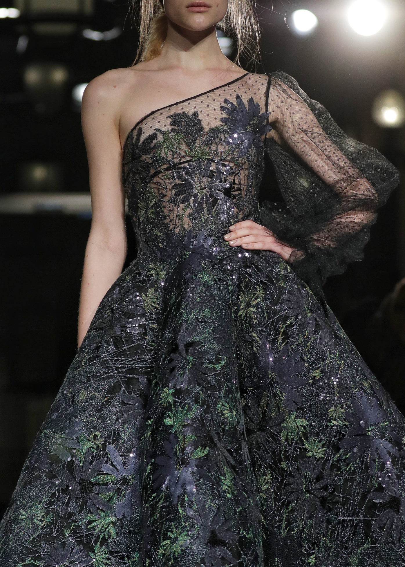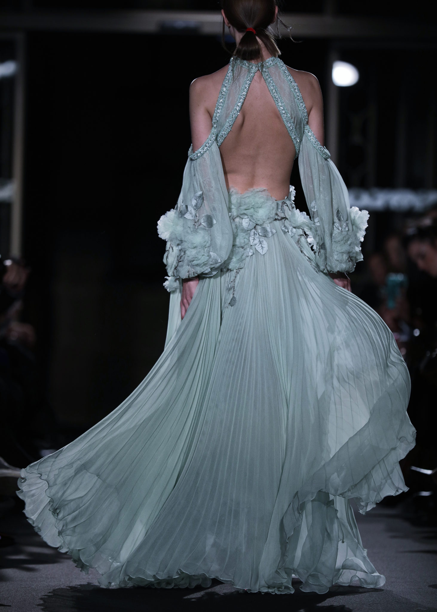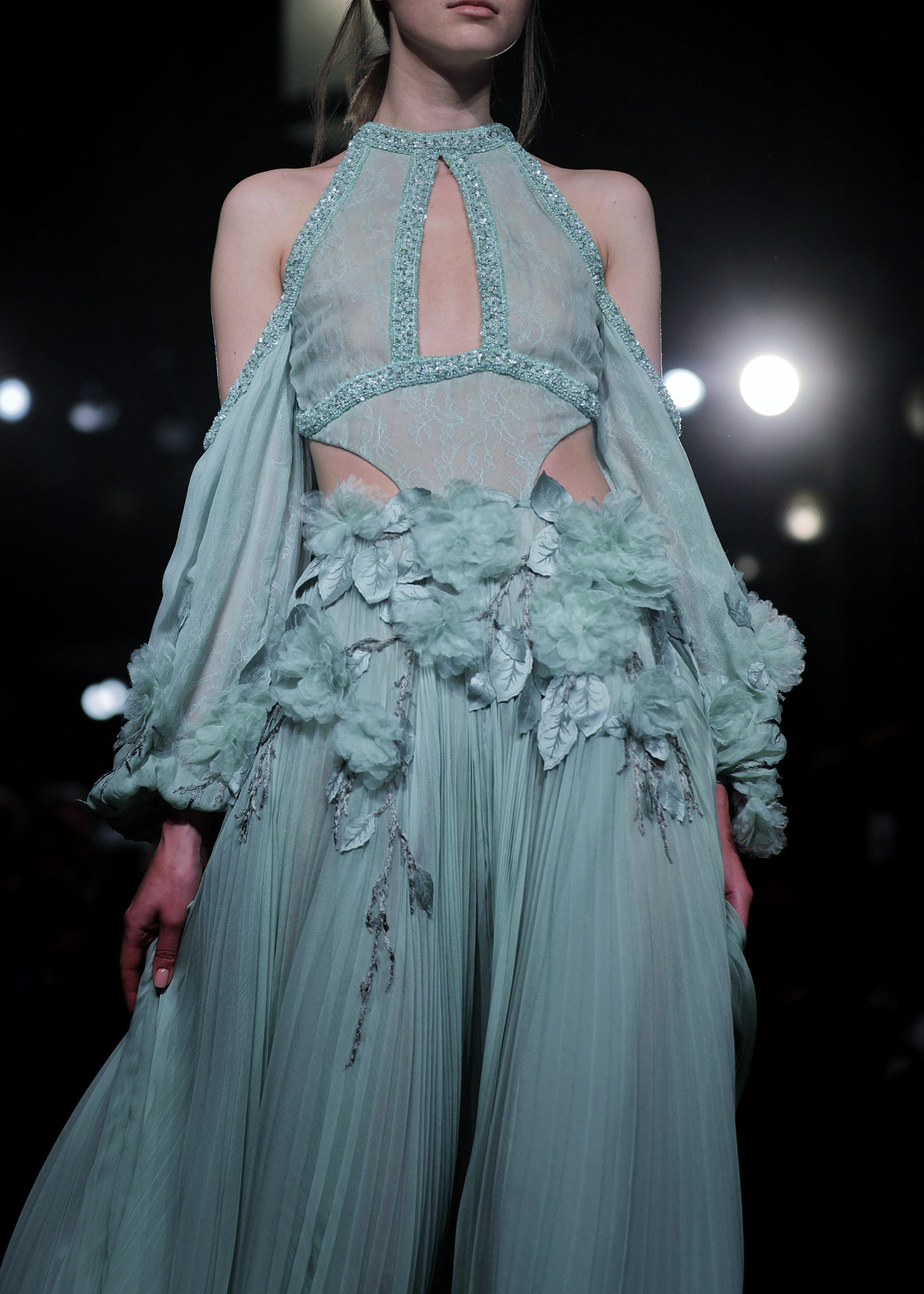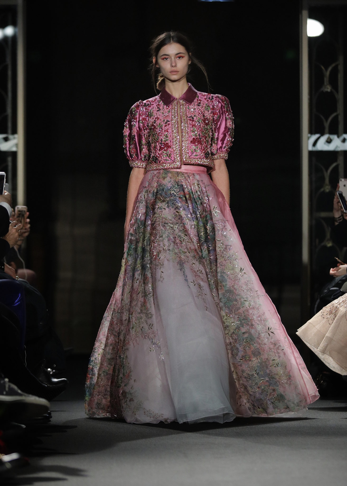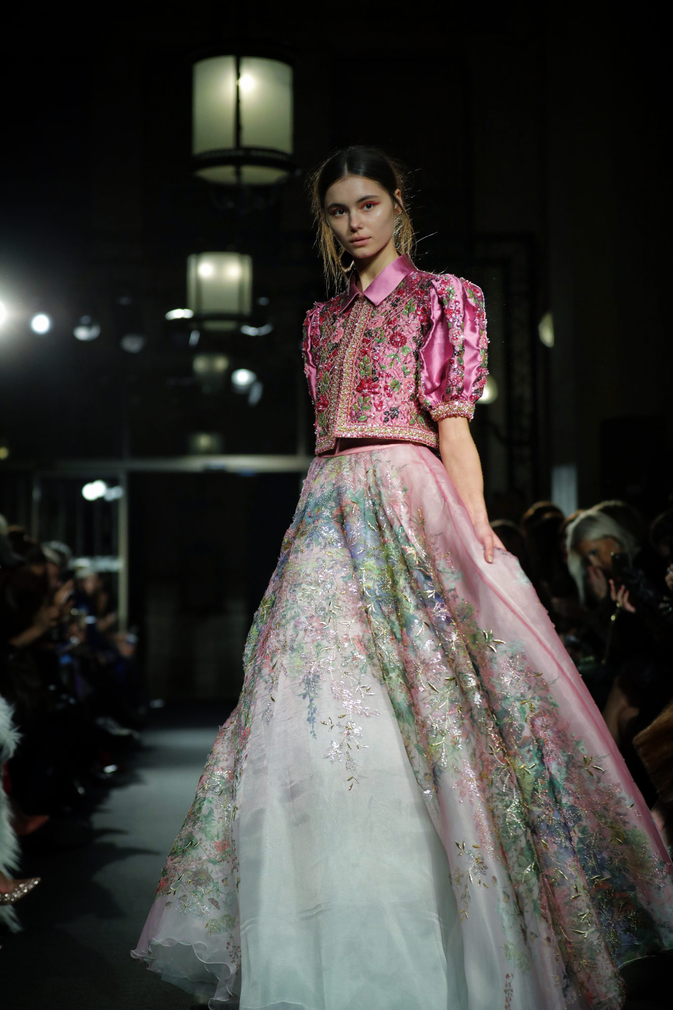 Les bleus poudrés, les blancs immaculés venaient contraster avec des nuances plus chaudes de pourpre aux dégradés insolents au travers de vestes courtes entièrement surpiquées de perles et sequins aux motifs de roses et de feuillage…