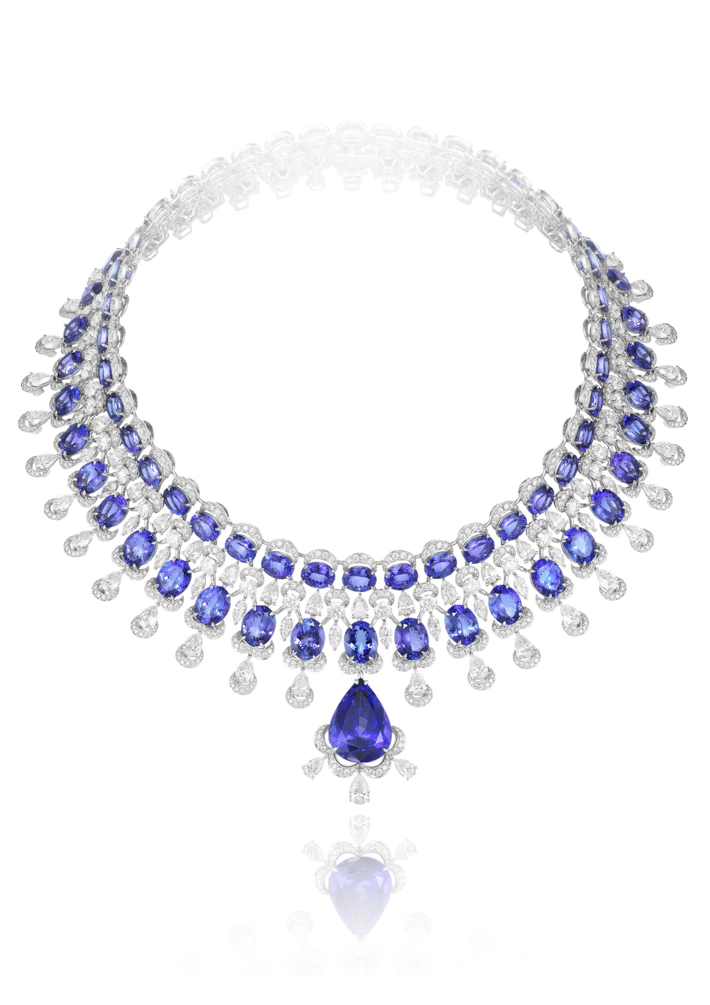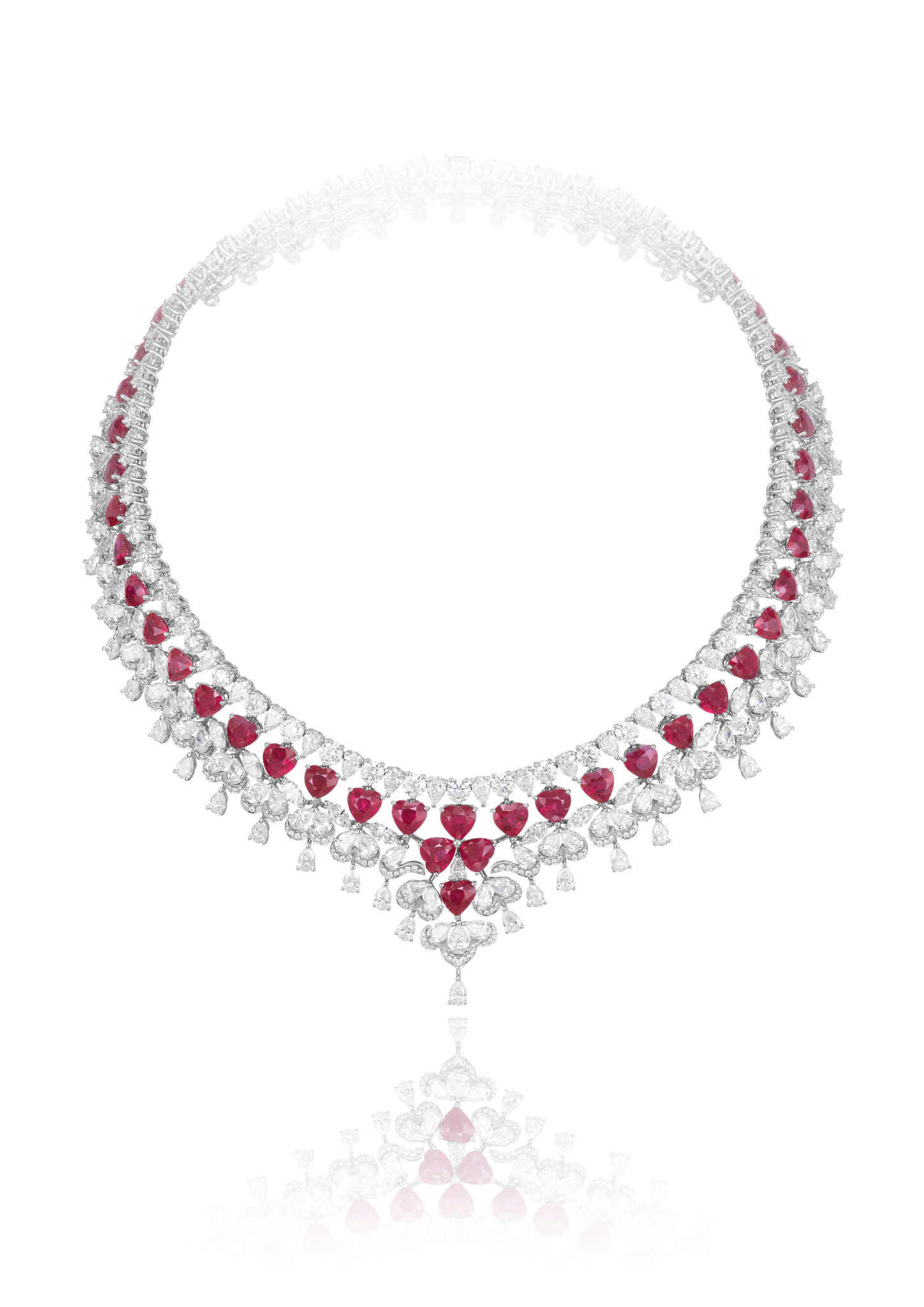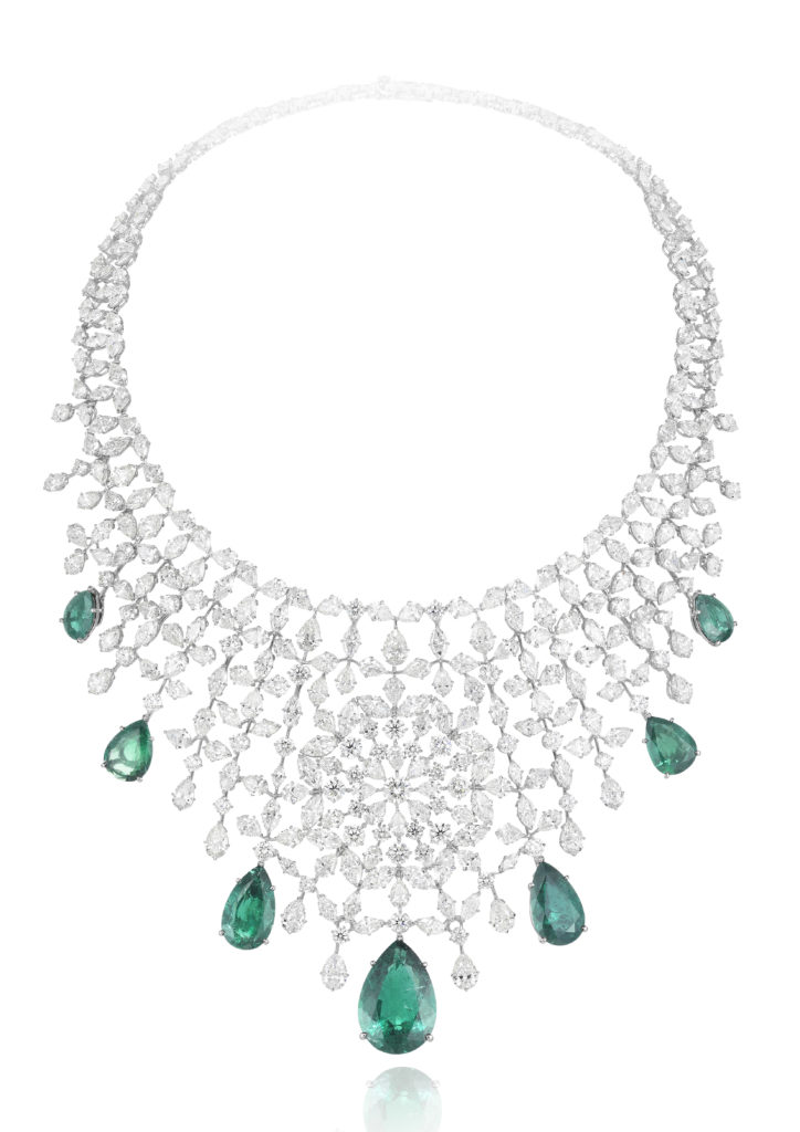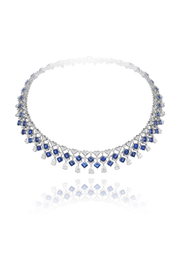 Parmi les créations qui composent ce répertoire, une majestueuse parure de diamants et tanzanites se composent d’un collier, d’une bague et de boucles d’oreilles assorties, tandis qu’un collier déploie sa guipure de diamants sur le décolleté, couronné par l’éclat de sept émeraudes taille poire. On s’émerveille encore devant une remarquable parure de diamants et rubis, composée d’une paire de boucles d’oreilles chandelier et d’un tour de cou dont la dentelle de diamants se mêle de rubis taille cœur – facétieuse, précieuse et flamboyante.