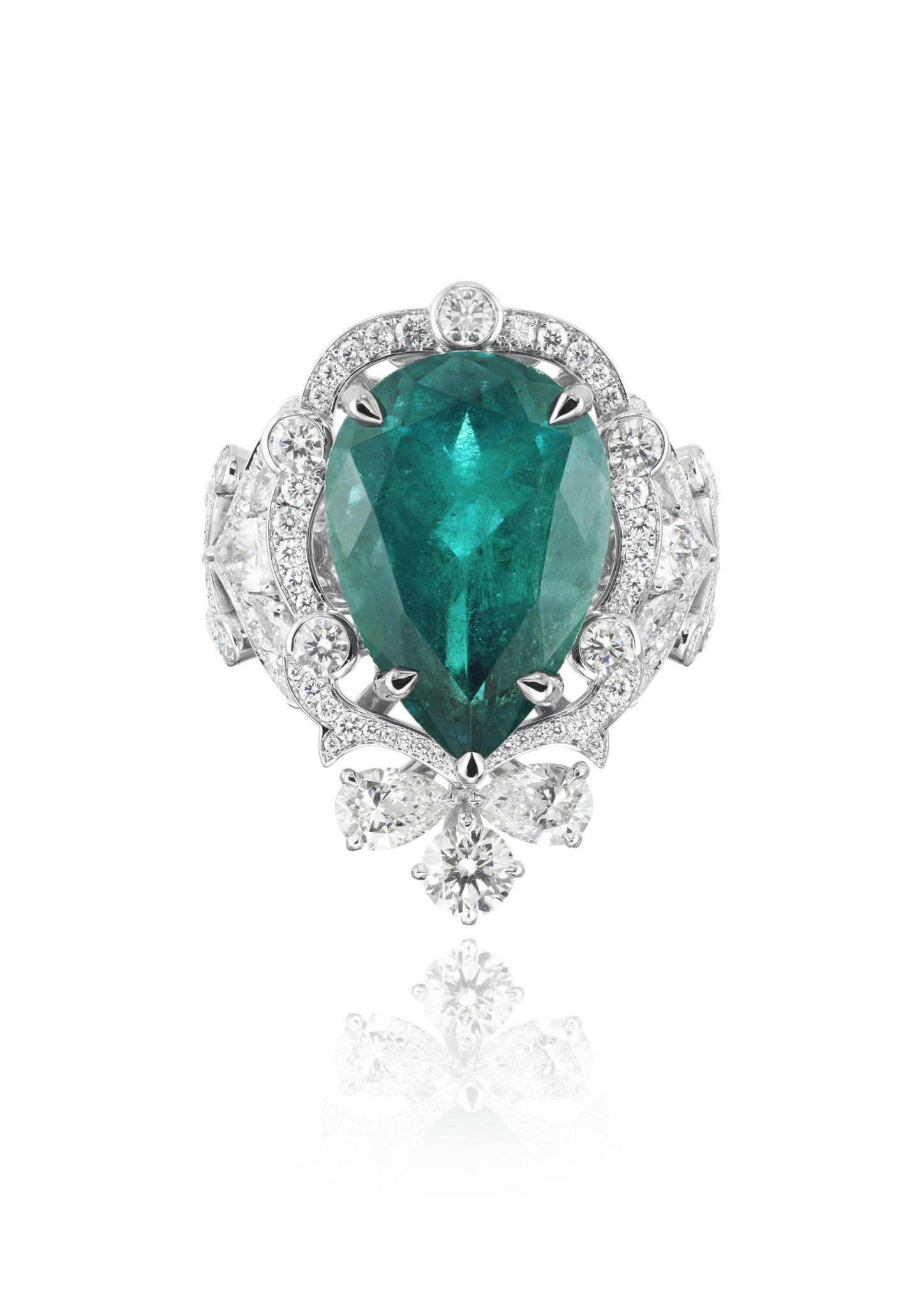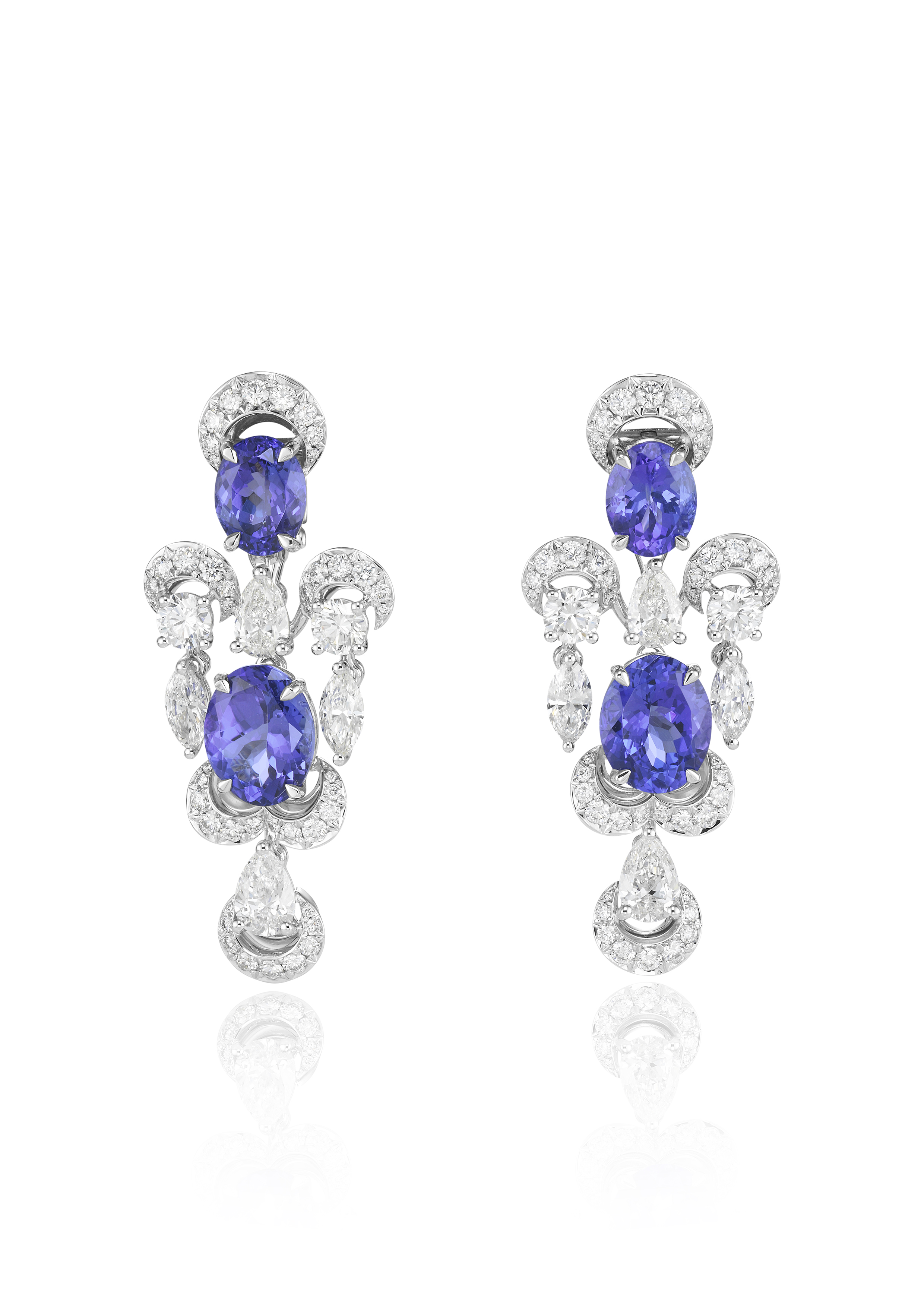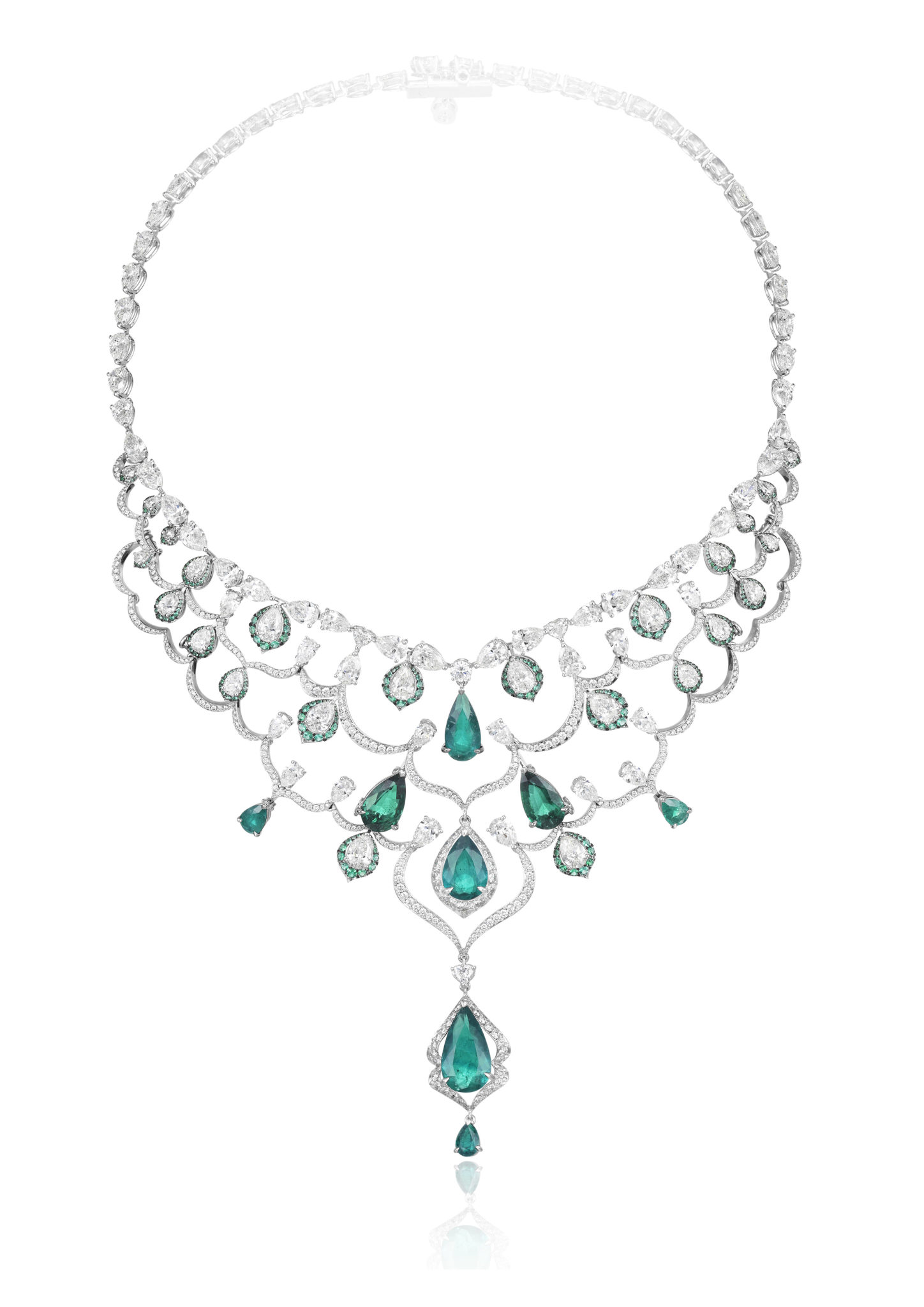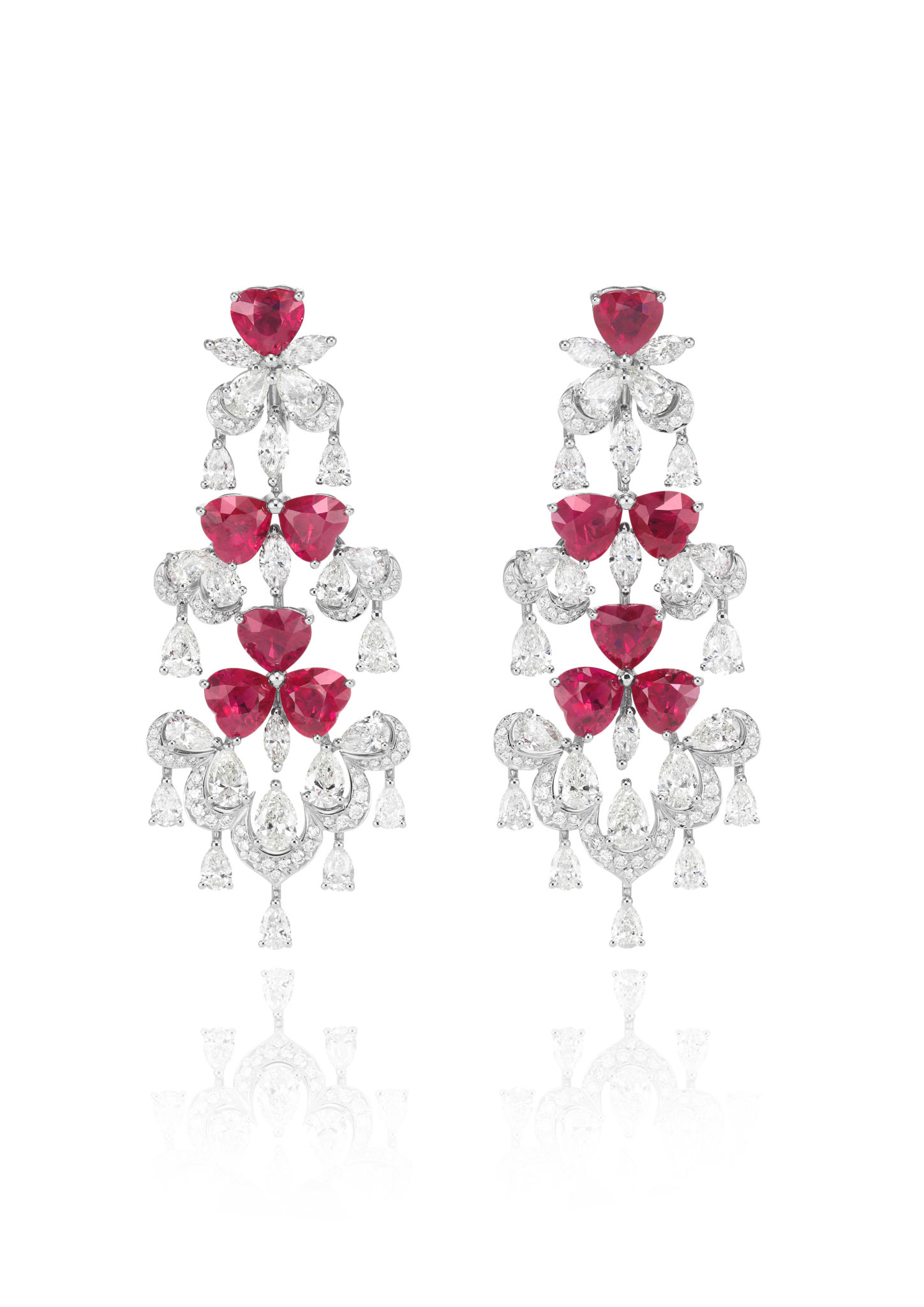 Parmi les créations qui composent ce répertoire, une majestueuse parure de diamants et tanzanites se composent d’un collier, d’une bague et de boucles d’oreilles assorties, tandis qu’un collier déploie sa guipure de diamants sur le décolleté, couronné par l’éclat de sept émeraudes taille poire. On s’émerveille encore devant une remarquable parure de diamants et rubis, composée d’une paire de boucles d’oreilles chandelier et d’un tour de cou dont la dentelle de diamants se mêle de rubis taille cœur – facétieuse, précieuse et flamboyante.