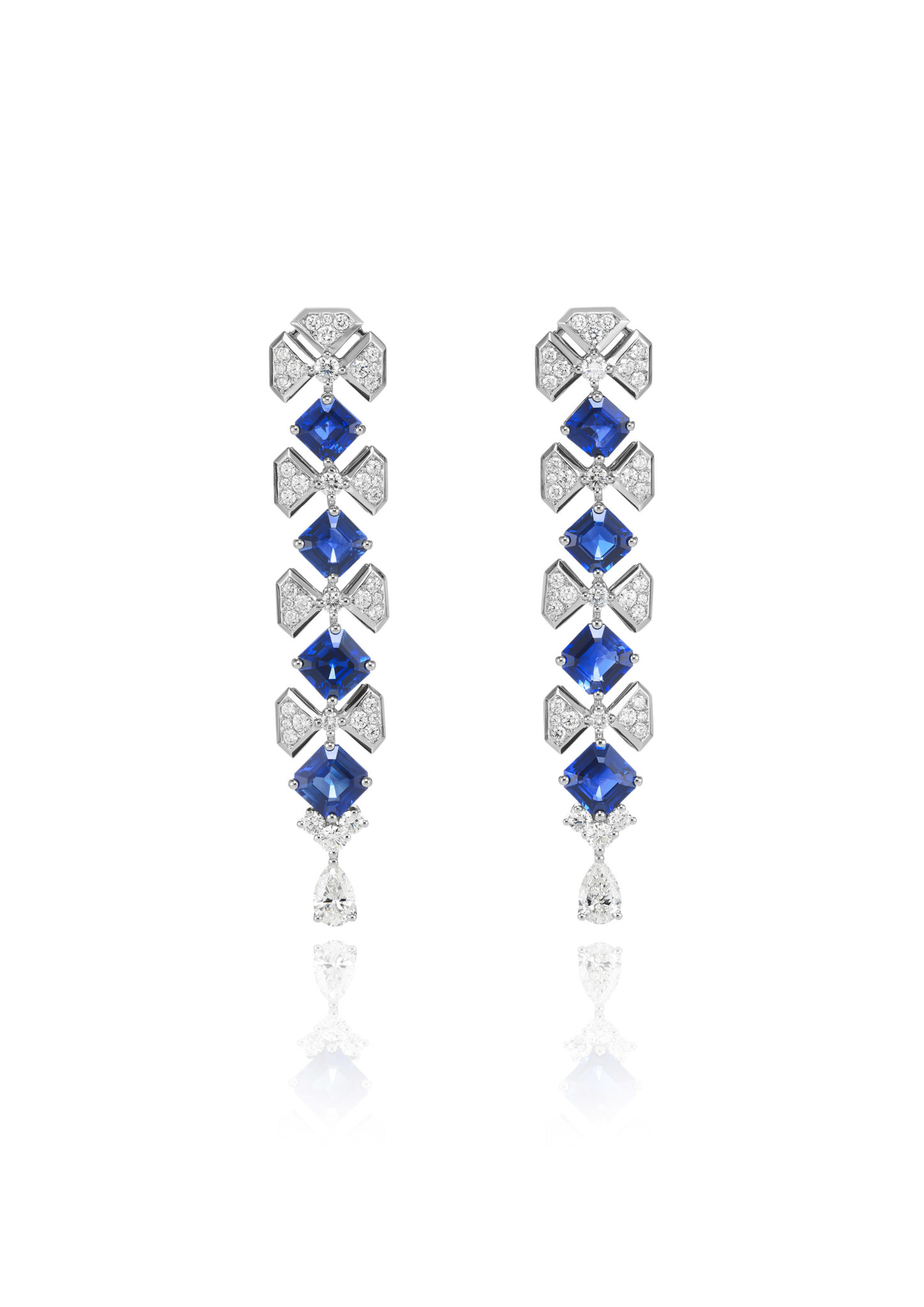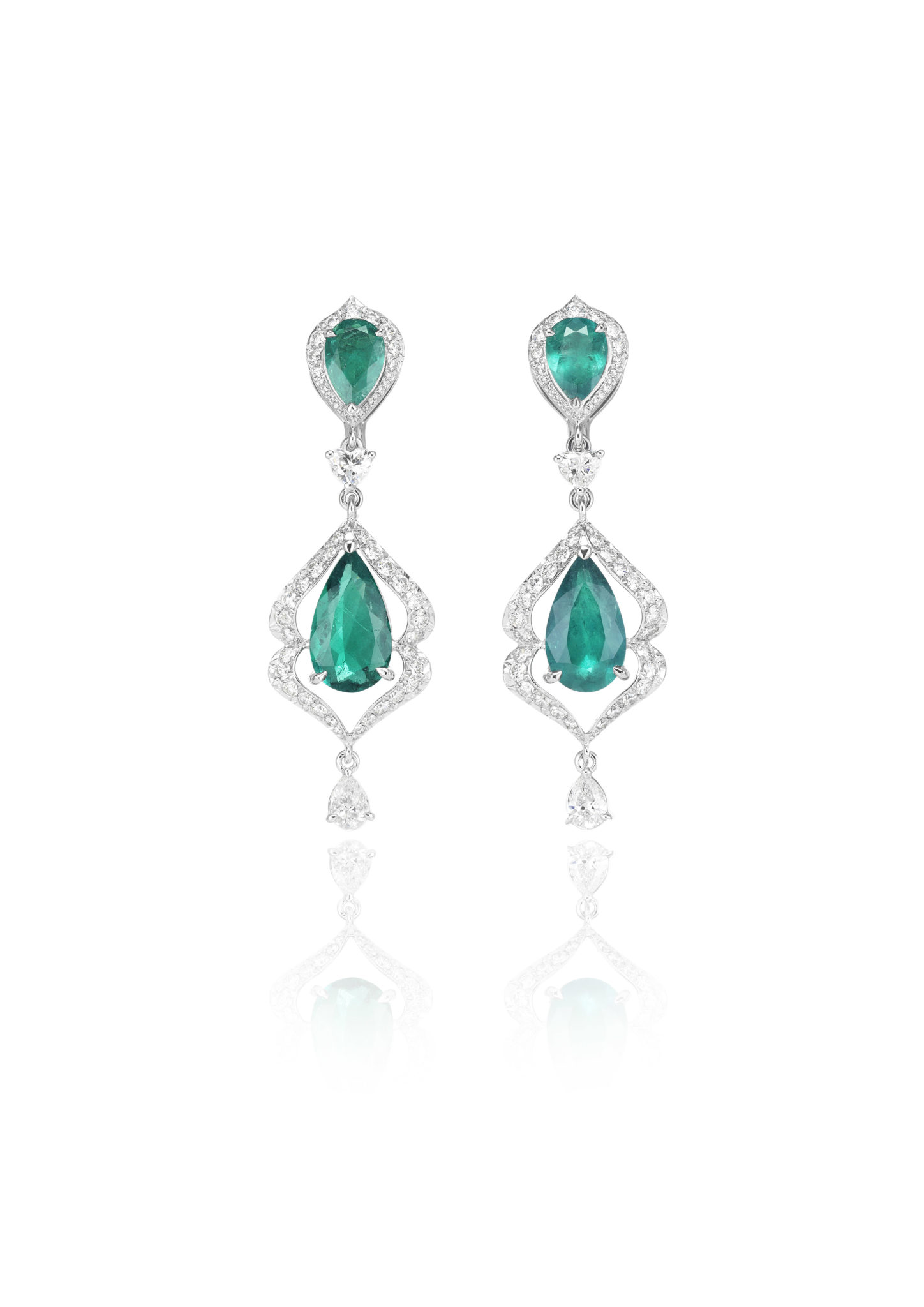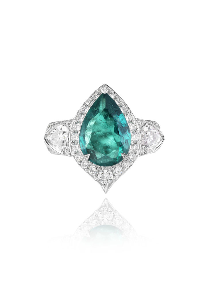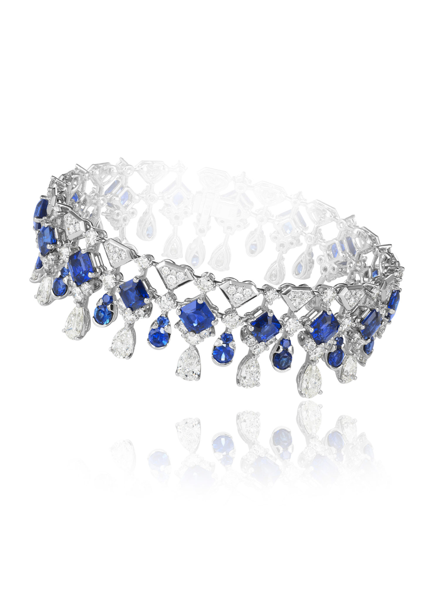 Parmi les créations qui composent ce répertoire, une majestueuse parure de diamants et tanzanites se composent d’un collier, d’une bague et de boucles d’oreilles assorties, tandis qu’un collier déploie sa guipure de diamants sur le décolleté, couronné par l’éclat de sept émeraudes taille poire. On s’émerveille encore devant une remarquable parure de diamants et rubis, composée d’une paire de boucles d’oreilles chandelier et d’un tour de cou dont la dentelle de diamants se mêle de rubis taille cœur – facétieuse, précieuse et flamboyante.