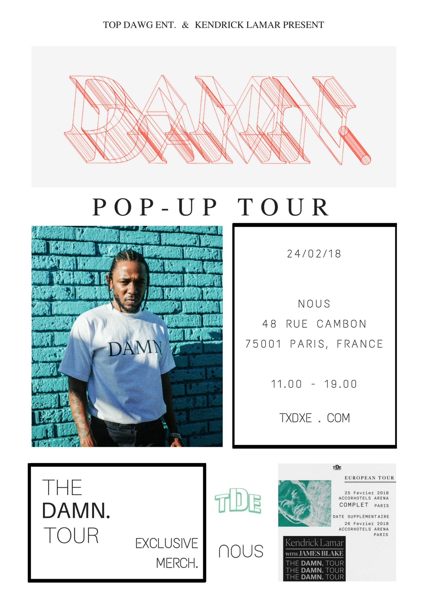À l’occasion de la tournée internationale Kendrick Lamar (lauréat de 7 Grammy Awards) et pour la première fois en France, « nous » le concept- store phénomène de la rue Cambon, accueille THE DAMN. POP UP et propose en exclusivité sa collection en édition limitée qui sera dévoilée dès le samedi 24 février 2018 à 11h