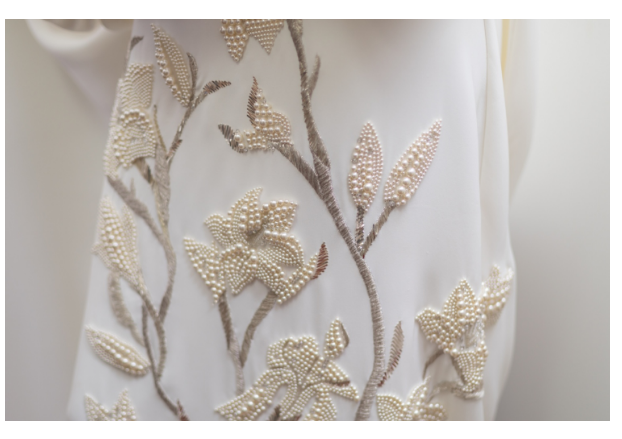 Tout commence avec un échantillon de broderie Lesage d’une collection Schiaparelli de l’automne 1940 et cette manière si particulière d’appréhender les perles de culture sous forme de fleurs de nacre. Cette broderie a été illustrée sur une robe noire de la garde-robe personnelle d’Elsa Schiaparelli qu’elle offrira par la suite au V&A de Londres