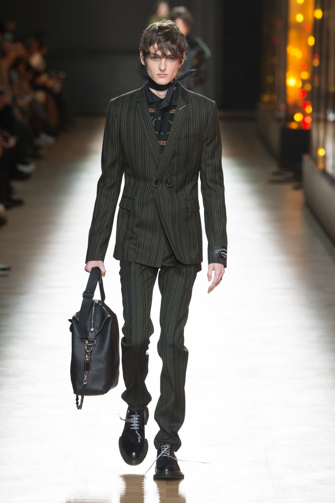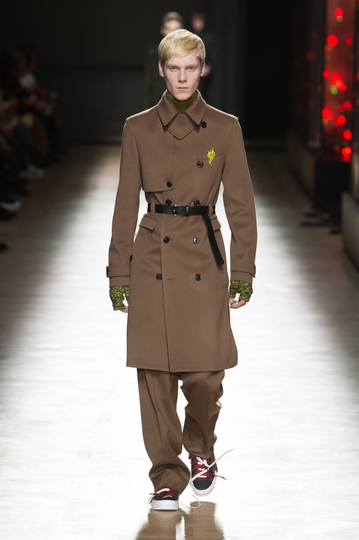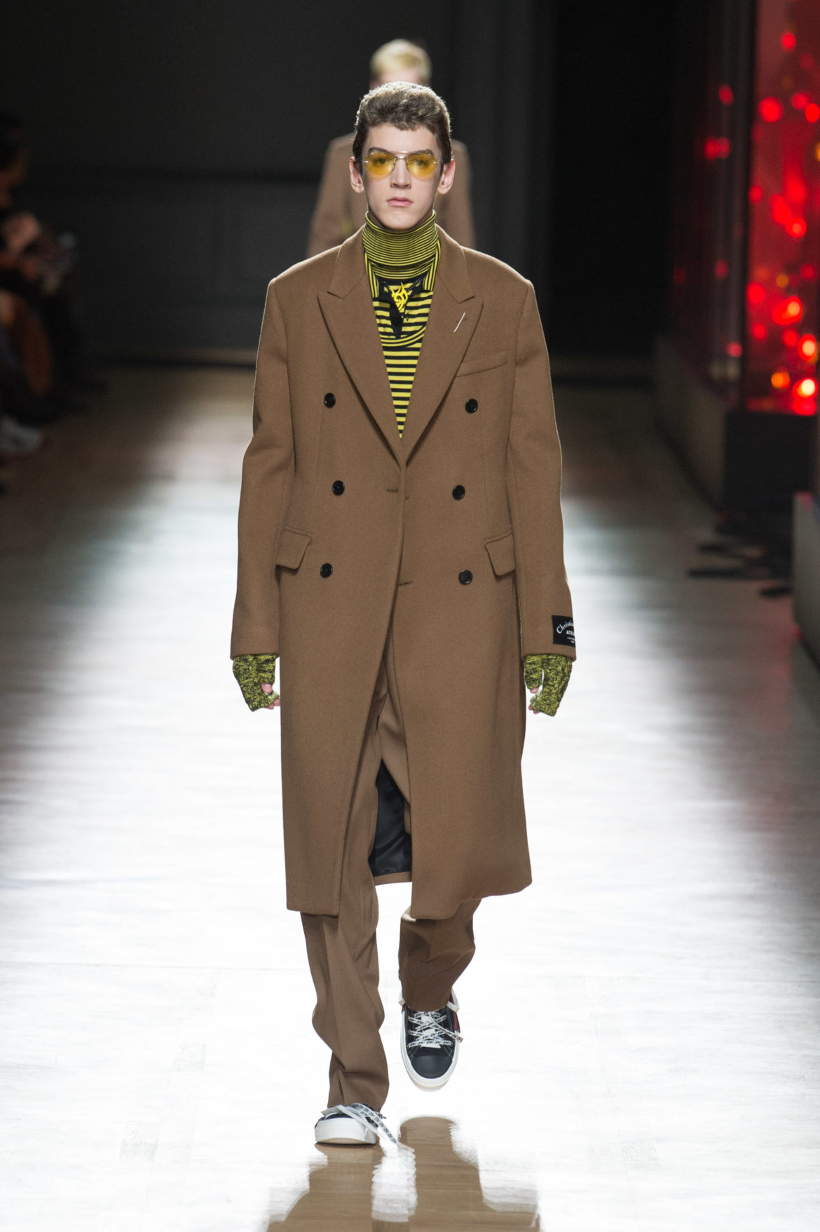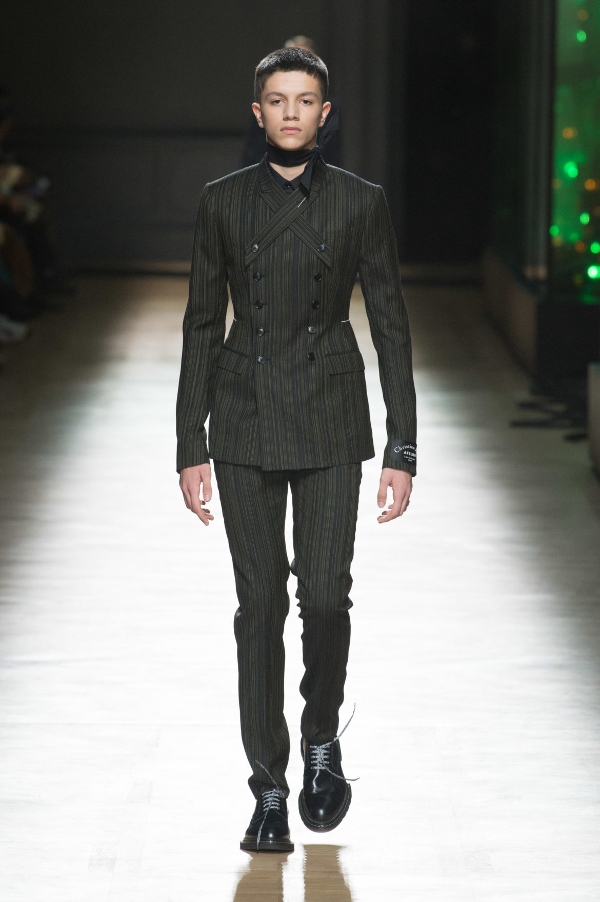 EN HOMMAGE AUX TOILES TRÈS CONSTRUITES DE MONSIEUR DIOR, DES VARIATIONS SOPHISTIQUÉES DE LA VESTE BAR METTENT EN LUMIÈRE LE SAVOIR-FAIRE DE LA MAISON. LES VESTES SONT SCULPTÉES, EN GRAIN DE POUDRE DE LAINE NOIRE, AVEC DES REVERS SUPERPOSÉS, DES POCHES PLAQUÉES ET DES DOUBLE-BOUTONNAGES FAÇON OFFICIER. FACE À CETTE ÉLÉGANCE EXTRÊME, LE MOTIF DU TATOUAGE DEVIENT UN SYMBOLE GRAPHIQUE ‘RAVE’ QUE L’ON RETROUVE AU FIL DE LA COLLECTION, SOUS FORME DE BLASON OU EN IMPRIMÉ ALL OVER. LA SUPERPOSITION EN TROMPE L’ŒIL DE POLOS EN MAILLE, DÉBARDEURS ET COLS ROULÉS DANS DES TONS DE VERT SAPIN, POURPRE ET JAUNE FLUO EST UN CLIN D’ŒIL AU VESTIAIRE TEENAGER, JUXTAPOSÉ À DES TRENCHS STRUCTURÉS ET MANTEAUX EN CACHEMIRE DOUBLE FACE. UN AUTRE NIVEAU DE SUPERPOSITIONS APPARAIT AVEC DES PANTALONS TAILLE HAUTE À PLIS EN LAINAGE OU EN DENIM DÉLAVÉ PORTÉS SOUS DES PARKAS COURTES EN NYLON, DES DUFFLE-COAT, BLOUSONS EN PEAU LAINÉE ET COUPE-VENT TECHNIQUE.
