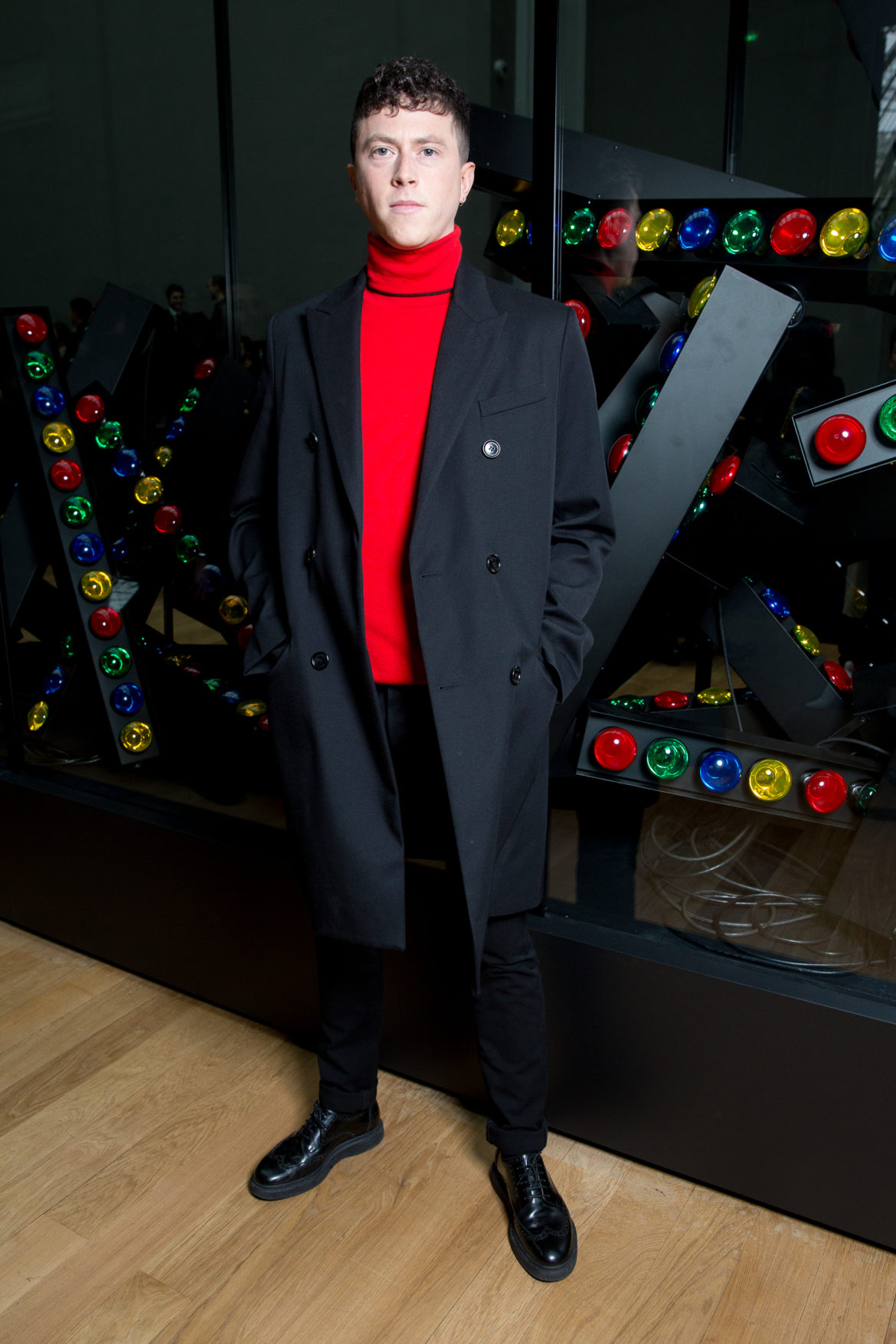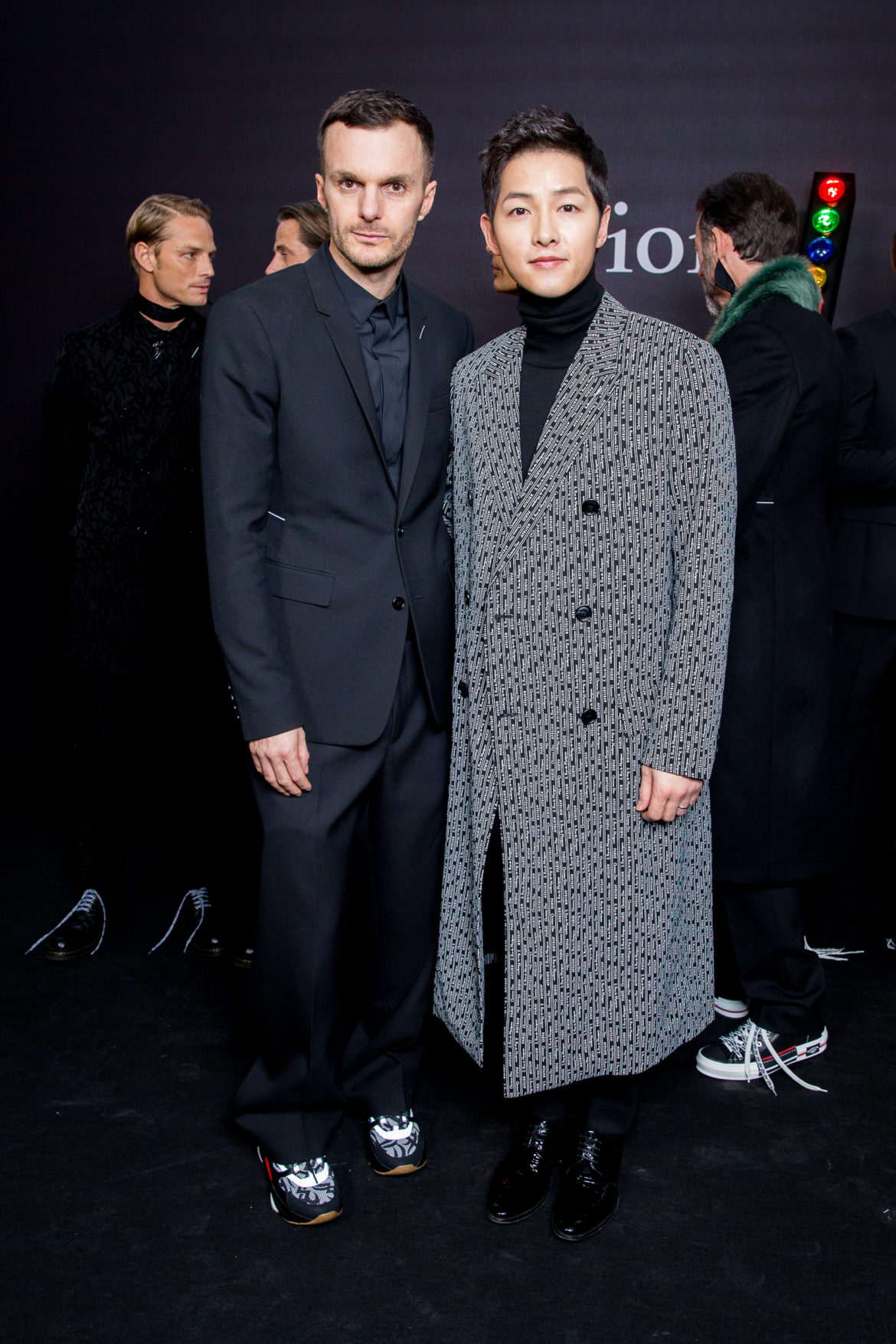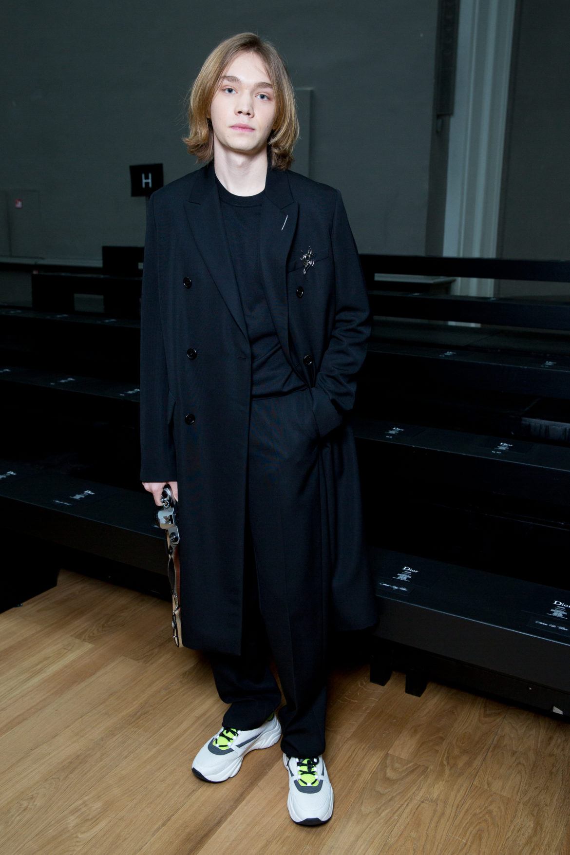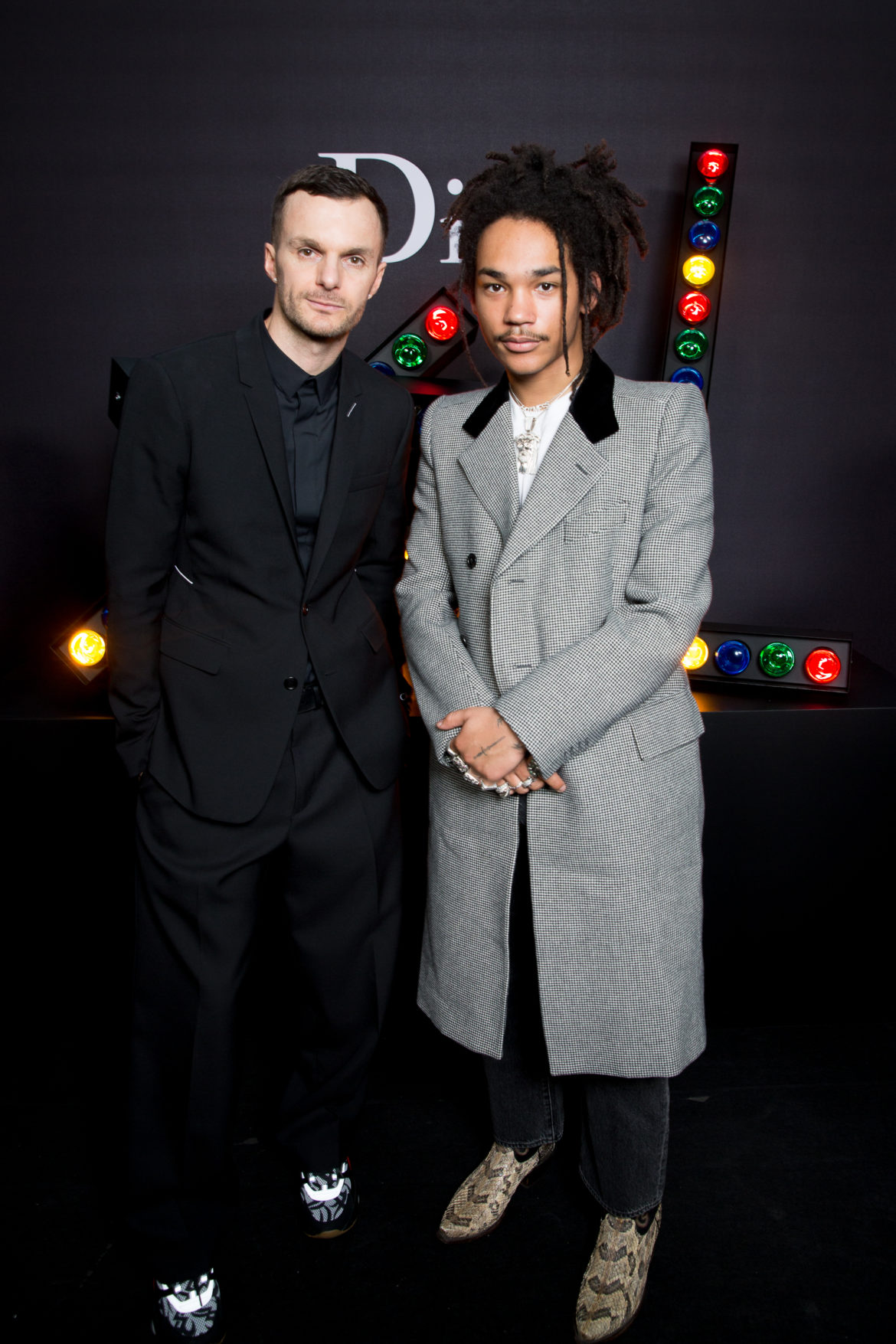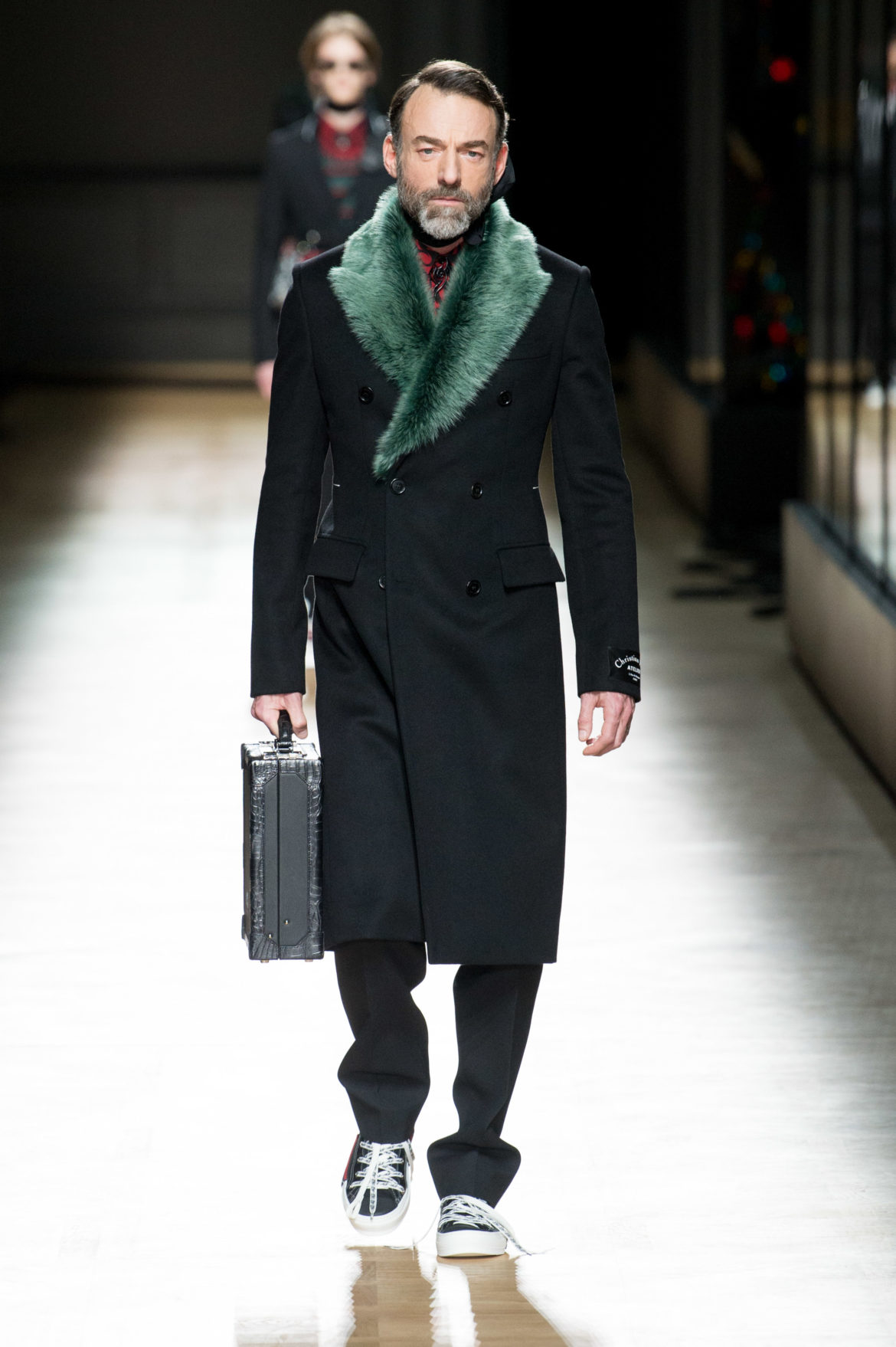 EN HOMMAGE AUX TOILES TRÈS CONSTRUITES DE MONSIEUR DIOR, DES VARIATIONS SOPHISTIQUÉES DE LA VESTE BAR METTENT EN LUMIÈRE LE SAVOIR-FAIRE DE LA MAISON. LES VESTES SONT SCULPTÉES, EN GRAIN DE POUDRE DE LAINE NOIRE, AVEC DES REVERS SUPERPOSÉS, DES POCHES PLAQUÉES ET DES DOUBLE-BOUTONNAGES FAÇON OFFICIER. FACE À CETTE ÉLÉGANCE EXTRÊME, LE MOTIF DU TATOUAGE DEVIENT UN SYMBOLE GRAPHIQUE ‘RAVE’ QUE L’ON RETROUVE AU FIL DE LA COLLECTION, SOUS FORME DE BLASON OU EN IMPRIMÉ ALL OVER. LA SUPERPOSITION EN TROMPE L’ŒIL DE POLOS EN MAILLE, DÉBARDEURS ET COLS ROULÉS DANS DES TONS DE VERT SAPIN, POURPRE ET JAUNE FLUO EST UN CLIN D’ŒIL AU VESTIAIRE TEENAGER, JUXTAPOSÉ À DES TRENCHS STRUCTURÉS ET MANTEAUX EN CACHEMIRE DOUBLE FACE. UN AUTRE NIVEAU DE SUPERPOSITIONS APPARAIT AVEC DES PANTALONS TAILLE HAUTE À PLIS EN LAINAGE OU EN DENIM DÉLAVÉ PORTÉS SOUS DES PARKAS COURTES EN NYLON, DES DUFFLE-COAT, BLOUSONS EN PEAU LAINÉE ET COUPE-VENT TECHNIQUE.
