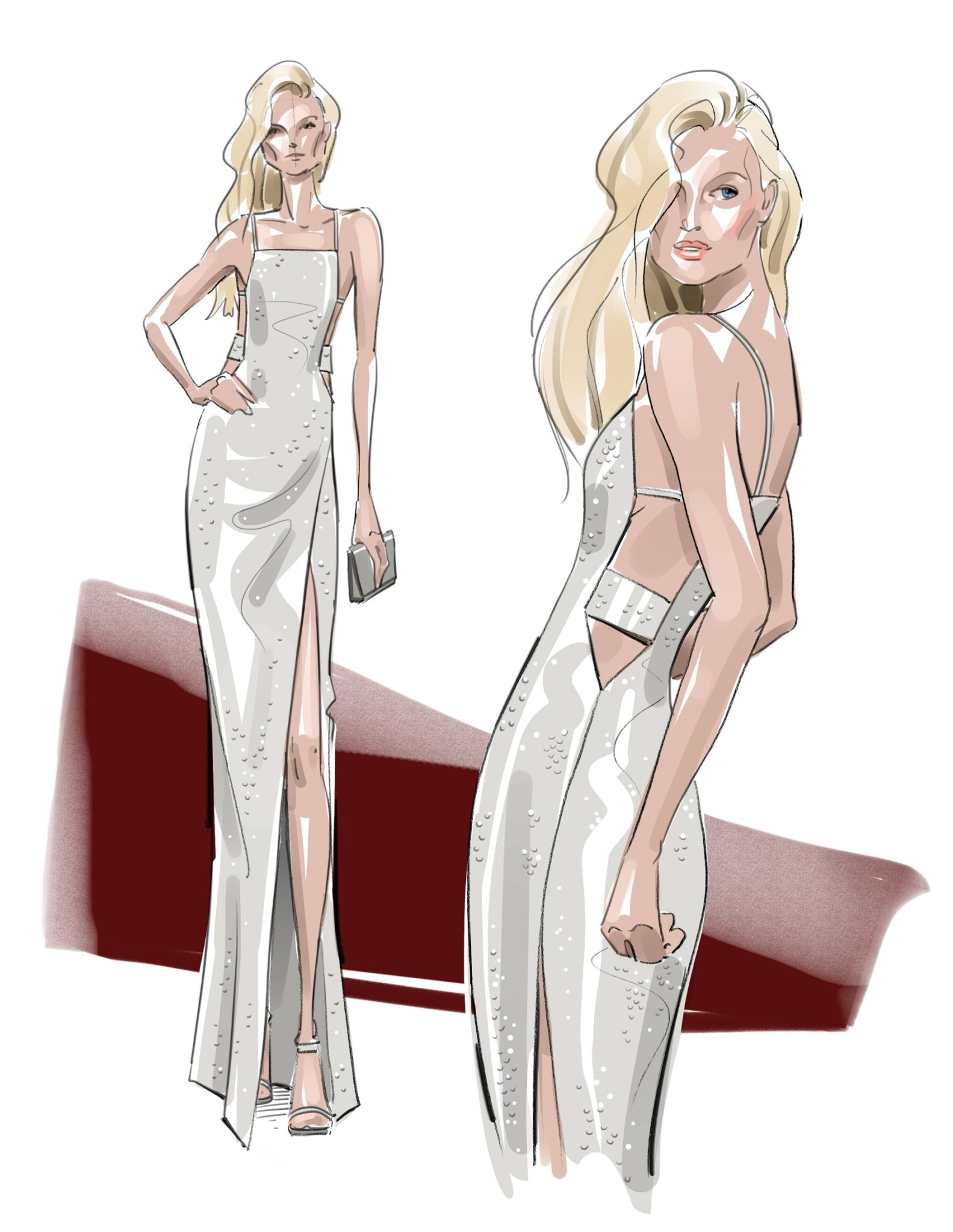 Toni Garrn portait une robe BOSS en soie brodée de sequins.