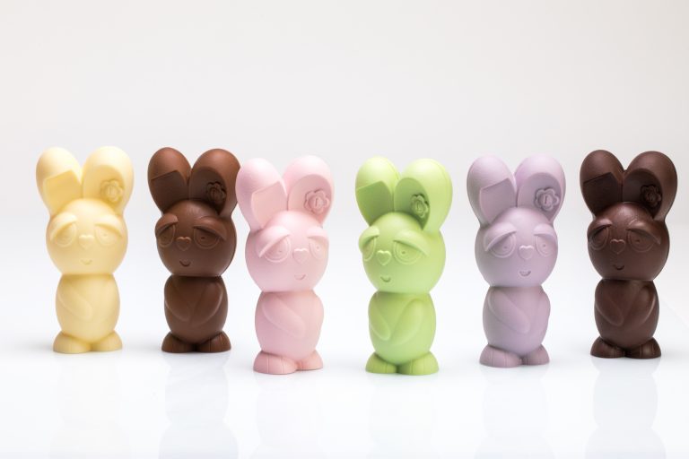 Après leur coup de foudre au printemps dernier, Joe Milk et Lolly Pink revinnent sur le devant de la scène… Et surprise la famille s’est agrandie ! Bienvenue à Julies, Arthur, Lili, Elsa, Léa, Félix, Théo et Tim ! Réalisée à partir de chocolat noir, au lait ou blanc, la famille lapins émerveillera les petits comme les grands.