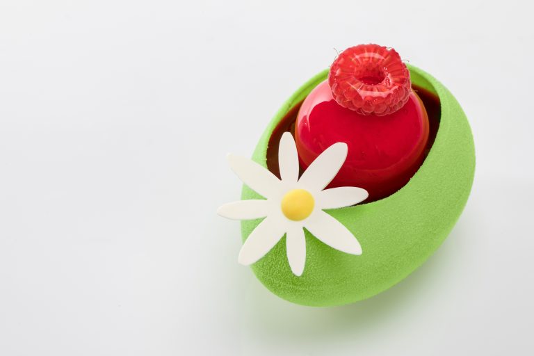 Cette délicate coque en chocolat blanc renferme une délicieuse dacquoise à l’amande, une boule de mousse à la verveine, une marmelade de framboises et des morceaux de framboises fraîches.