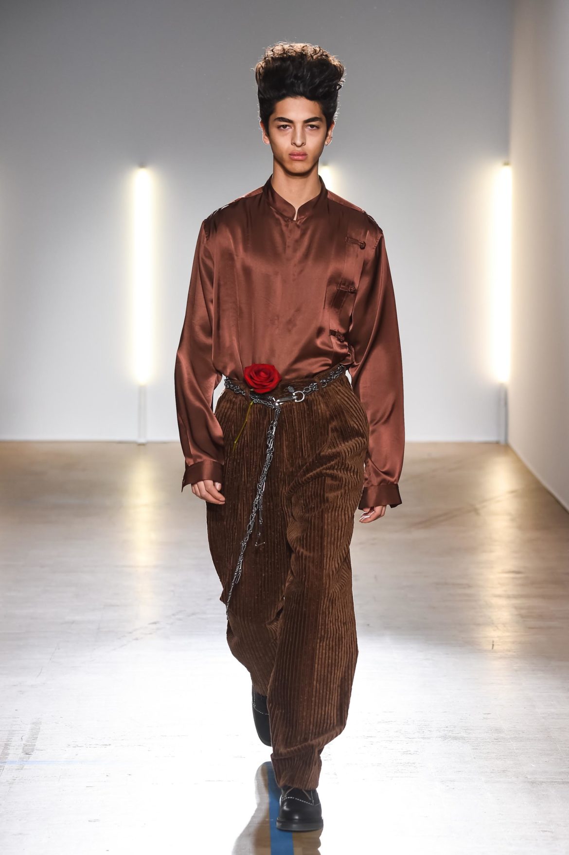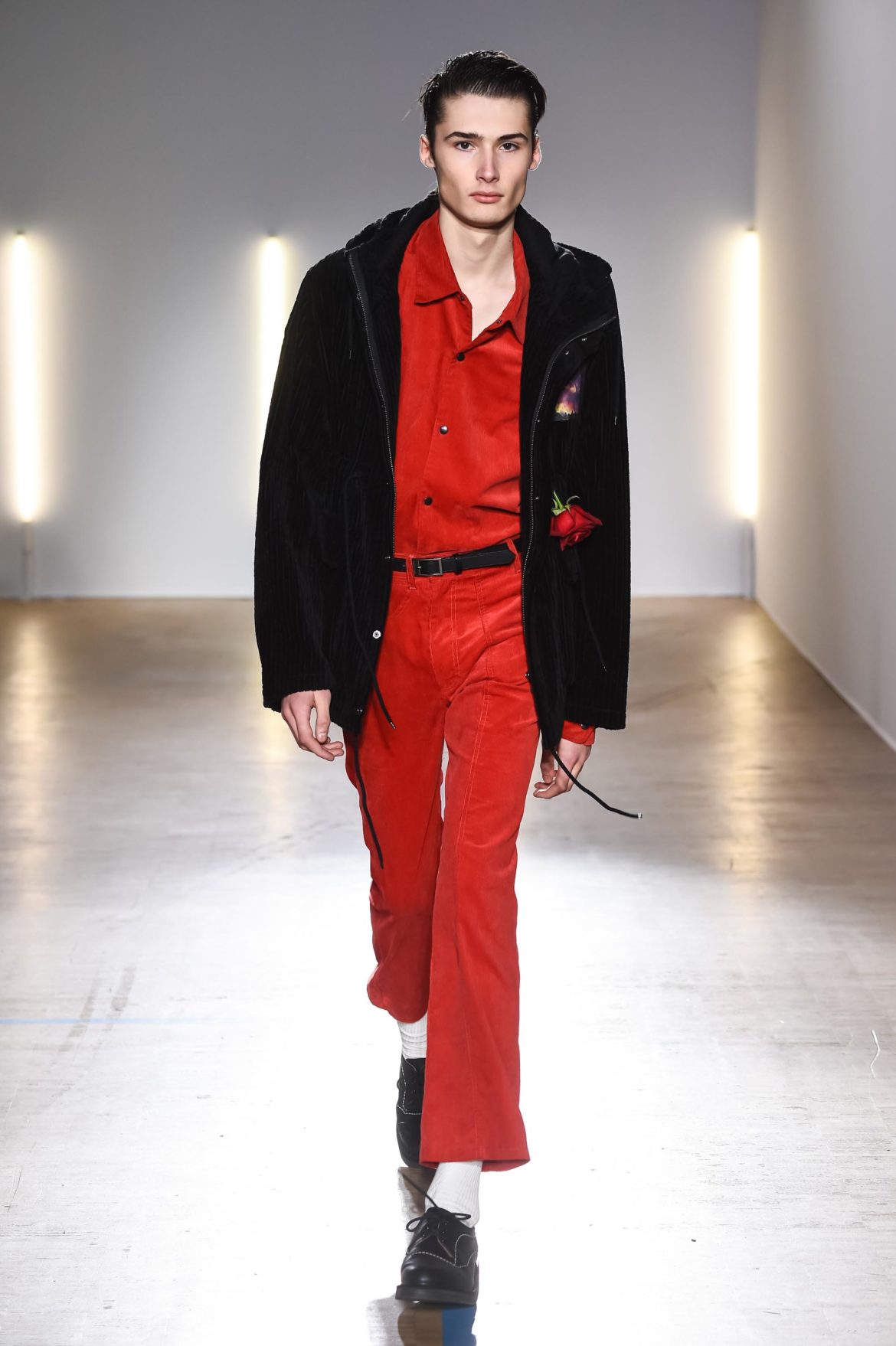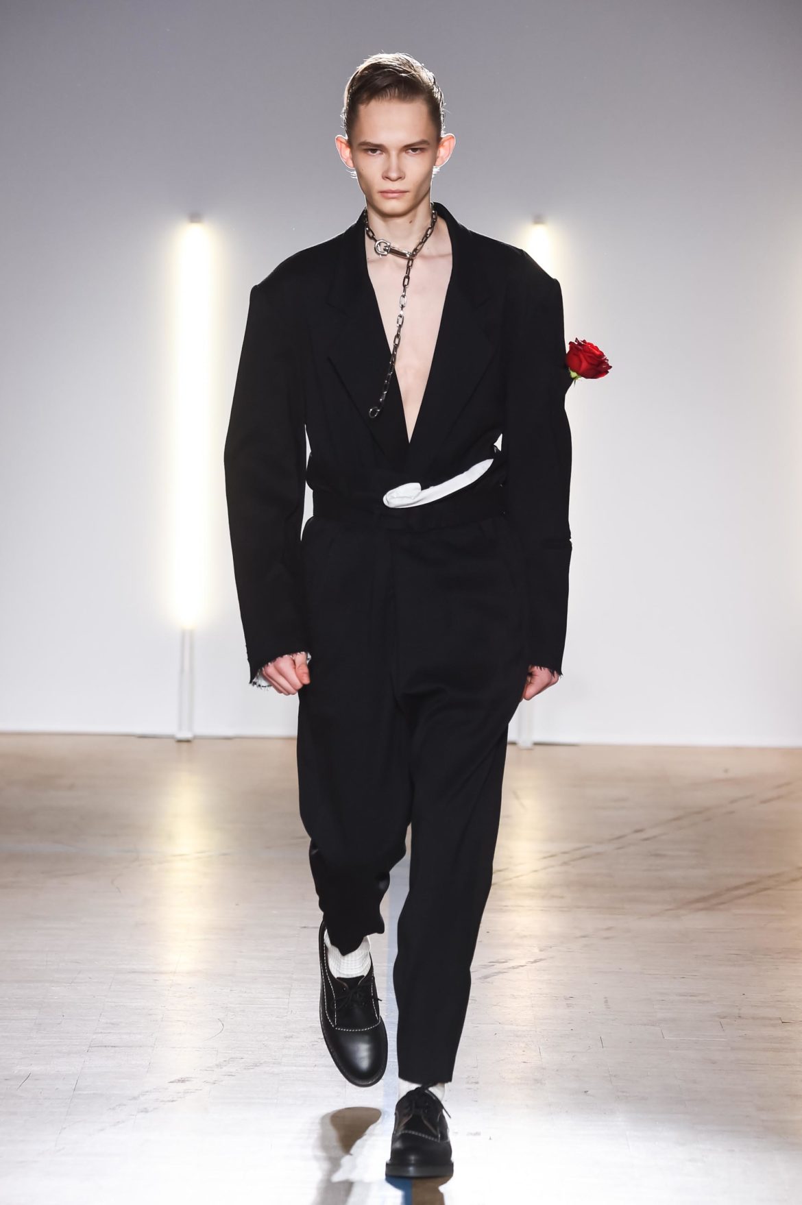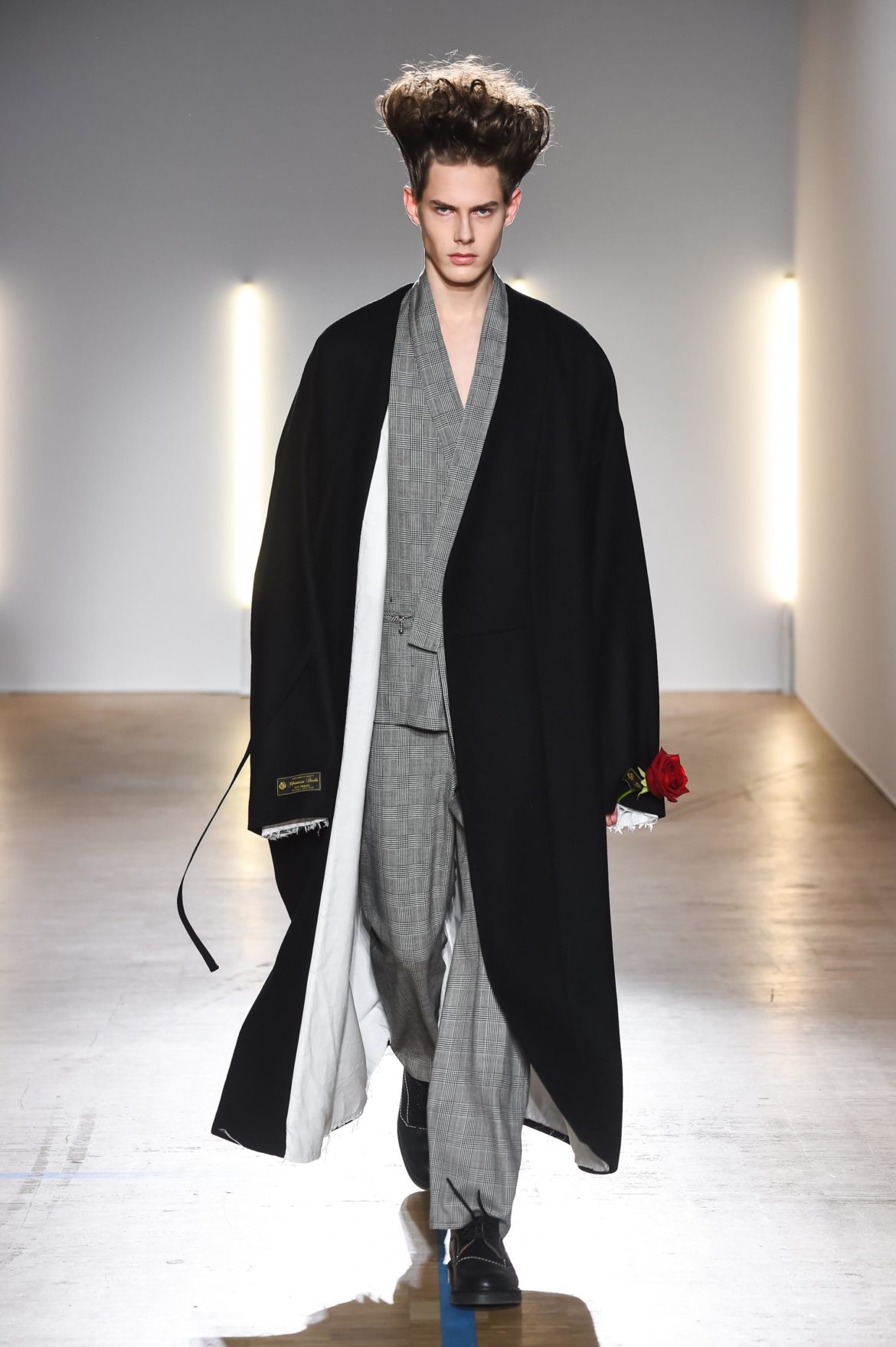 L’œuvre de l’artiste américain a initié nombre des motifs marquants de la collection : un motif de roses rouges brodé sur les blousons de satin ou tricoté sur des pulls reprend le graphisme d’une affiche du film Blue Velvet. Développant toujours un vocabulaire esthétique personnel, Masanori Morikawa mixe les influences du vestiaire asiatique avec les classiques d’une garde-robe occidentale. Les vestes de tailleurs sont coupées avec des cols de kimonos et les larges pantalons se drapent sur le devant dans un geste élégant empreint d’un chic ethnique.