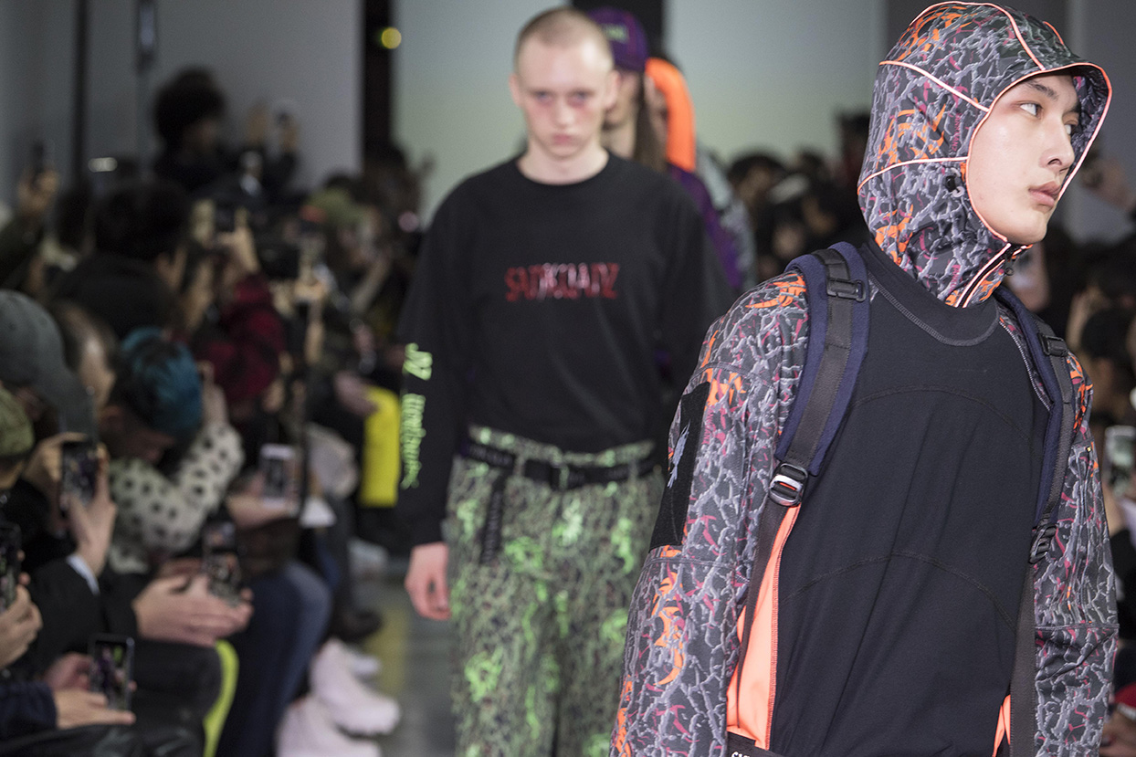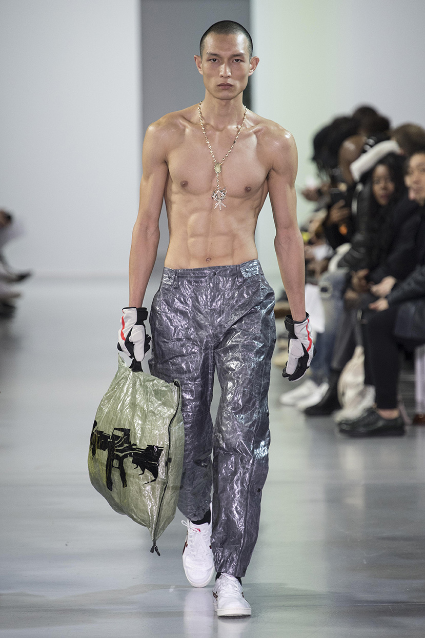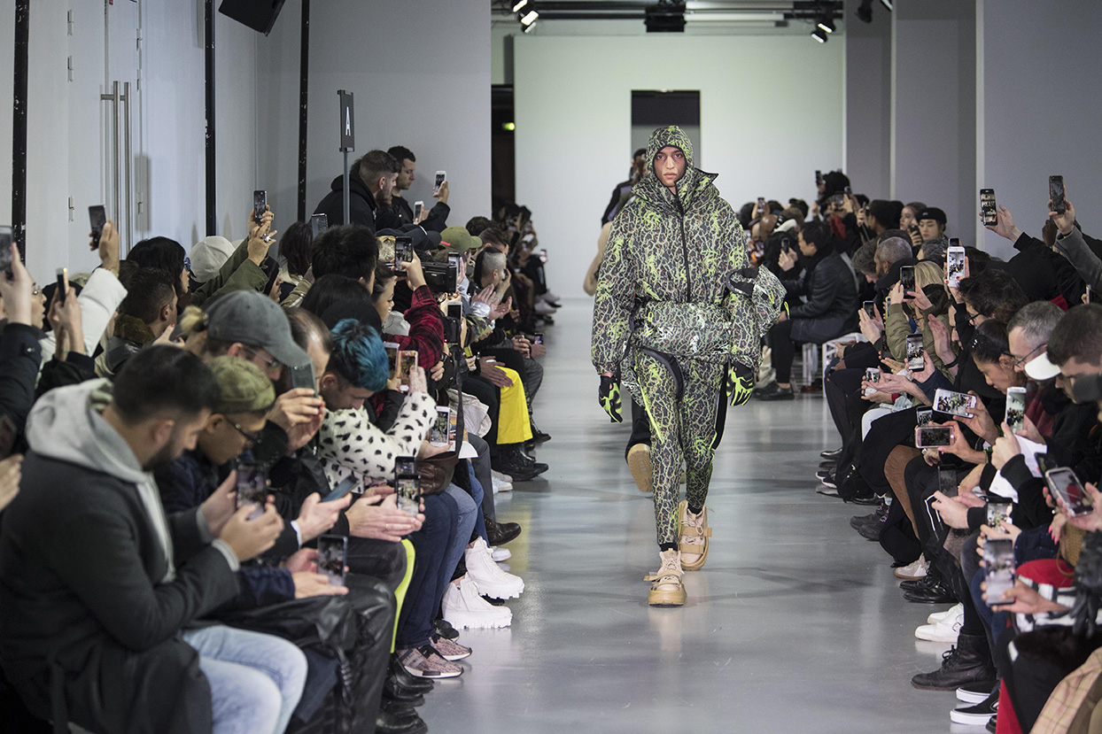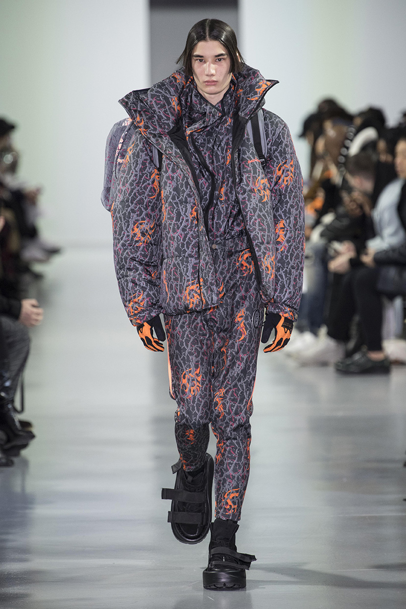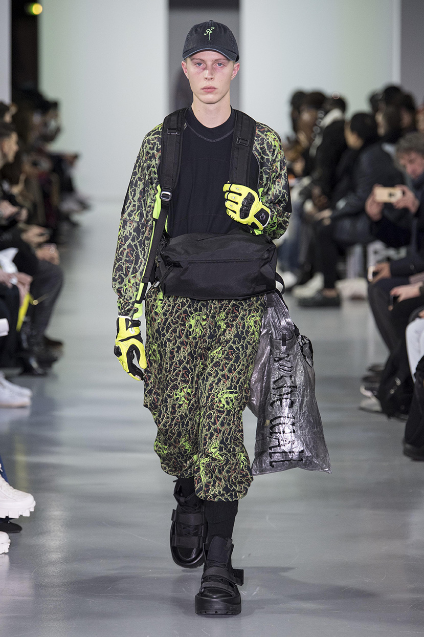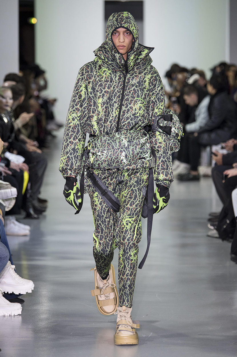 Des branches épineuses ont inspiré un nouvel imprimé camouflage dessiné pour cette saison, il est réalisé dans des couleurs fluorescentes et une matière réfléchissante. Ces tons néon orange, vert et jaune flashent sur les imprimés et sur les passepoils de looks militaires et de survêtements, ou sur des chemises de football et collants de courses, donnant à la collection une vibration underground et techno.