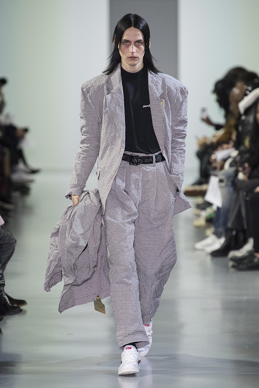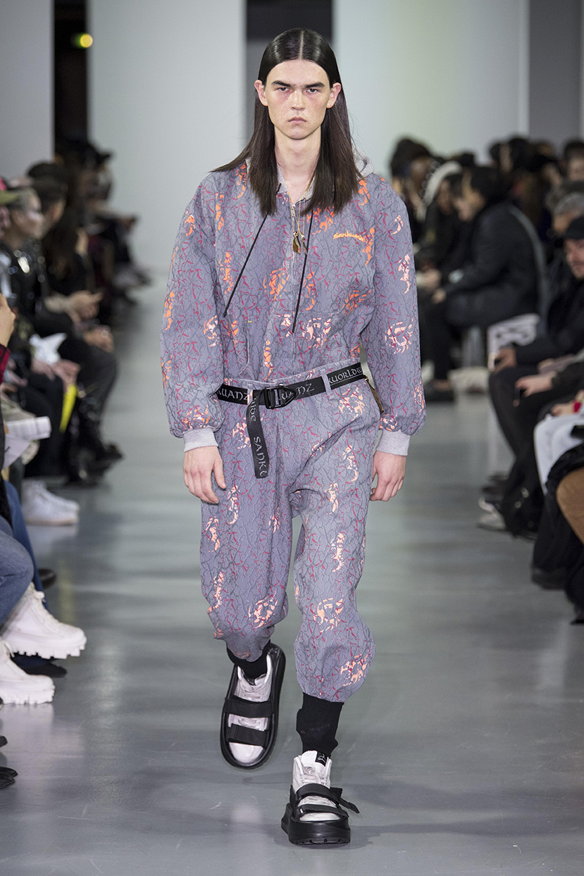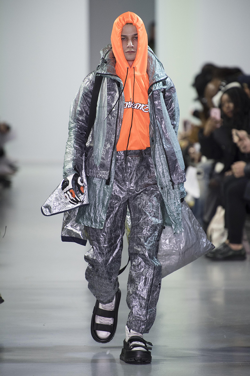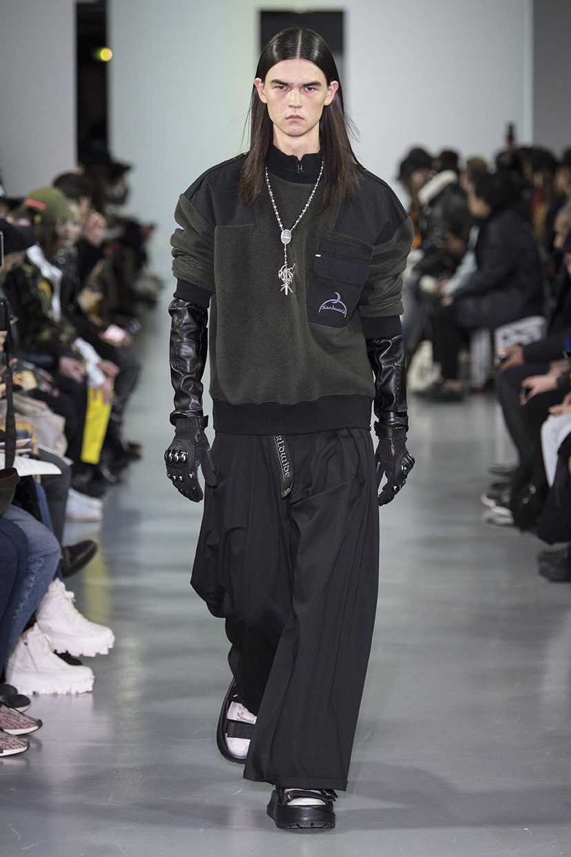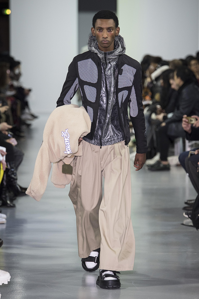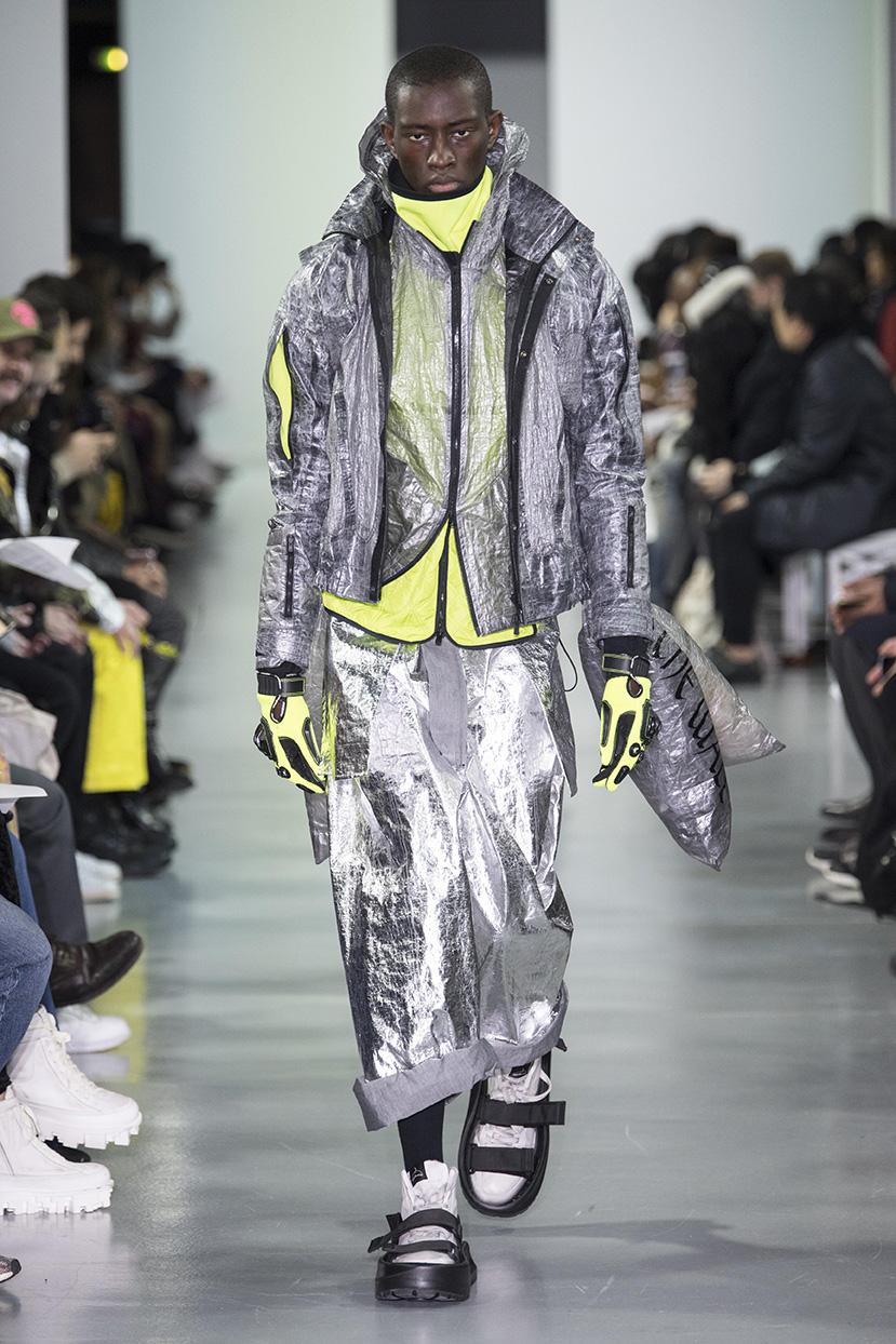 Les silhouettes sont chaussées de baskets hautes en daim et toile de nylon, qui, portées avec de sandales à grosse semelle s’attachant par dessus, ajoutent au fort esprit de protection et de combat de la collection.