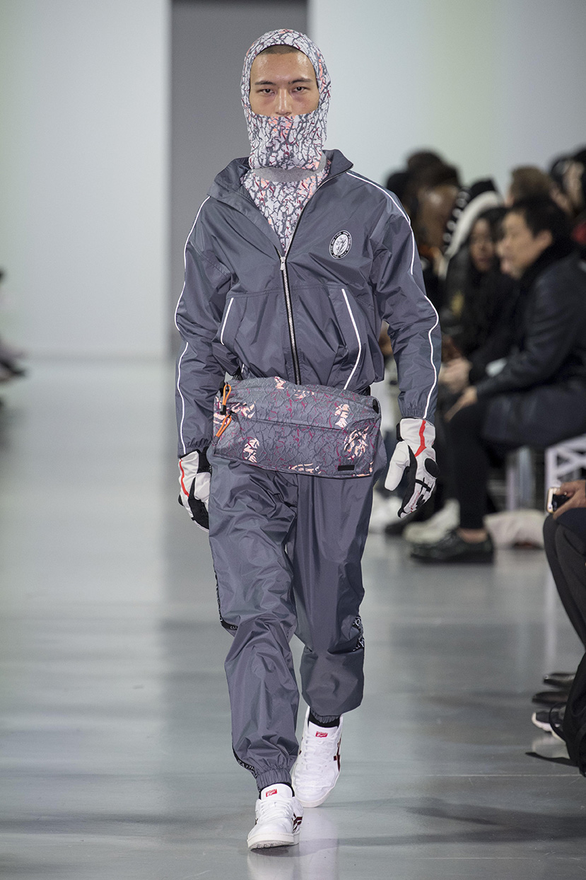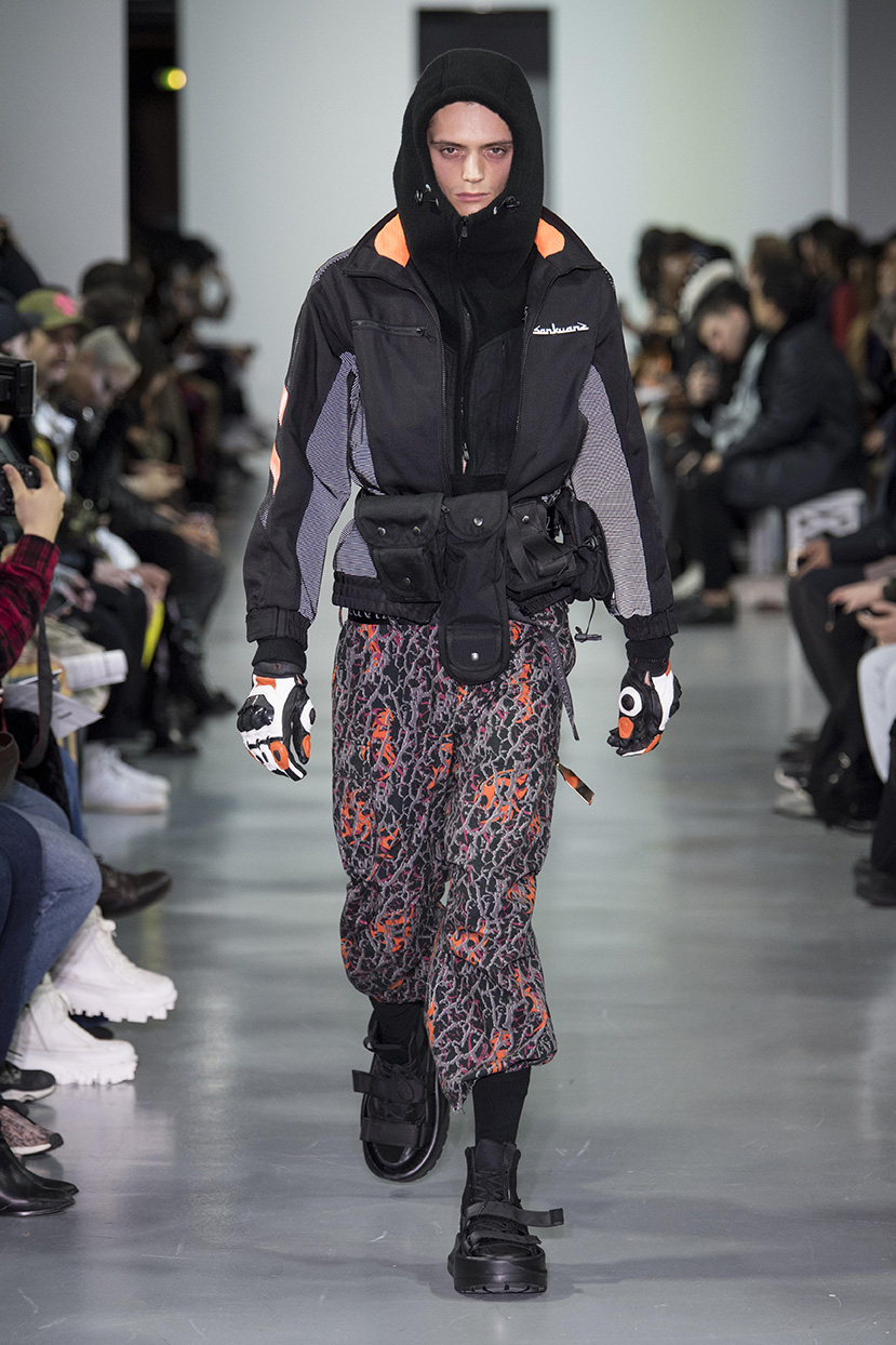 Des tenues inspirées de la plongée et du motocross sont réalisées dans des matières stretch, et des hauts à capuche avec des masques intégrés rappellent une allure de guerrier Ninja.