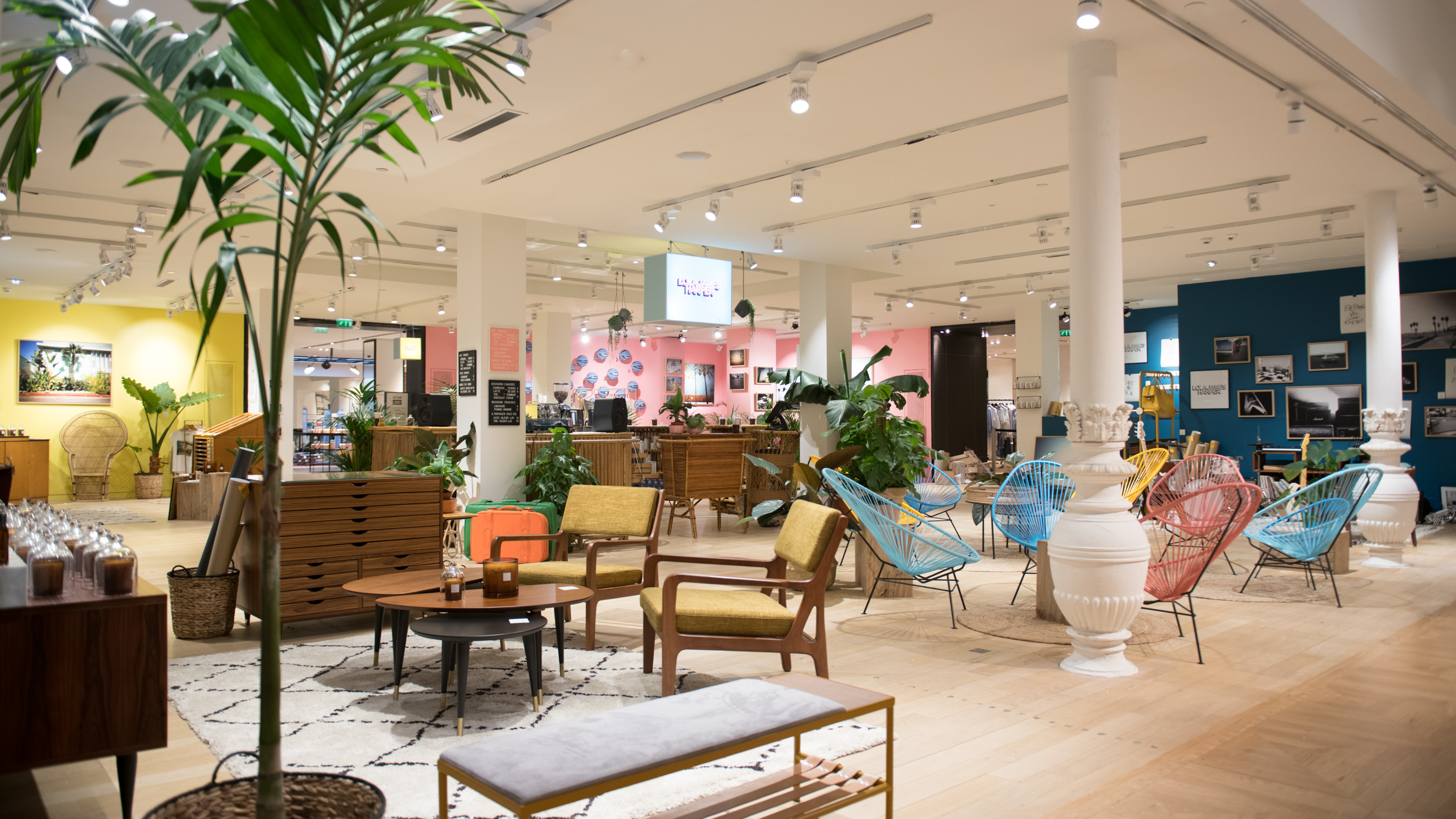 Lola James Harper, label lifestyle fondé par Rami Mekdachi, se prête à l’exercice du logo star et imagine un concept unique en transformant le premier étage du Bon Marché en lobby d’hôtel avec son espace de détente, son bar, son studio de musique, son mobilier vintage et sa première collection de prêt-à-porter.