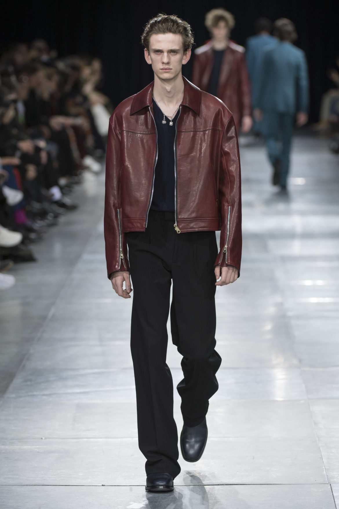jewel-tones. Leather engineering boots and tool bags further contrast the softened, relaxed tailoring.