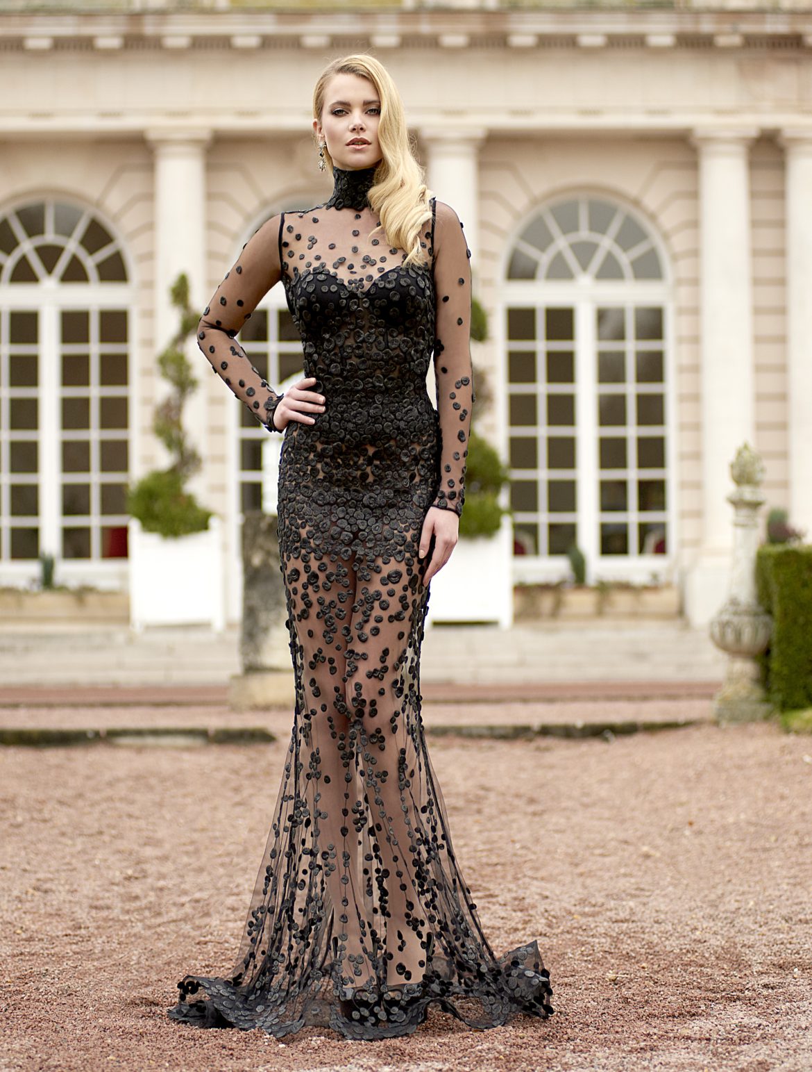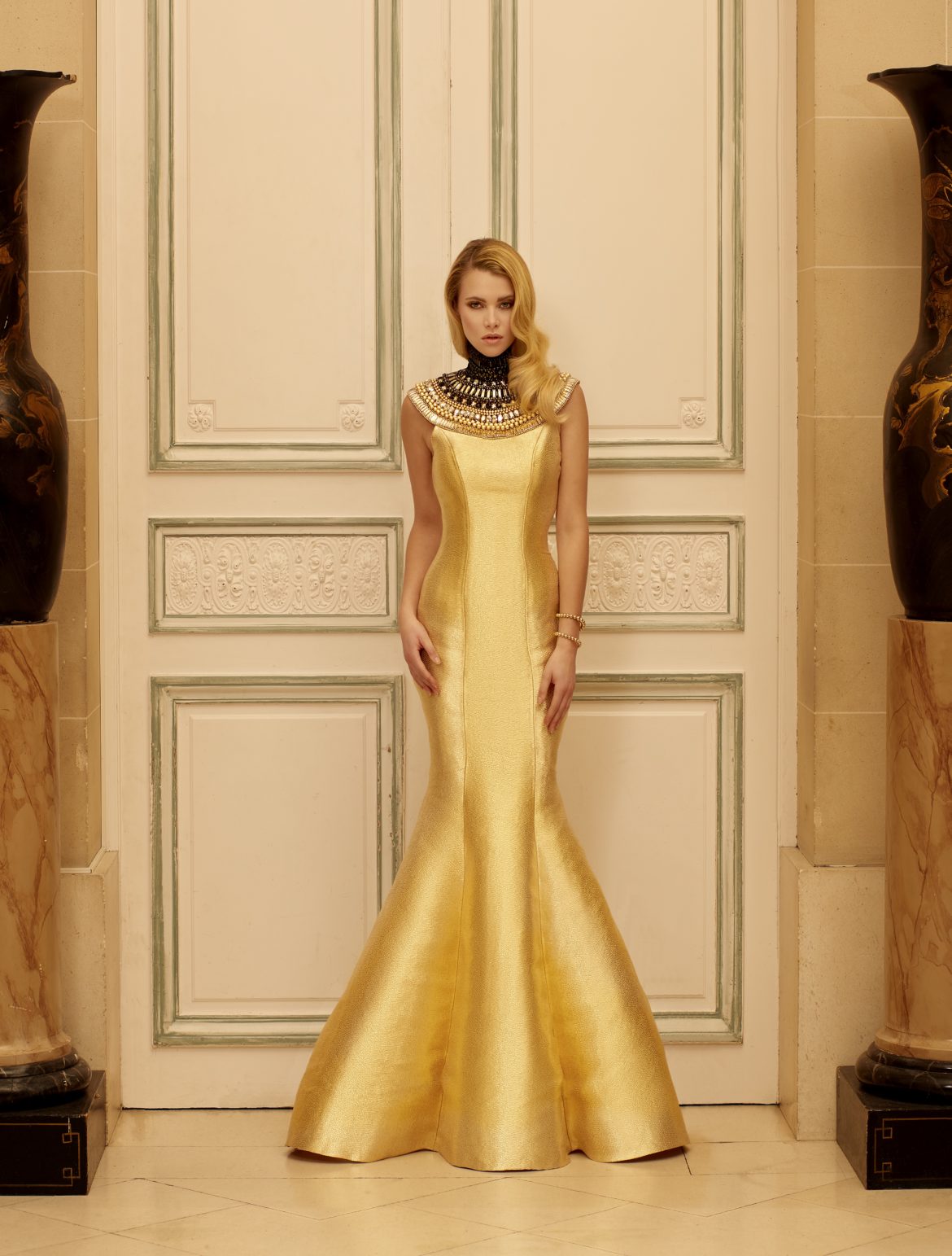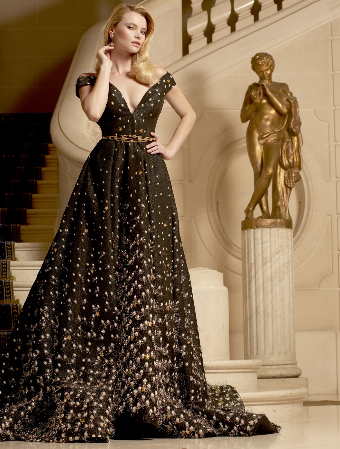 La robe « Etoile » dévoile un décolleté plongeant vertigineux et épouse le corps marquant la taille par une ceinture or. Vaporeux et fluide, le brocard de soie nuit noire est rebrodé d’étoiles filantes en fil d’or.