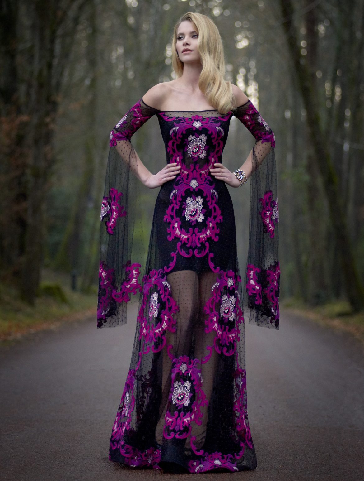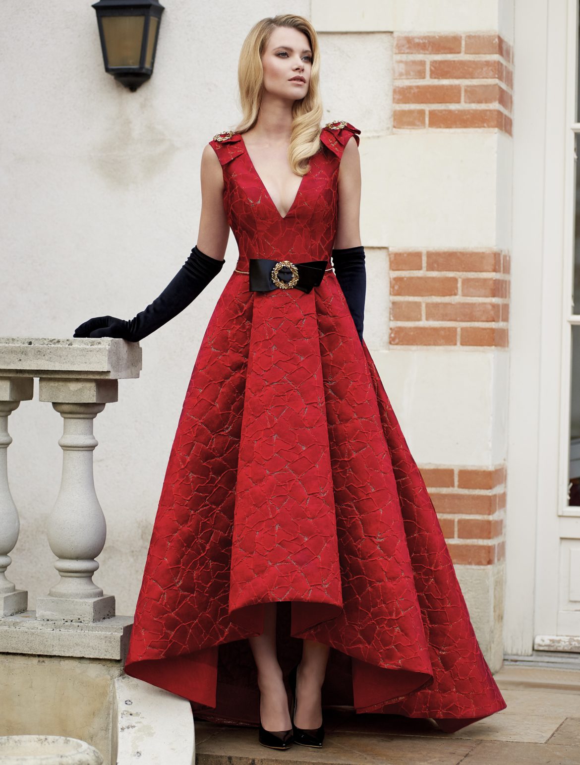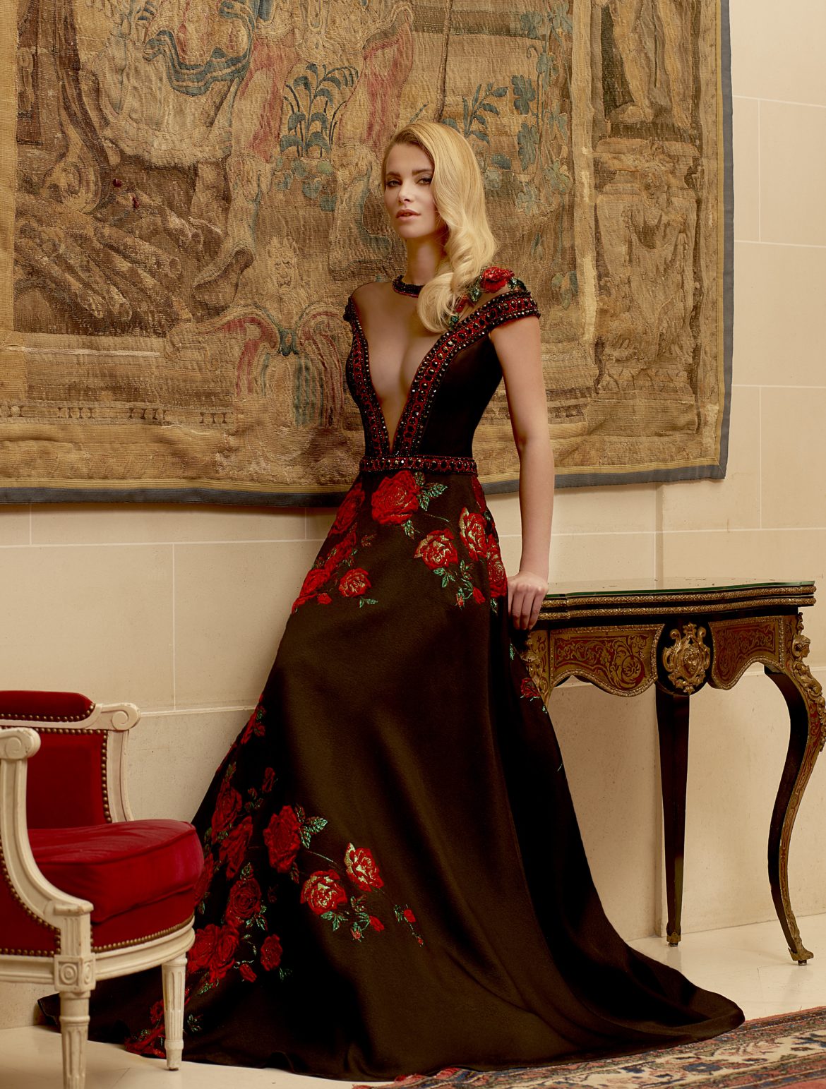 La robe « Etoile » dévoile un décolleté plongeant vertigineux et épouse le corps marquant la taille par une ceinture or. Vaporeux et fluide, le brocard de soie nuit noire est rebrodé d’étoiles filantes en fil d’or.