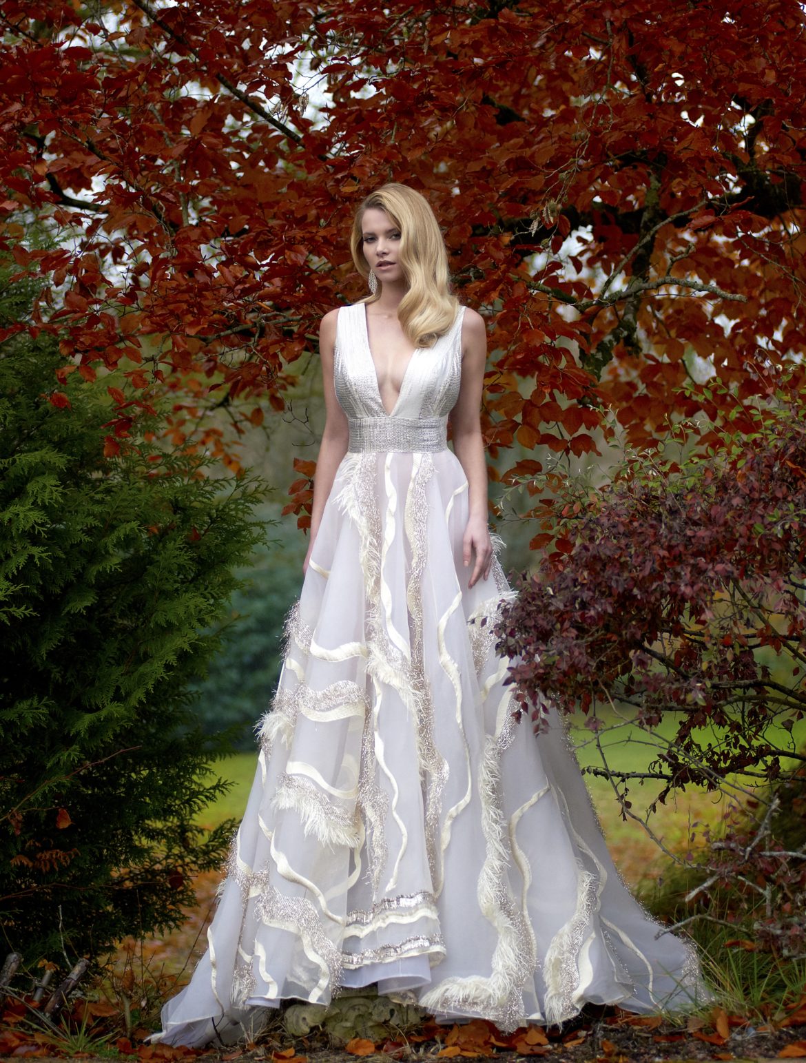 Avec ces épaulettes marquées et rehaussées, son décolleté plongeant parsemé de cristaux Jet Hématite et Black Diamond, la robe « Estrela » est l’une des plus magistrales de la collection. Pas moins de deux mille pierres sont brodées à la main, et une centaine de plumes d’autruches ont été nécessaires pour en faire une pièce à la fois unique et féérique.
