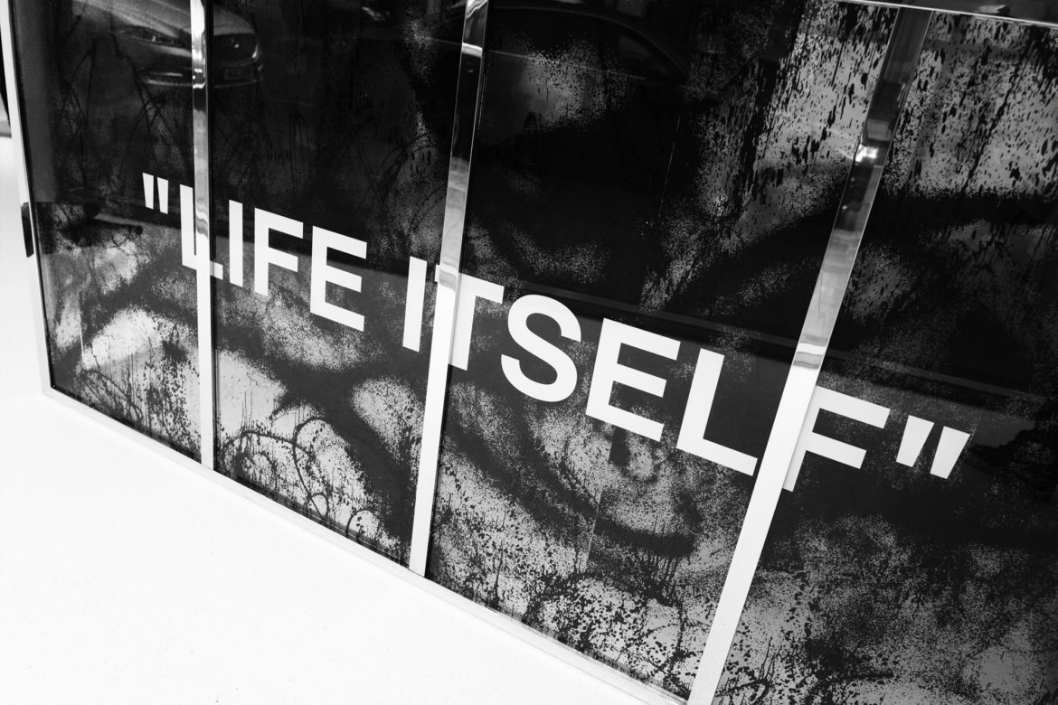 The duo’s ironic and insouciant artistic gestures are designed to disrupt the divisions and tiers of stratified cultural production. The sculpture Life itself (2018) is a kind of architectural carapace designed by Abloh to house one of Murakami’s brightly sinister flower sculptures. In another instance, Glance past the future (2018), they transform Gian Lorenzo Bernini’s 1623 self-portrait by superimposing Murakami’s character Mr. DOB to affect a graphic blur of pink and black, like a desecrated street poster leaving behind traces of an art-historical lineage.