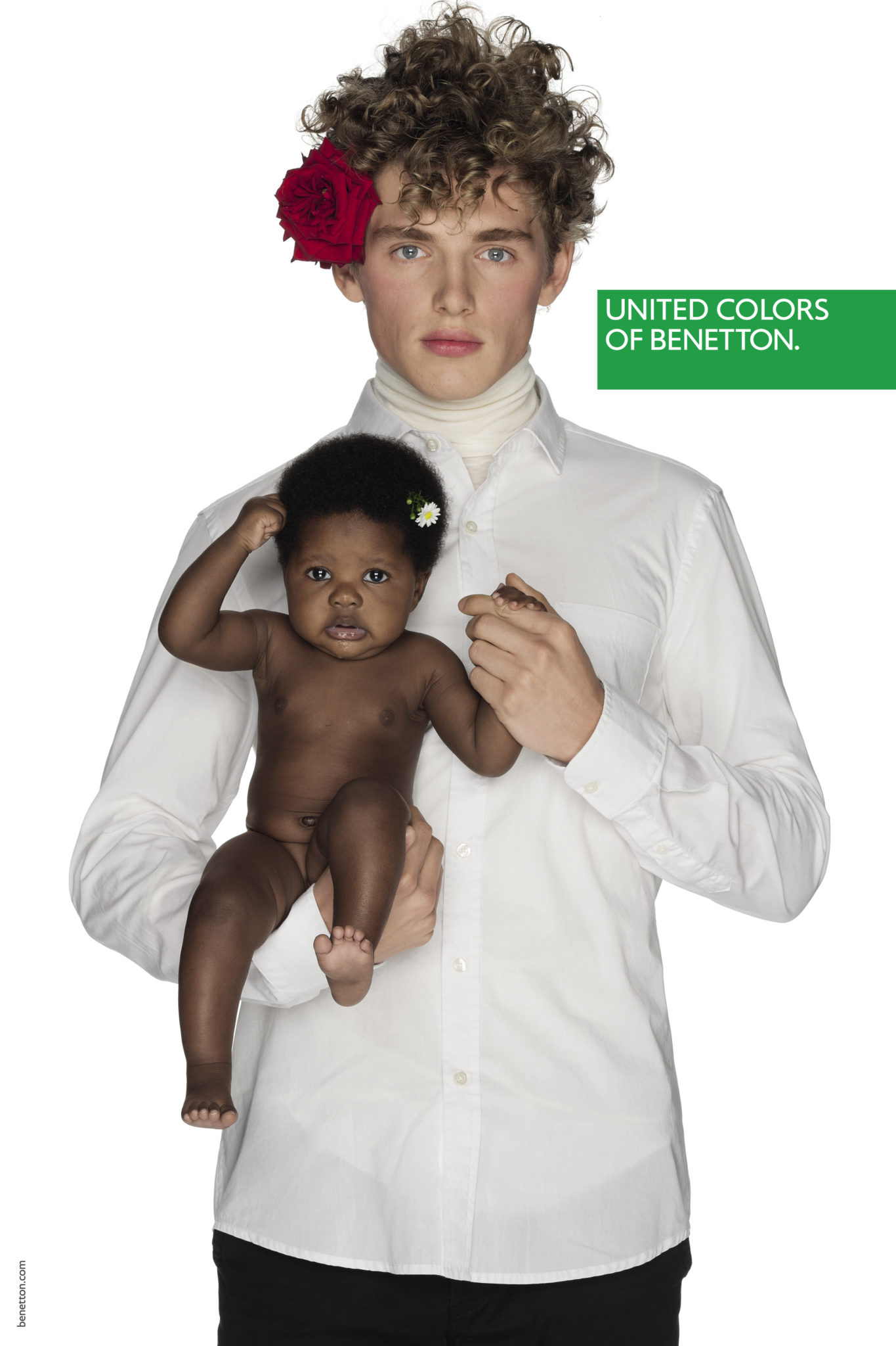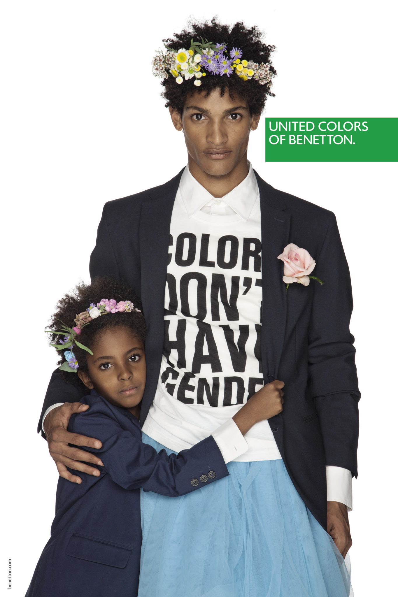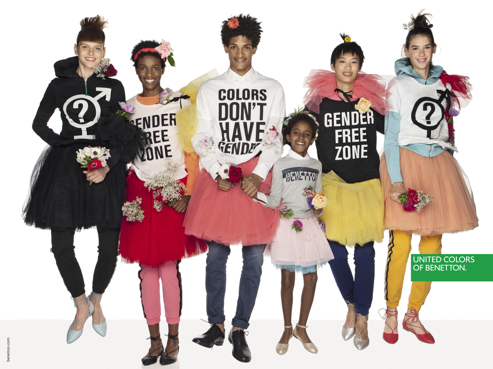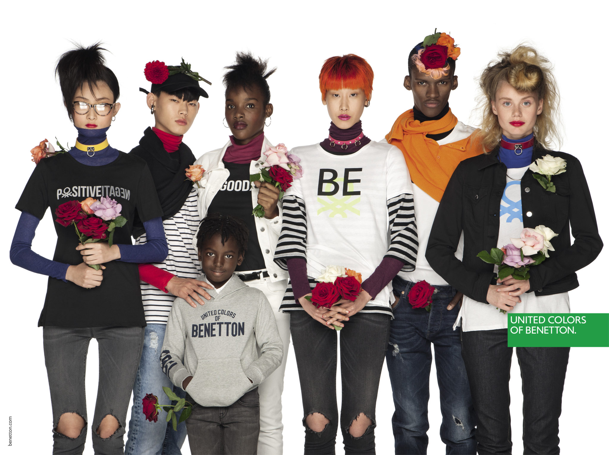 Un mix & match de couleurs et matières sans règles précises dans une image forte et incisive pour signifier que nous sommes tous ici, tous égaux.Une manière de s’habiller qui va au-delà du global, une liberté et une créativité sur tous les fronts, un message universel, pour tous, sans distinction de religion, d’âge ou d’orientation sexuelle.Une mode qui se fait entendre, sans peur, faite d’idées type manifeste et de slogans imprimés : PAIX, AMOUR, EGALITE, NO GENDER, POSITIVITE.« Nos pulls resplendiront à nouveau », a déclaré Toscani de retour chez Benetton depuis quelques mois afin de répéter la magie au sein d’une marque qui a fait l’histoire de la mode mondiale.