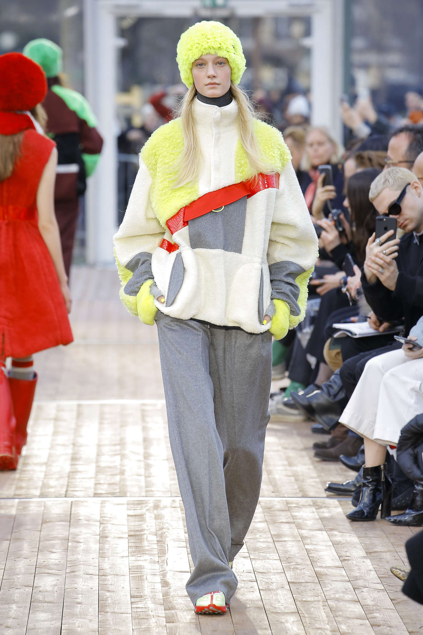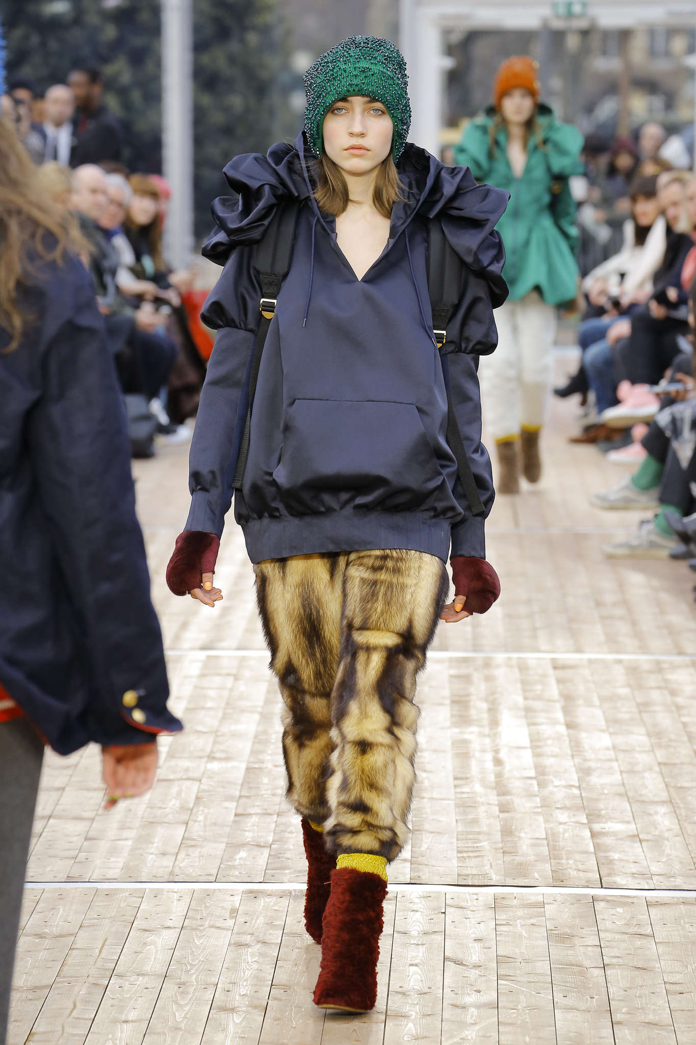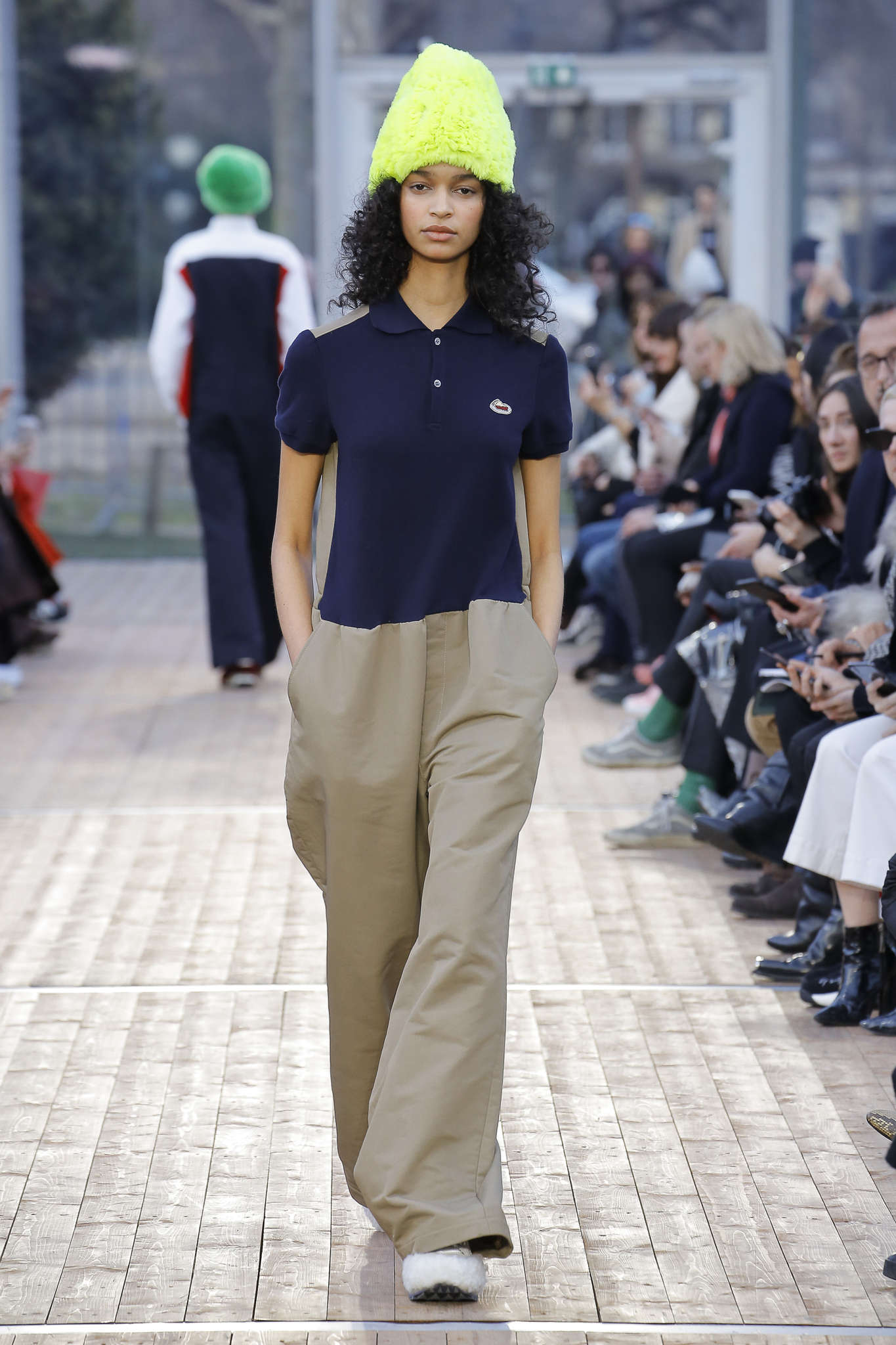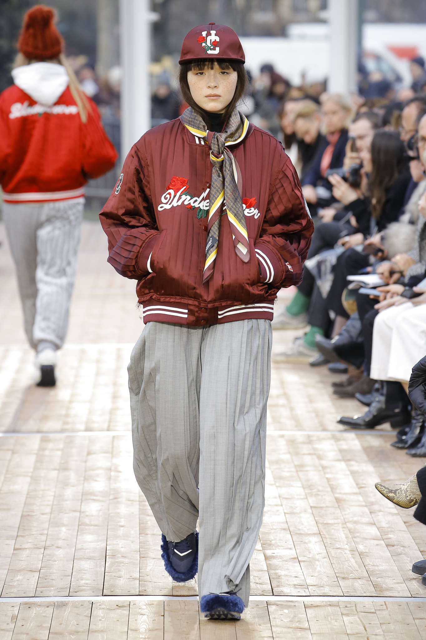Multiples, inclassables, insaisissables : chez Undercover tout un jeu sur le droit d’être multiple est présenté. Imprimé sur les vêtements : I’m happy and Sad. Both in the same time. Le droit d’être sportwear et preppy. D’avoir un look aux couleurs acidulées et sombres, le droit d’adopter le bombers avec un écharpe boy-scout. En ramenant à la vie différents codes de la mode, Undercover se fait le roman gothique de ce qu’est profondément la mode. Soit un lieu qui recycle les tendances. Le résultat est loin de susciter la peur, même si une pointe d’ironie sur « la bête humaine » peut être lue dans les pantalons qui donnent des guiboles de grizzli.