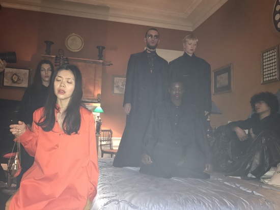 Été 1816-Lac Lément : Marie Shelley, Lord Byron et quelques happy few se racontent des histoires de fantômes, parlent de résurrection et écrivent. Environ deux siècles plus tard, les créateurs se rassemblent à Paris. Dans des appartements privés du 8 ième arrondissement (Dumitrascu) ou dans les sous-sols du Palais de Tokyo, les scénographies des défilés raniment les ficelles des romans d’épouvantes. Dans la fumée, et l’encens, jaillissent des créatures : des fantasmes d’une nature irradiée d’un fluo holographique. Comme un écho à ce qui va advenir à la fin du séjour Suisse de Shelley : l’histoire d’un homme qui décide de créer un homme idéal. L’histoire de Victor Frankenstein. L’histoire d’un homme qui emprisonne ses peurs dans un autre, et crée un monstre.