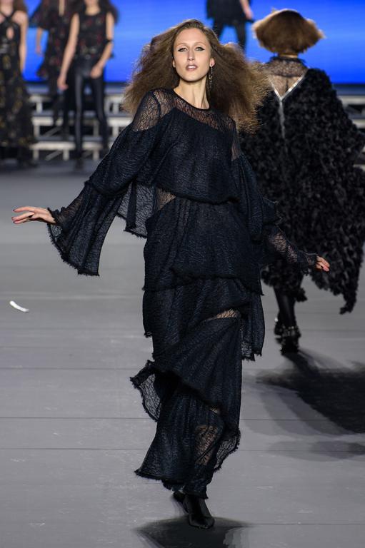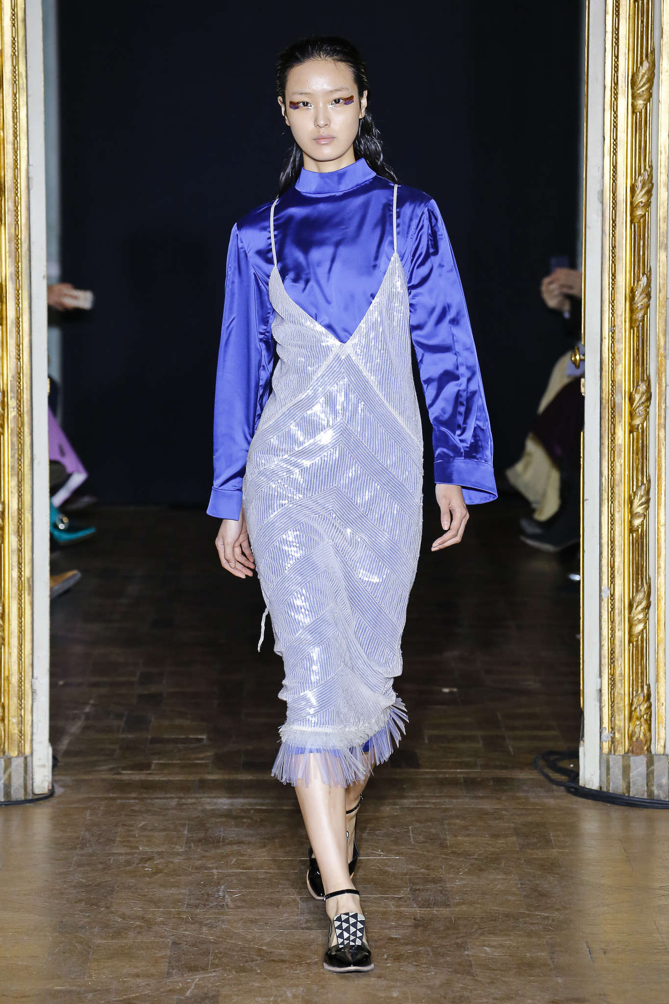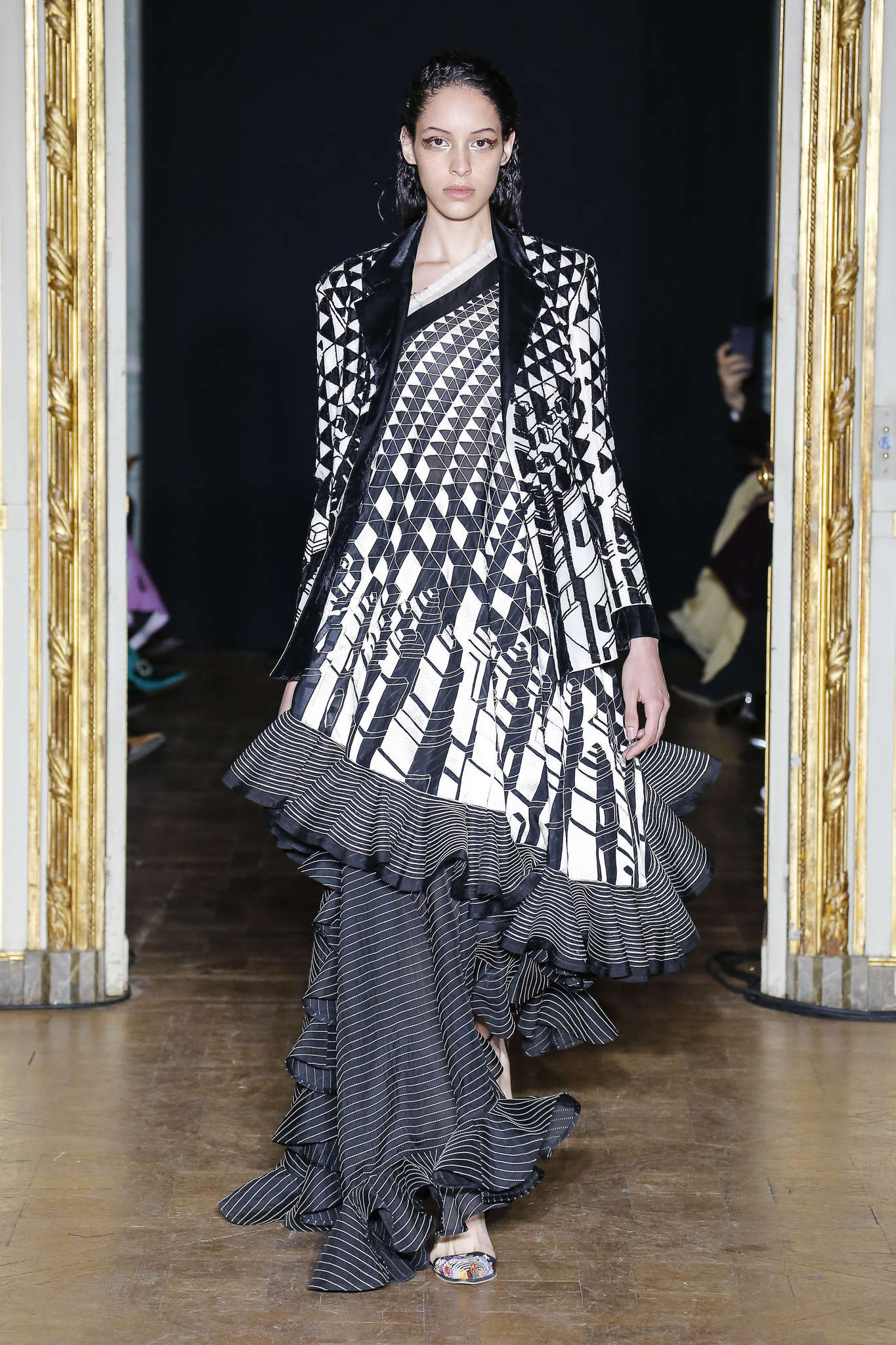 La parisienne : une apparition éphémère.Rahul Mishra rappel à juste à titre que » la mémoire est principalement le fruit de séquences fantasmées . Miss France est sur le podium: comme pour nous dire que les rêveries autour du chic parisien voyage. Elle n’appartient à personne, elle est à tout le monde. Les créateurs s’en absorbent, s’en dérobent. Voilà ce qu’est la mode quand elle vit : un voyage. La collection de Rahul Mishra est un voyage : personnel au coeur de son enfance.Un voyage au coeur des savoirs-faires indiens, avec la mise en avant de la technique du Kinkhab ( à traduire par petit rêve). Enfin c’est l’expérience de la ville, des buildings frappés par la lumière du soleil , vus au travers des yeux d’un citoyens du monde. Rahul Mishra emmène la poésie à Paris, sans s’astreindre à la sobriété classique des rêveries de dames en noir.