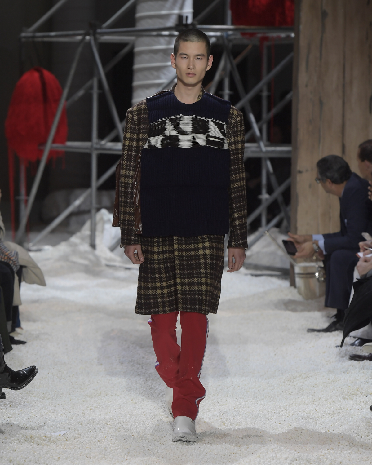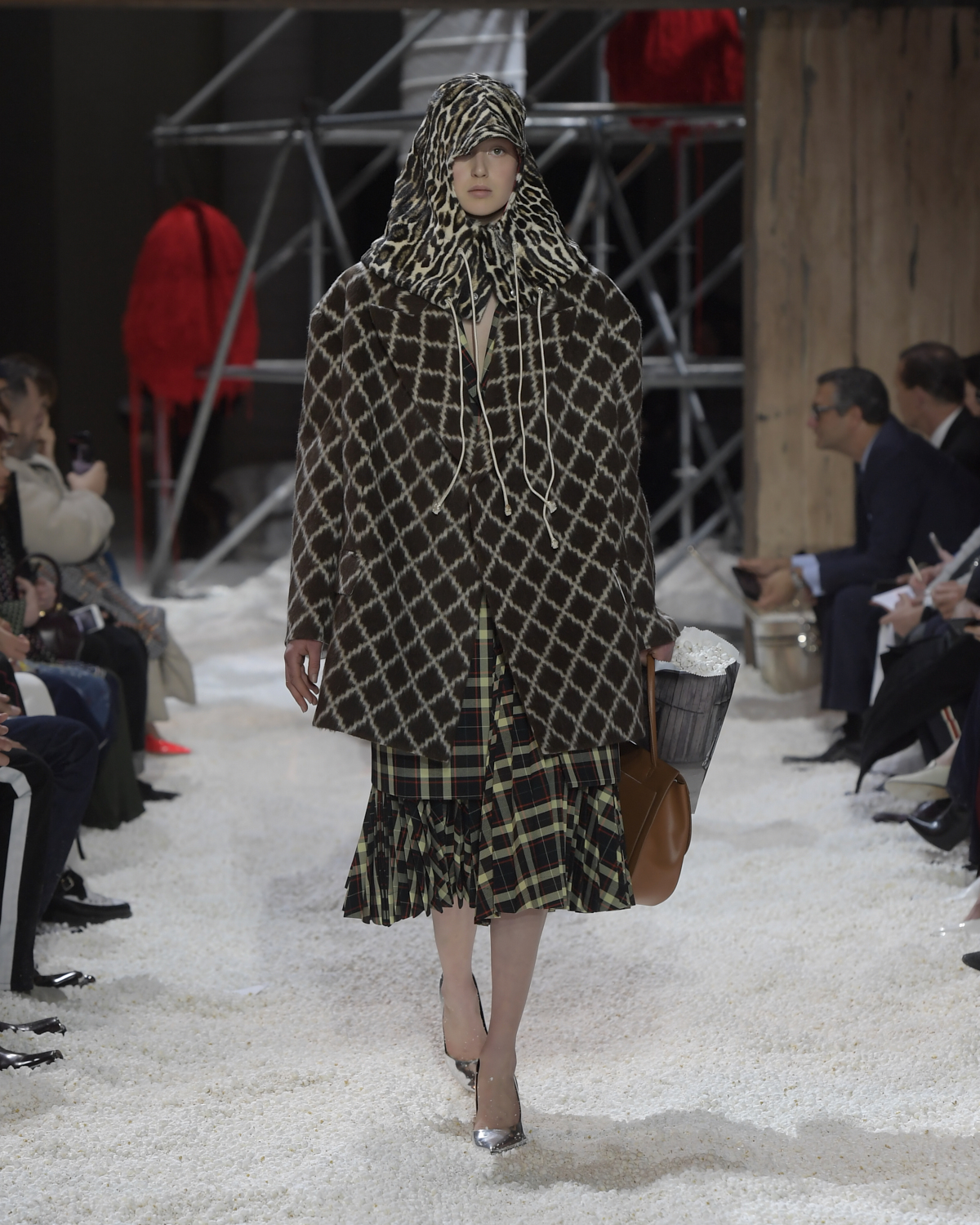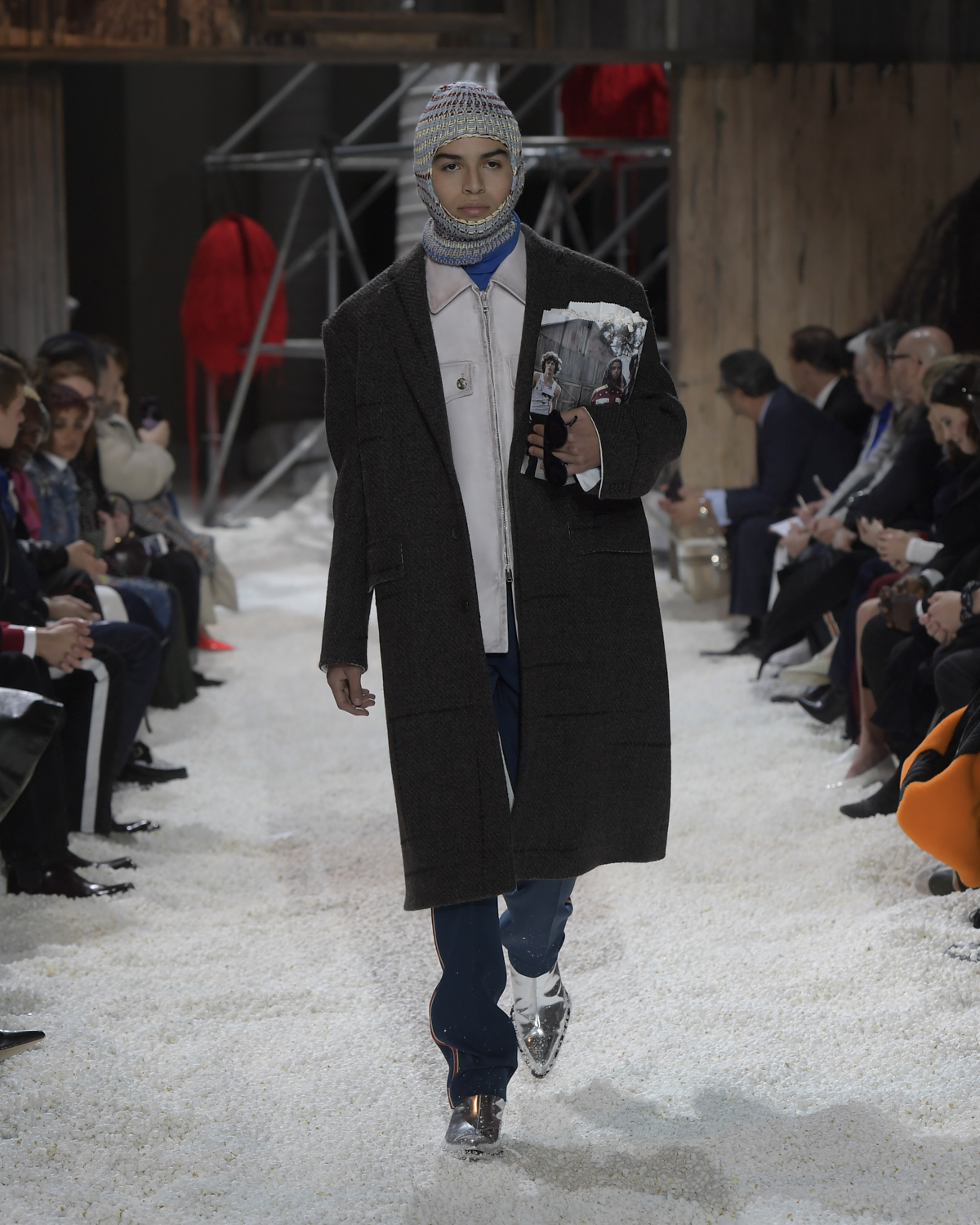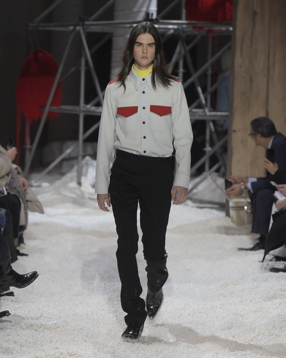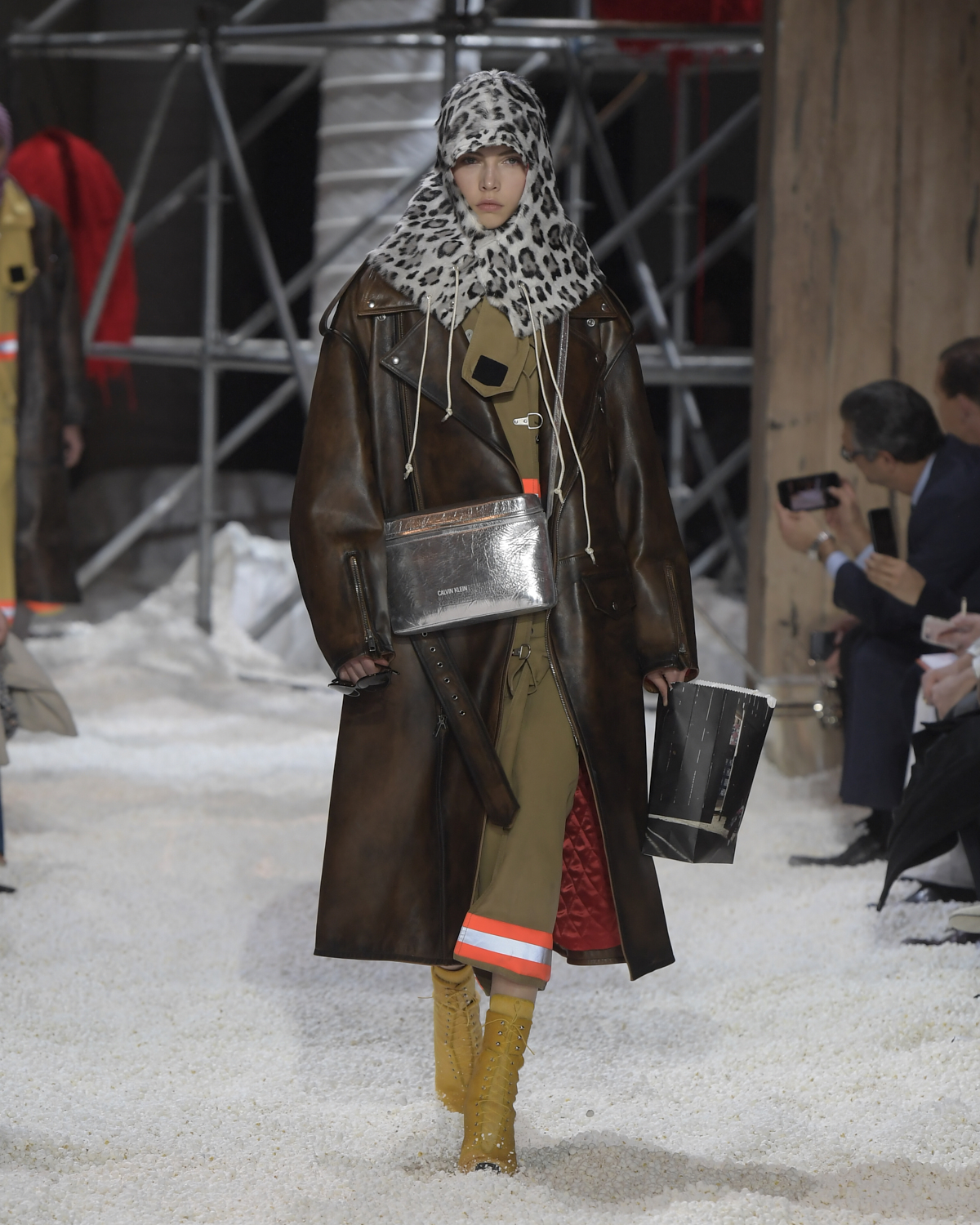 Titled LANDSCAPES, the Fall 2018 CALVIN KLEIN 205W39NYC show was staged in an epic and unreal terrain simultaneously recalling a cinematic soundstage. The backdrop draws on CALVIN KLEIN’S recent history, but reconfigured: fragments of Sterling Ruby’s installations for the brand appeared against parts of the nineteenth century prairie barn featured in the CALVIN KLEIN 205W39NYC Spring 2018 campaign; the barn walls are papered with billboard-scale images of the artworks by Andy Warhol used in the same collection; beside them, air-duct tubing emerges, an alien touch of the scientific or laboratorial. The floor is carpeted with deep drifts of popcorn: from a distance, it resembles snow.
