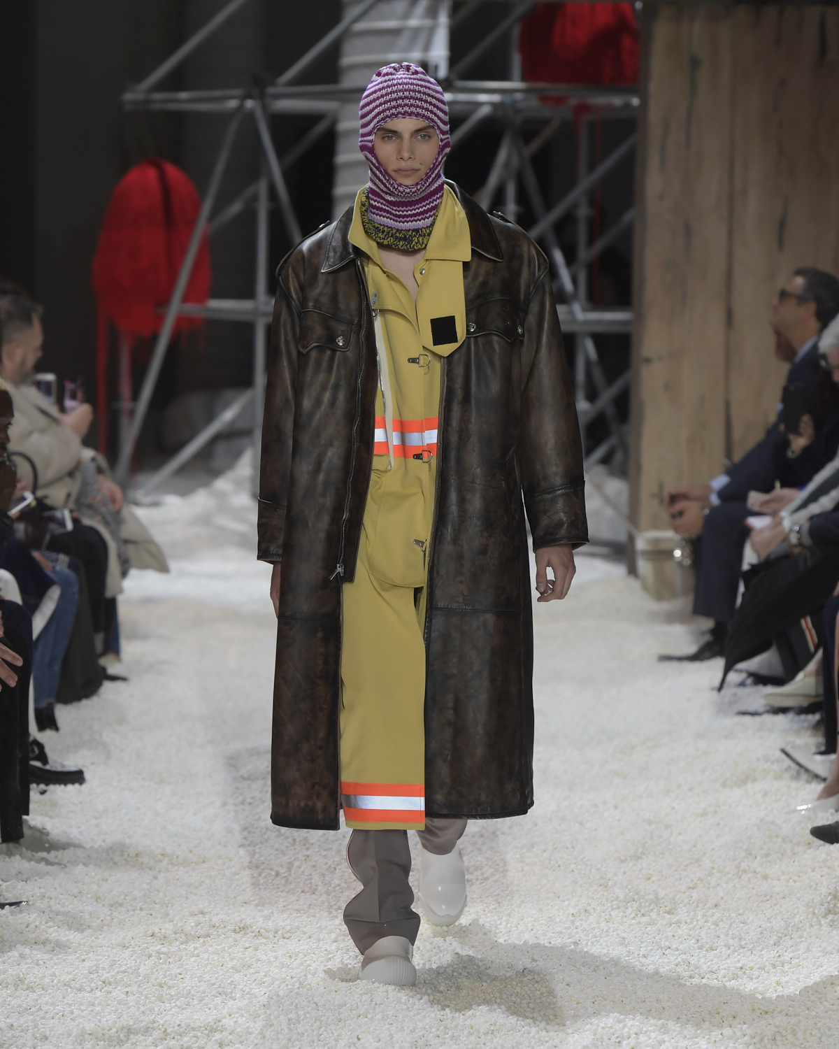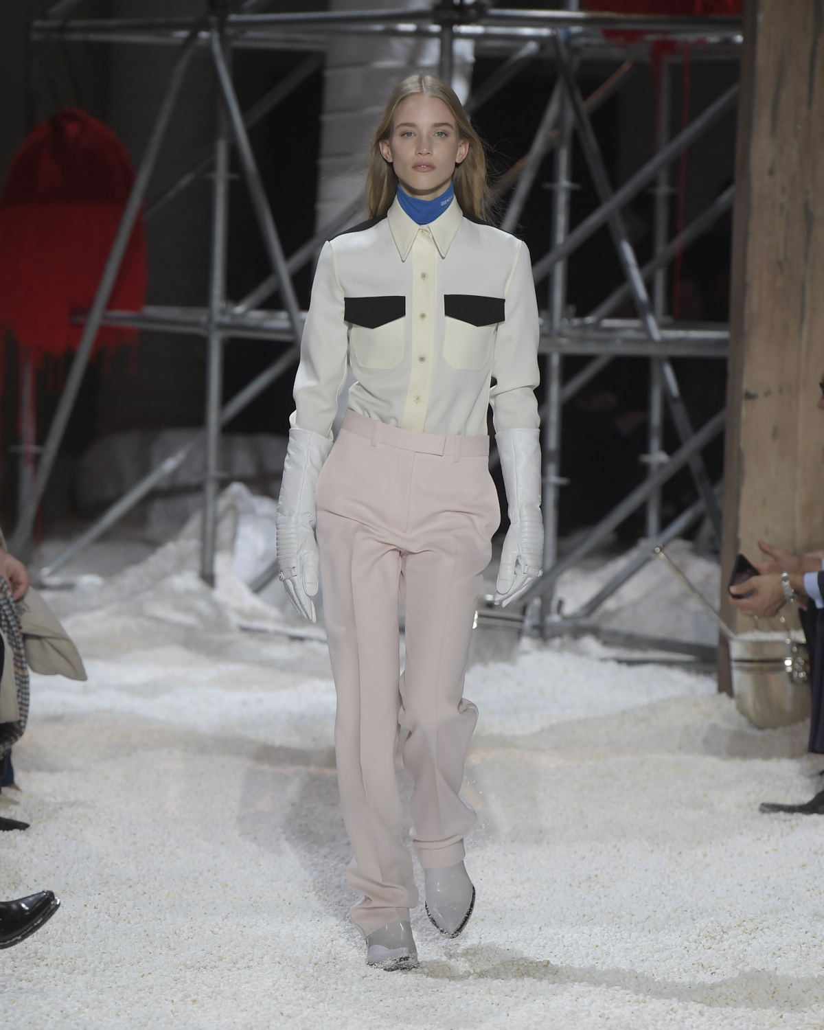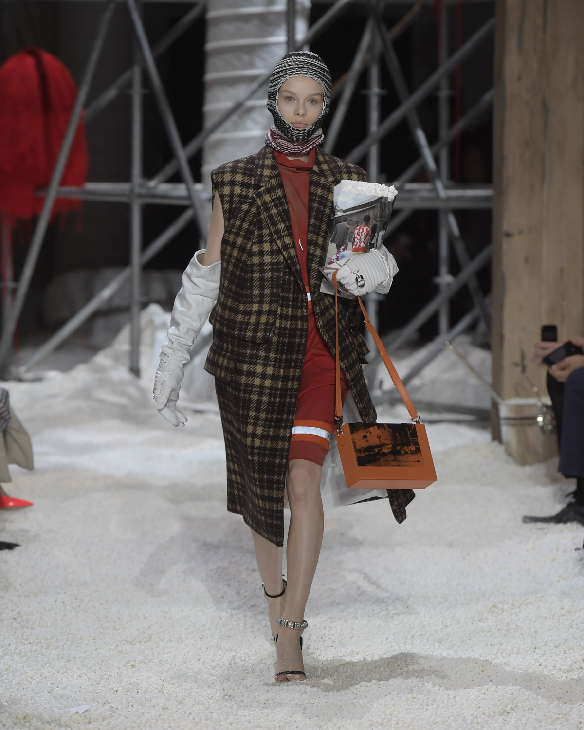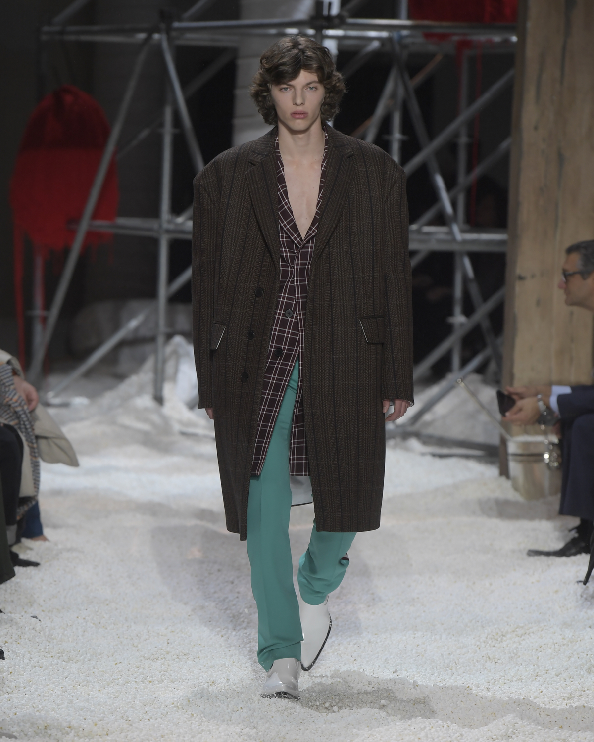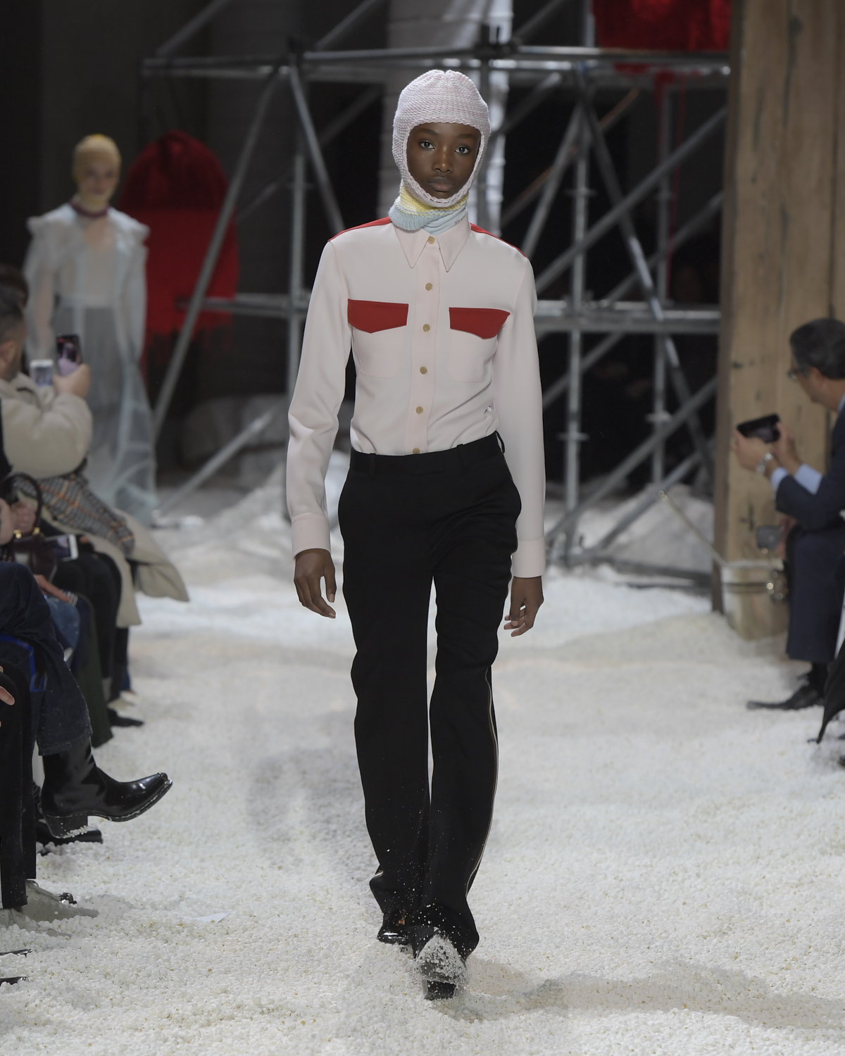 Titled LANDSCAPES, the Fall 2018 CALVIN KLEIN 205W39NYC show was staged in an epic and unreal terrain simultaneously recalling a cinematic soundstage. The backdrop draws on CALVIN KLEIN’S recent history, but reconfigured: fragments of Sterling Ruby’s installations for the brand appeared against parts of the nineteenth century prairie barn featured in the CALVIN KLEIN 205W39NYC Spring 2018 campaign; the barn walls are papered with billboard-scale images of the artworks by Andy Warhol used in the same collection; beside them, air-duct tubing emerges, an alien touch of the scientific or laboratorial. The floor is carpeted with deep drifts of popcorn: from a distance, it resembles snow.