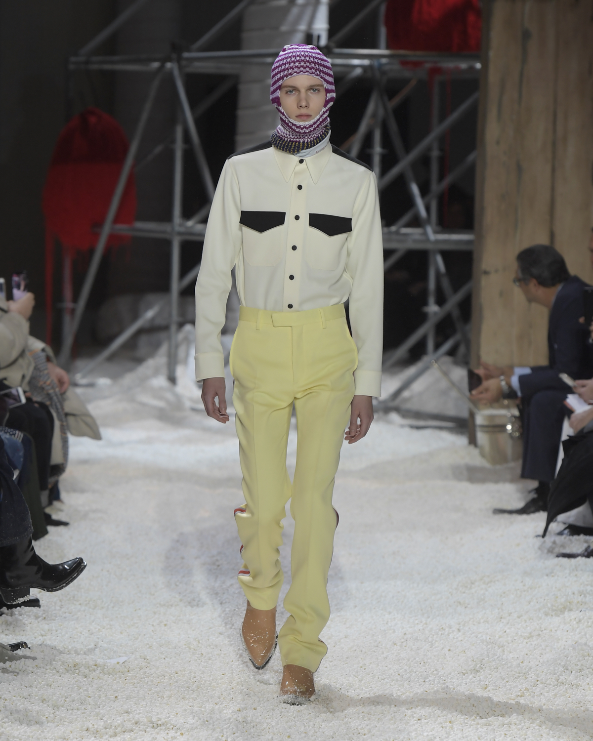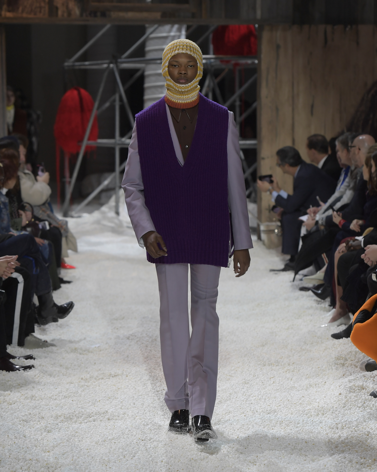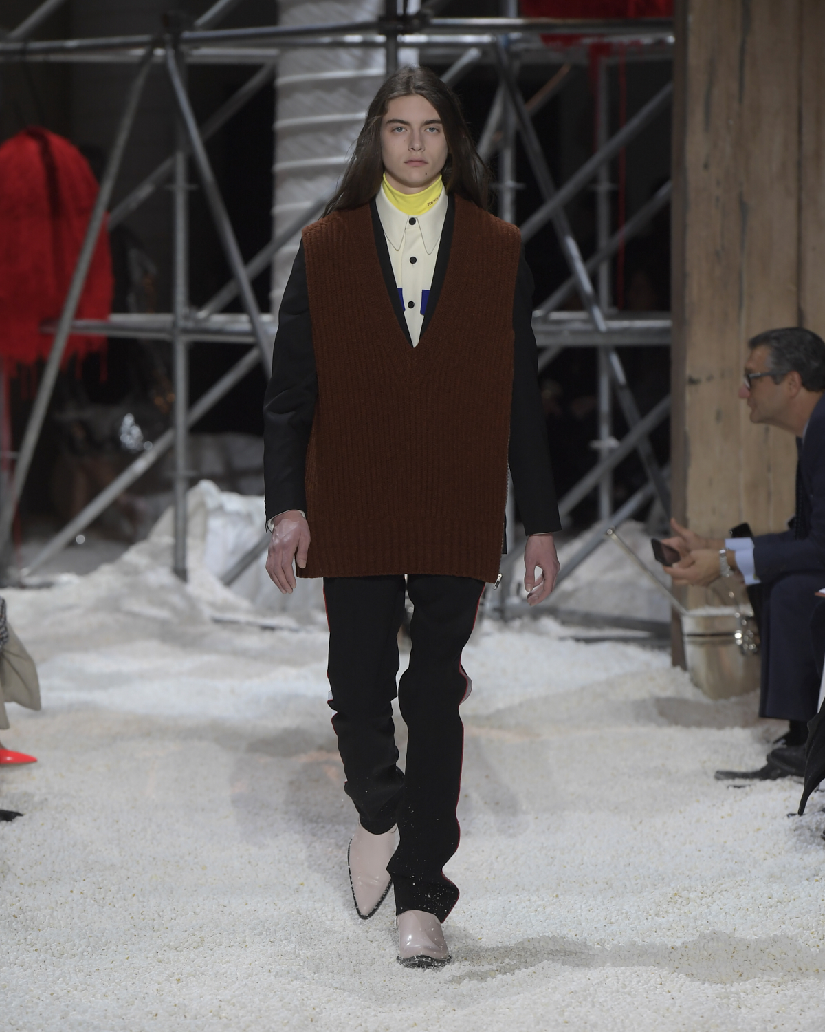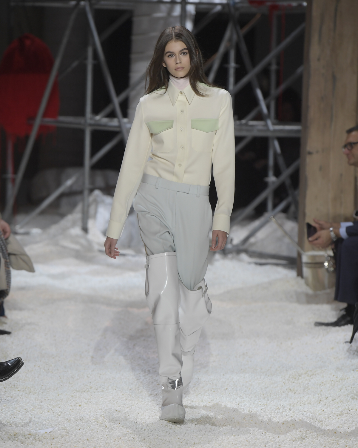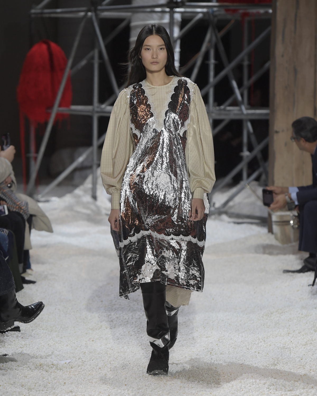 Titled LANDSCAPES, the Fall 2018 CALVIN KLEIN 205W39NYC show was staged in an epic and unreal terrain simultaneously recalling a cinematic soundstage. The backdrop draws on CALVIN KLEIN’S recent history, but reconfigured: fragments of Sterling Ruby’s installations for the brand appeared against parts of the nineteenth century prairie barn featured in the CALVIN KLEIN 205W39NYC Spring 2018 campaign; the barn walls are papered with billboard-scale images of the artworks by Andy Warhol used in the same collection; beside them, air-duct tubing emerges, an alien touch of the scientific or laboratorial. The floor is carpeted with deep drifts of popcorn: from a distance, it resembles snow.